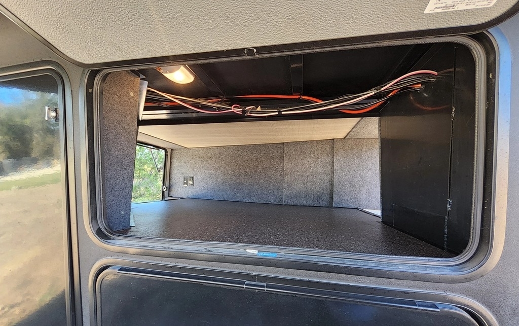 Exterior: There are no miles put on this RV by us at all. The tires are 80%+. The unit is clean. Aside from one small scratch, there is no damage anywhere on the exterior and all lights work. This has auto-leveling hydraulic lifts and works at the touch of a button either outside or in. The tanks have been pumped and cleaned (which they weren't when we bought it), and we are including all of the sewer hookup items. We are also including a cell phone booster antenna which can be mounted anywhere with included U hooks. There are 6 slide outs on this unit, and the right side rear slide out has a built in sink and an outside fridge + cabinet storage. There is an electric awning covering both doors across the right side. There is a lot of exterior storage between 3 compartments in addition and outside hot/cold water spray hose on left side. There are multiple outlets on the exterior as well.