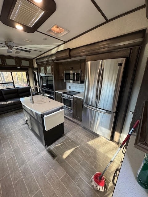 This 2020 Keystone Montana High Country 385BR Fifth Wheel is a spacious, well-maintained luxury RV designed for comfort and extended stays. Measuring approximately 42 feet, it features four slide-outs with auto-leveling for easy setup and comfortably sleeps 8 to 10 people. The floorplan includes a king-size bed in a slide-out, a full-size residential refrigerator, and generous living and sleeping space throughout. The unit is equipped with slide covers on all slides, installed in March 2023, along with a new awning motor and new slide covers, reflecting recent updates and proper care. A non-smoking unit in very good condition, this Montana High Country is ideal for families or full-time RVers looking for space, convenience, and quality.