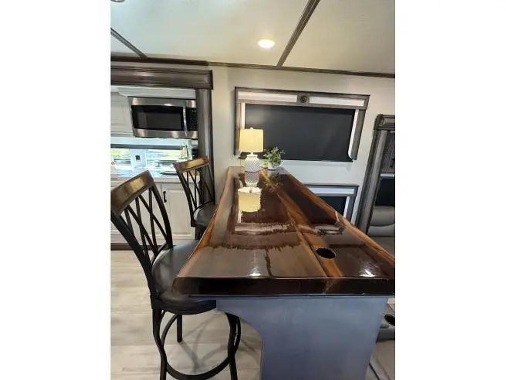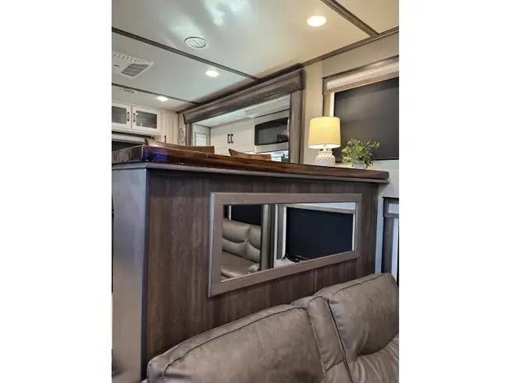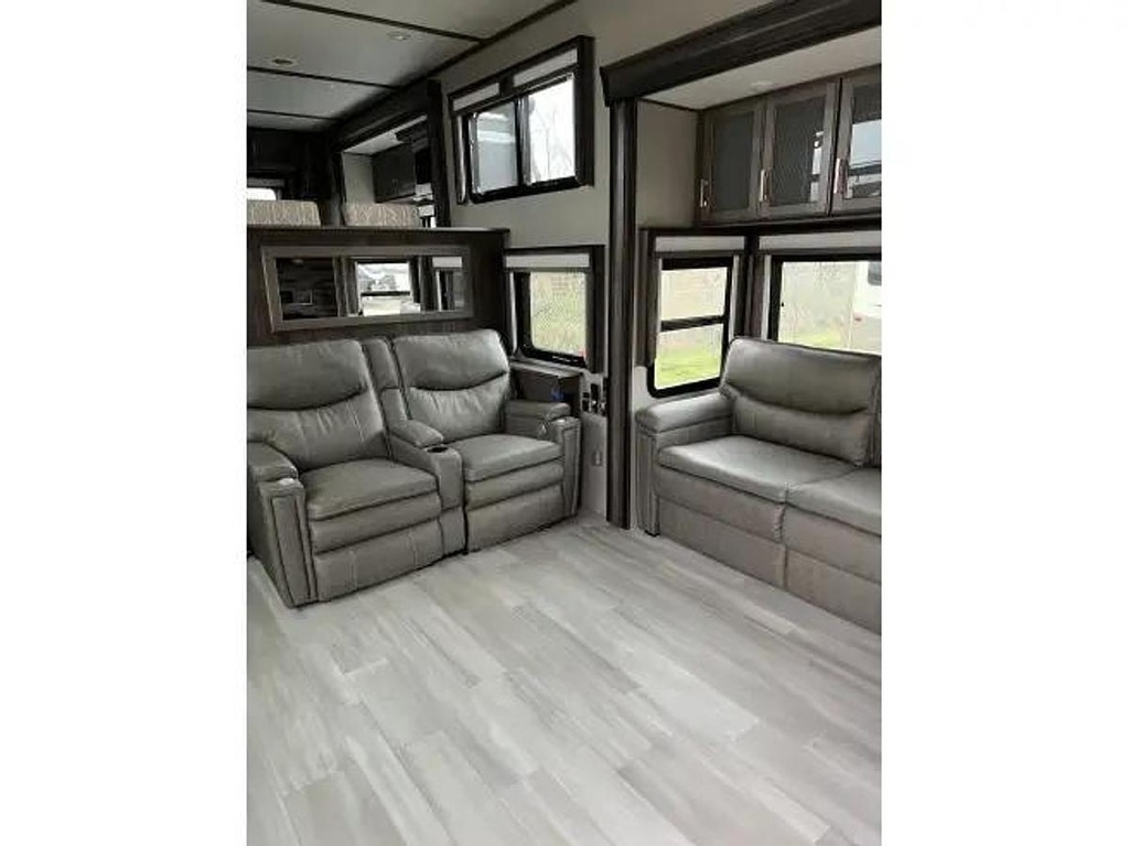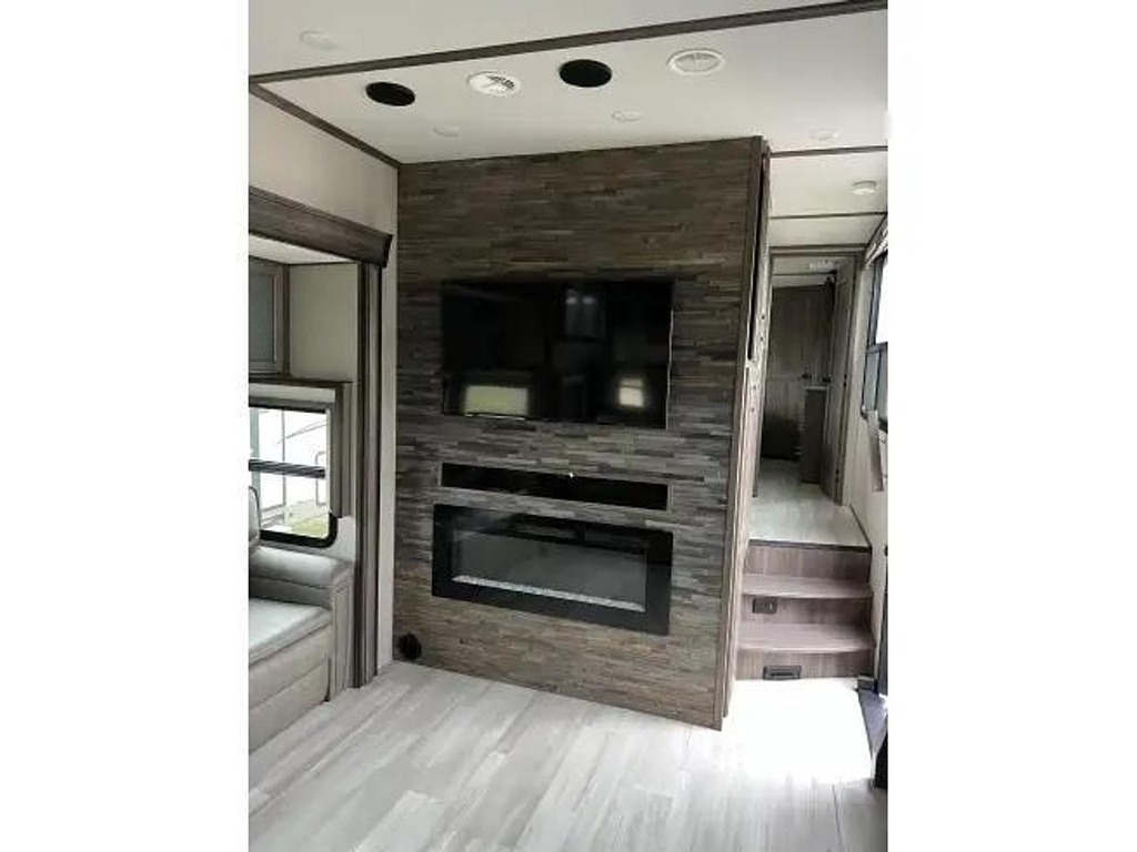 The 390RK-R floor plan offers a spacious and well-appointed interior, featuring a rear kitchen layout that is perfect for those who love to cook while on the road. The living area is stylish and comfortable, with plush seating and modern amenities throughout. The bedroom is a retreat in itself, with a king-sized bed and plenty of storage space for all of your belongings.