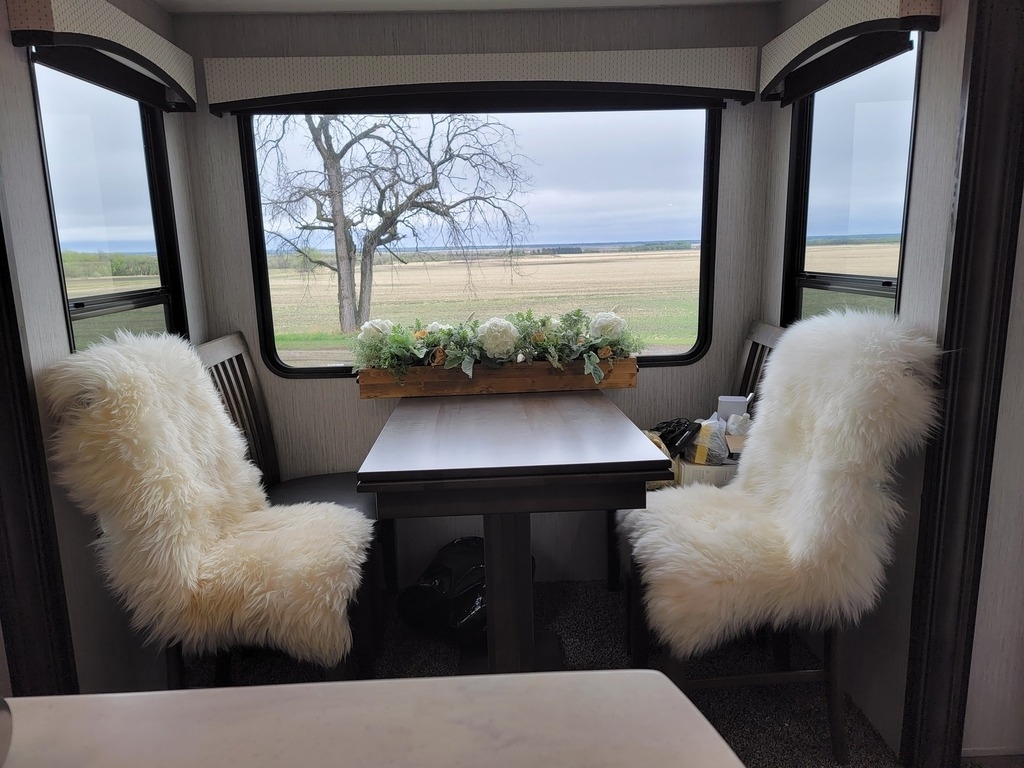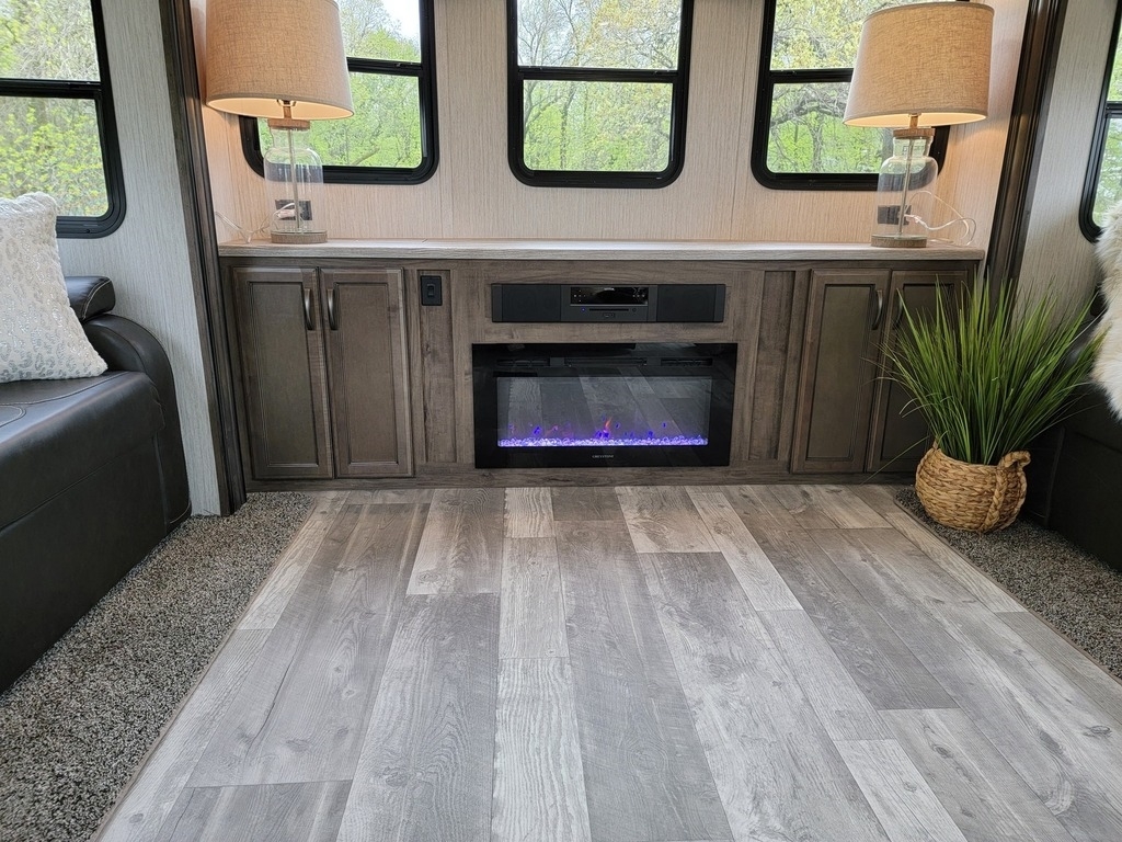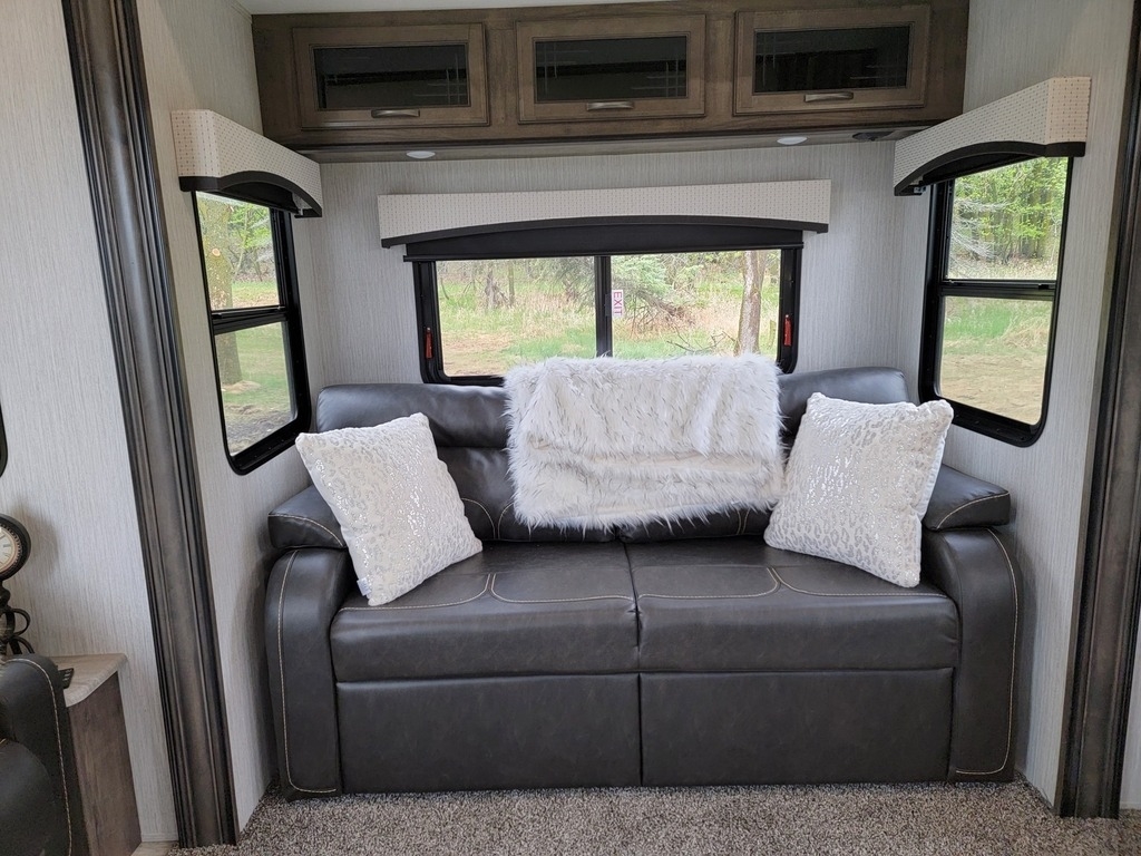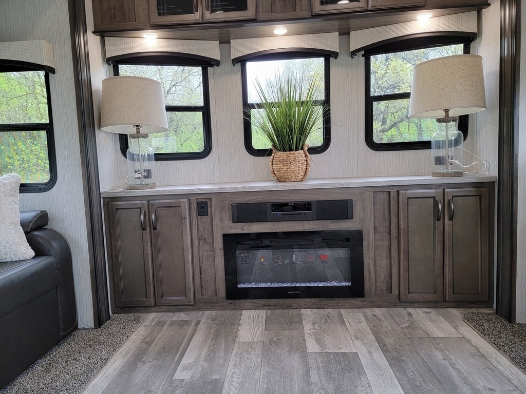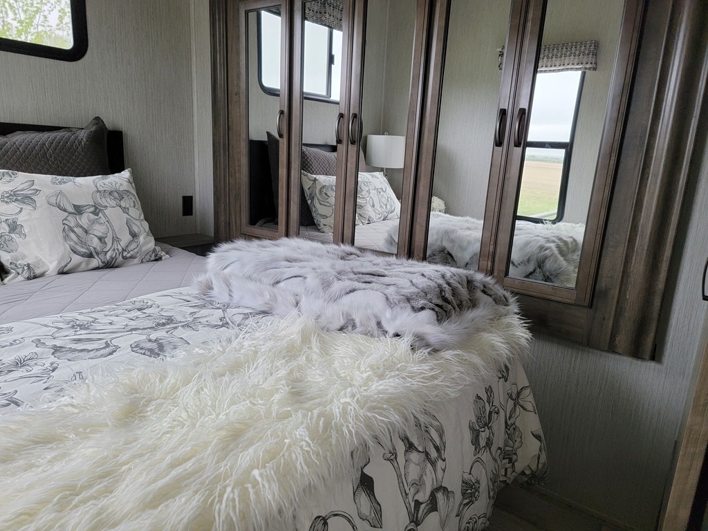 This 2021 Forest River Sierra Destination 420FL Park Model is a spacious and luxurious travel trailer designed for extended stays and comfortable living. The stylish, modern 420FL floorplan features a large front living room with two comfortable foldout sofas, two recliners, and a cozy fireplace, creating a warm and inviting space. The kitchen is equipped with high-end, residential-sized appliances, a center island, and dual countertops for added workspace and functionality. The bedroom includes a queen-sized bed and a wardrobe closet prepped for a stackable washer and dryer, while a central vacuum system and abundant storage enhance everyday convenience. The private bathroom offers a shower and separate toilet, and the unit is shaded by a 21-foot awning for outdoor comfort. This trailer has been completely covered during winter months to protect the exterior and has been kept in pristine condition inside and out. Buyer must relocate the camper.