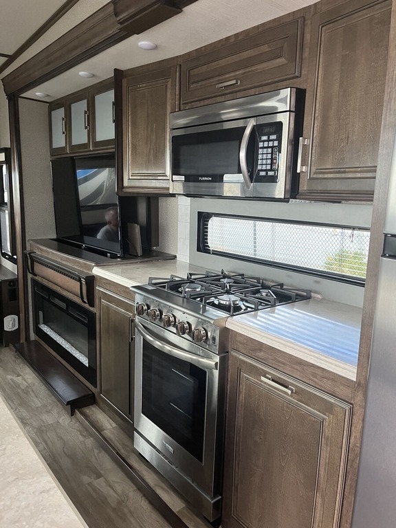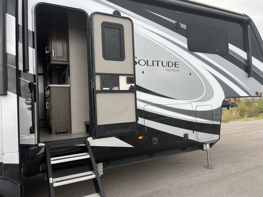 The 2021 Grand Design Solitude 310GK-R is a luxury fifth wheel designed to deliver a true residential living experience on the road, combining high-end finishes with thoughtful functionality and modern comfort. The spacious interior is beautifully designed with premium materials and an open floor plan that creates a welcoming and relaxing atmosphere. The living area is ideal for both entertaining and unwinding, featuring plush seating, a fireplace, and a large television for added comfort. The kitchen is fully equipped with modern appliances, ample cabinetry, and a large center island, making meal preparation convenient and enjoyable. The bedroom offers a comfortable king-sized bed along with abundant storage and a private bathroom that includes a spacious shower. Additional features such as washer and dryer hookups make this unit well-suited for extended travel or full-time living. Exterior highlights include a large power awning for outdoor relaxation, generous storage compartments, and durable construction built for long-term use. Notable upgrades include a full 360 custom paint job that was recently waxed, awning covers to protect slide-outs and maintain functionality, a fully functional slide-out storage tray in the pass-through compartment, and new tires. This Solitude is a premium fifth wheel that delivers both luxury and practicality for serious RV travelers. Located in Mapleton, UT 84664 For more information, please call 833-265-6113 and mention ID 68101884