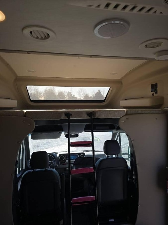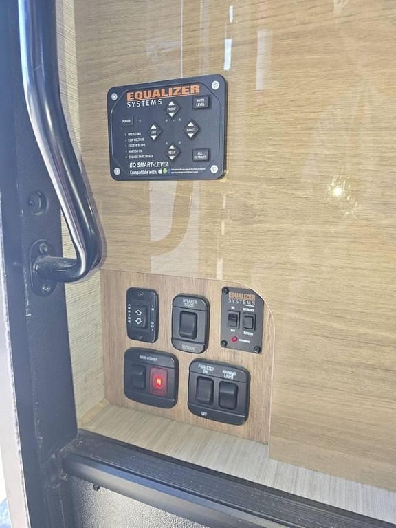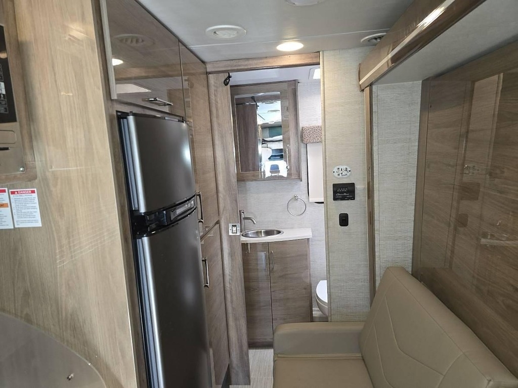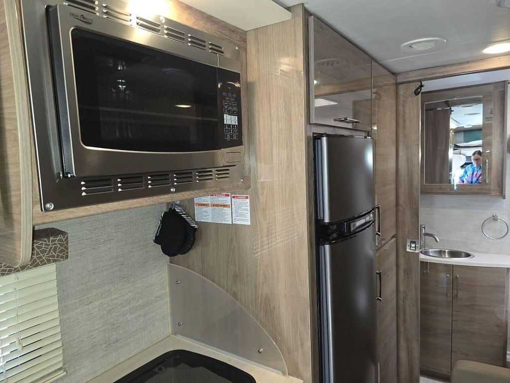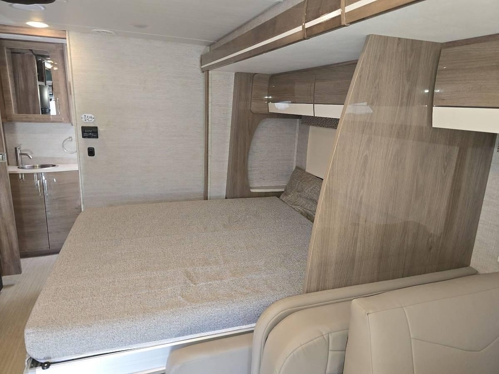 - Interior & Kitchen: Queen Murphy bed, sleeping area above the cockpit, light maple cabinets, top-to-bottom fridge, convection oven/microwave, and cooktop.