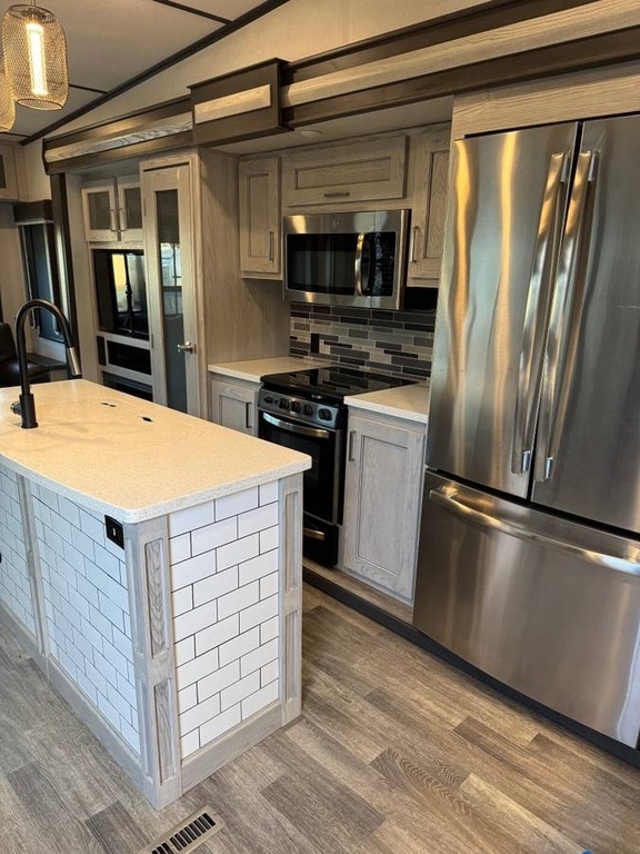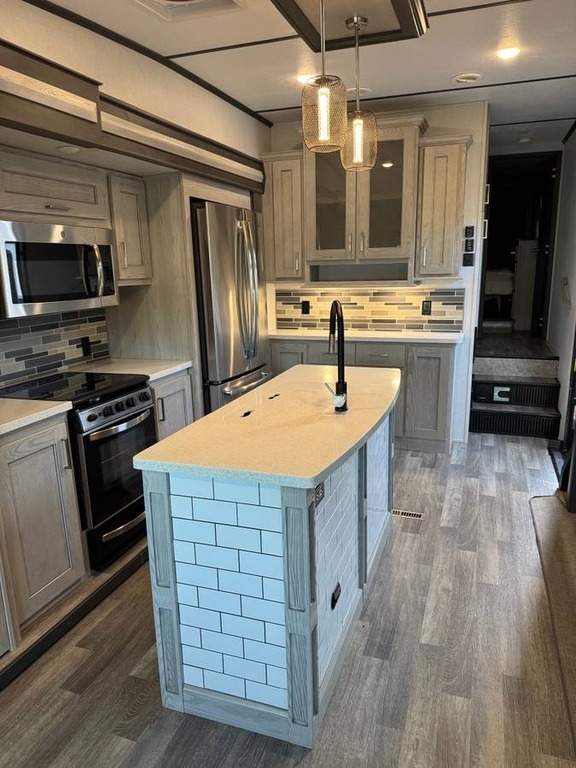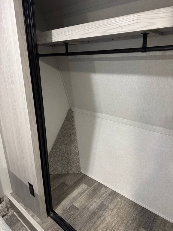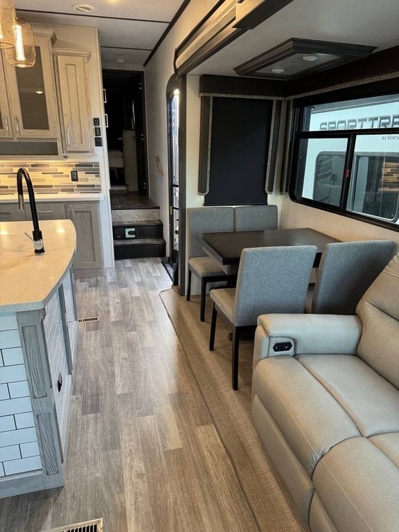 Outside, this Montana High Country is equipped with two large awnings, exterior speakers, TV hookups, and a massive pass-through storage compartment with extra outlets and inverter. A rear ladder provides roof access, where you’ll find an automatic 360-degree TV antenna. The unit is also pre-wired for solar for easy off-grid upgrades.