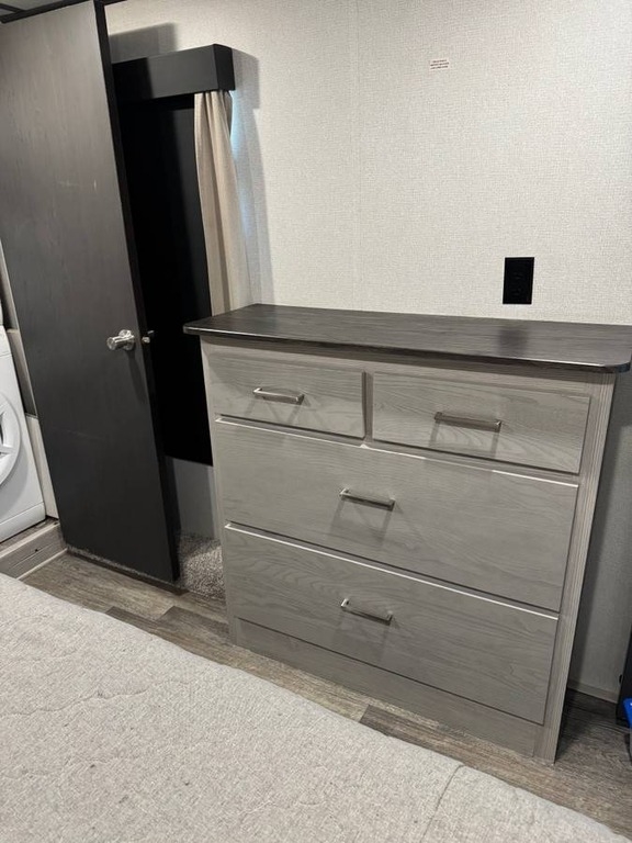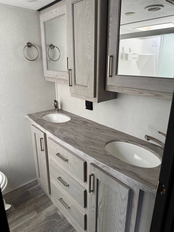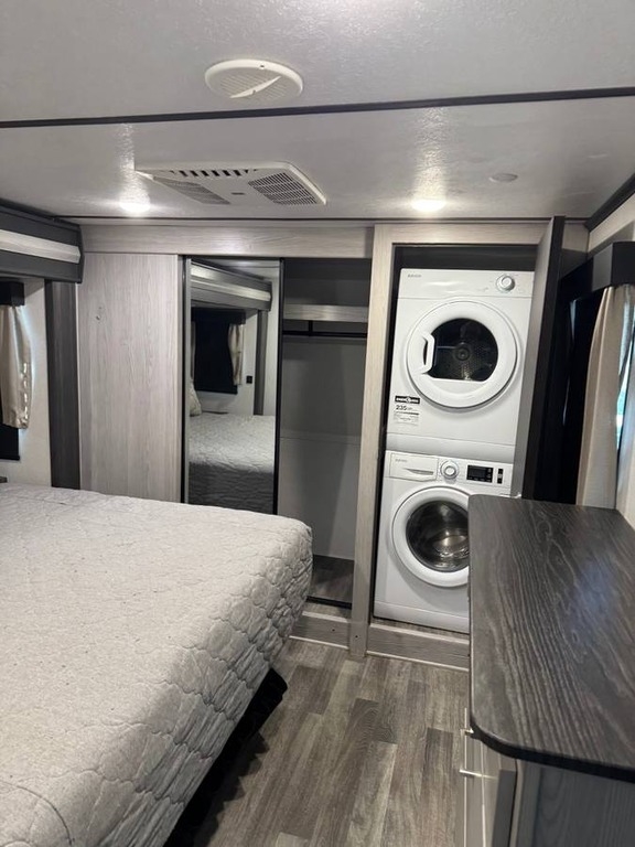 The front bedroom offers exceptional comfort with a third slide-out, king-size bed, its own un-ducted A/C unit with thermostat, blackout shades, large wardrobe closet, stacked washer and dryer, four-drawer dresser, and TV hookups. The private bathroom includes a spacious shower with wand, skylight, and seat, double-sink vanity with mirrored medicine cabinets, a three-door linen closet, high-profile ceramic toilet, and exhaust fan.