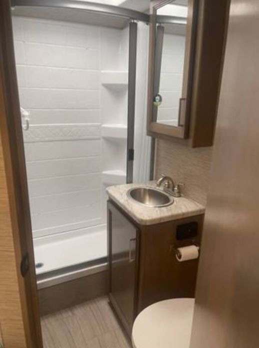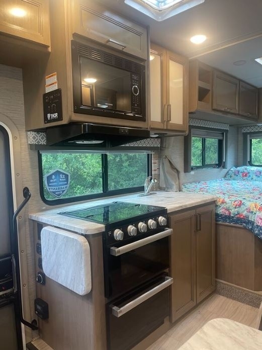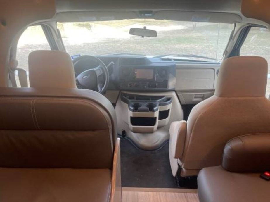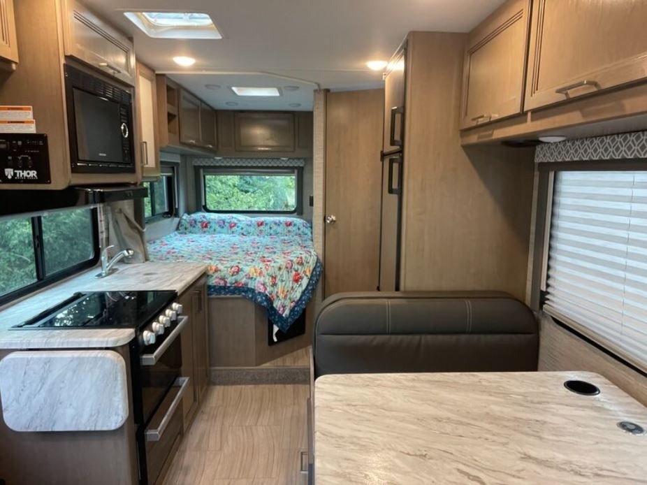 This 2022 Thor Motor Coach Coleman 23CM is a lightly used, non-smoking and pet-free Class C motorhome in excellent condition, powered by a Ford Godzilla E350 V8 engine capable of towing up to 8,500 lbs and equipped with an Onan generator. Constructed with fiberglass and used only twice, it shows no damage inside or out, with all vehicle maintenance up to date (warranty not included). The dining area includes a 3-burner gas stove with cooktop cover, oven, microwave, refrigerator/freezer, and kitchen sink. Living comforts feature A/C, central heat, a full bathroom, queen bed, cab-over bed, dinette sleeper, vinyl flooring, skylights, interior lighting, stereo system, TV, Bluetooth, and plenty of storage, allowing the unit to comfortably sleep up to 6. Exterior highlights include a lighted awning, porch light, propane tank (40 lbs), entry assist handle, wheel covers, and a 110 exterior outlet. Safety features include a backup camera, CO2 and smoke detectors, LPG leak detector, and emergency exit. With modern mechanical systems like city water hookup, electrical panel, batteries, chargers, and a hitch, this Coleman 23CM is fully equipped and road-ready for your next adventure.