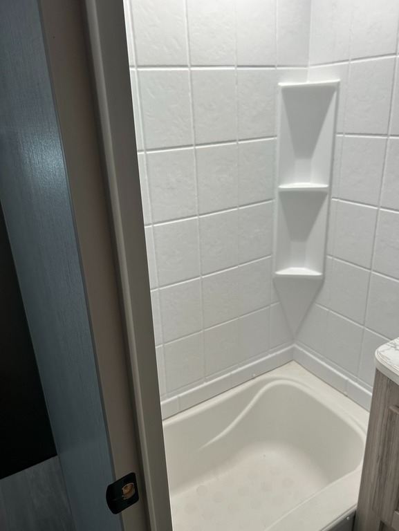 At 32 feet in length, this unit offers a full bunk room in the rear, a king-size bed in the front bedroom, and a bathroom with a full tub. The spacious layout comfortably sleeps up to nine people, making it ideal for families or extended trips. The interior features neutral beige and gray tones, with a mounted TV, an electric slide-out, and modern ducted wall air distribution (no floor vents).