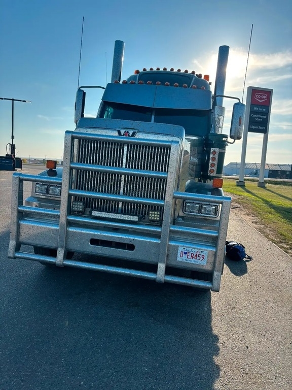 Heavy-spec 4900SF with 14,000 lb steer / 46,000 lb rears, powered by a DD16 600 HP matched to an 18-speed with 4.11 gears. Shows 523,863 km (increasing daily as it’s still working). Backed by warranty on engine and major components to Sept 2026 or 988,000 km. Equipped with a raised-roof sleeper, headache rack, and comes fully rigged—three sets of drive tires, two sets of steer tires, plus chains, straps, and corner protectors. Also includes a 4.5 T&E fluid pump. Clean, hard-working Western Star, spec’d to haul and ready to go.
