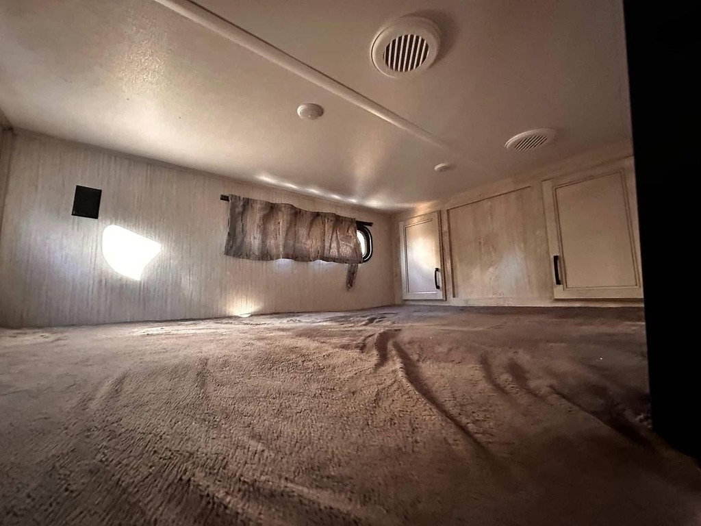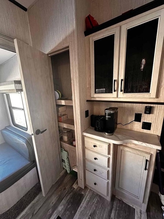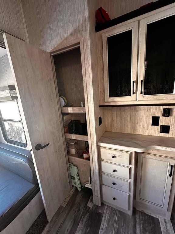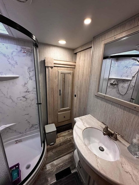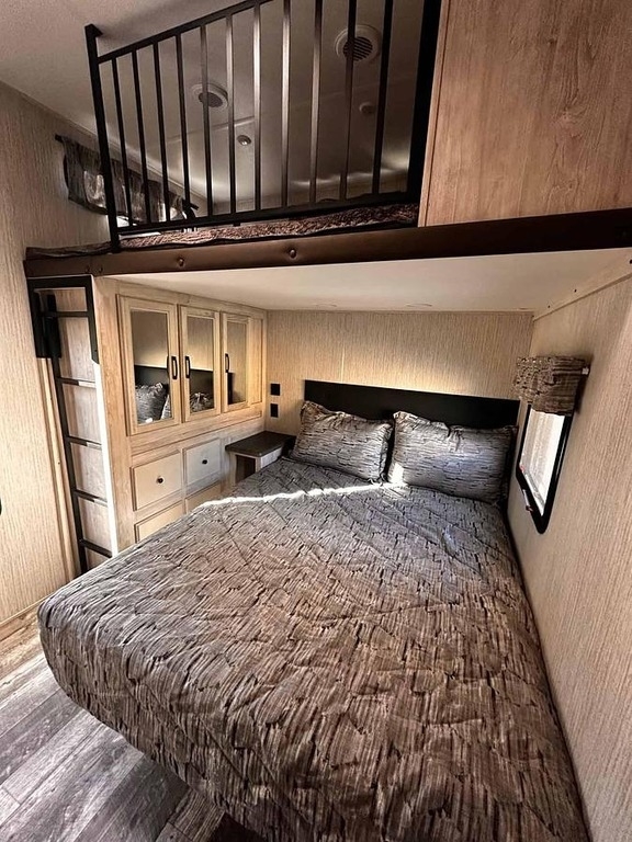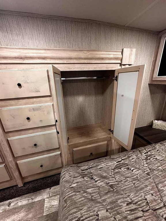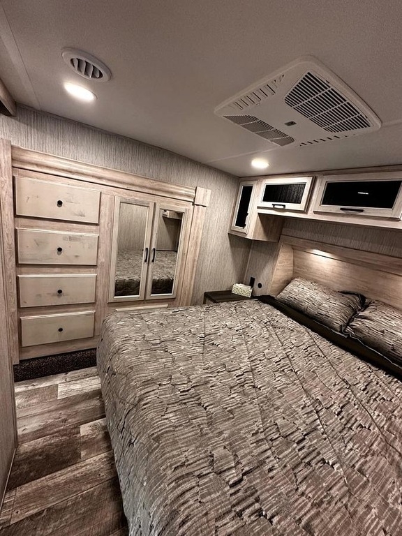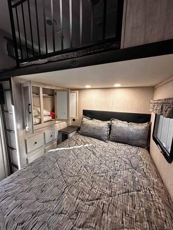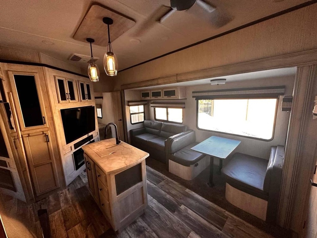 This 2022 Forest River Sierra 3440 BH fifth wheel has been exceptionally well cared for and always stored indoors when not in use. Designed with space and comfort in mind, this family-friendly bunkhouse layout offers a spacious open-concept living and kitchen area featuring a large television mounted above an electric fireplace, along with an island sink and counter that keeps everyone connected during meal prep and cleanup. The master suite includes dual nightstands, a large overhead cabinet, and a slide-out wardrobe with a clothes rack and five drawers, providing excellent storage and direct access to the main bathroom. A dedicated linen cabinet and oversized drawers help keep everything organized while traveling or camping.