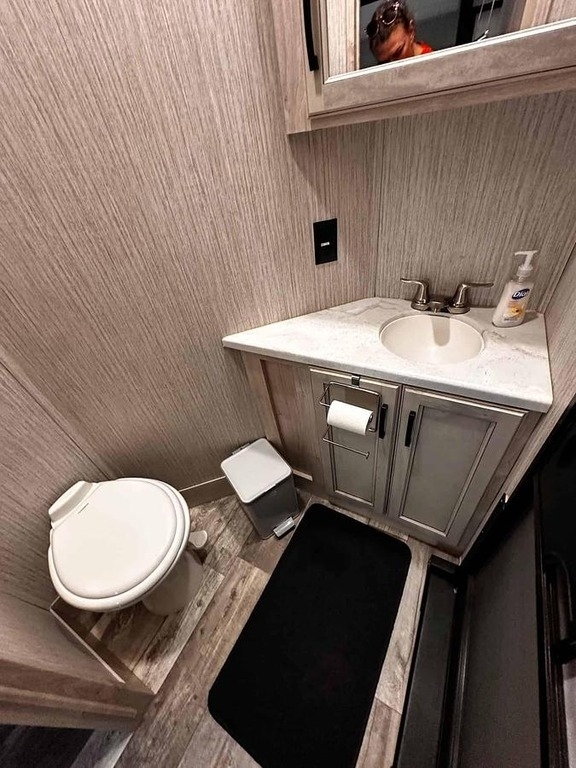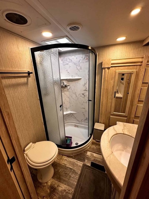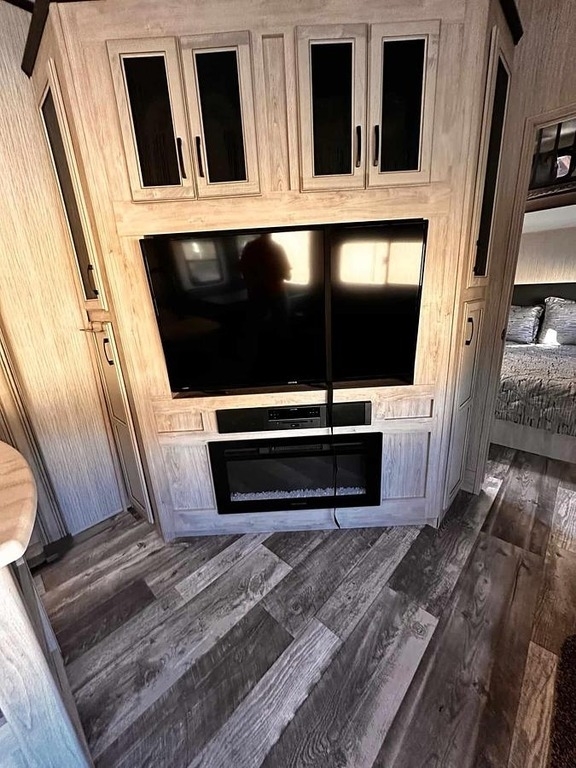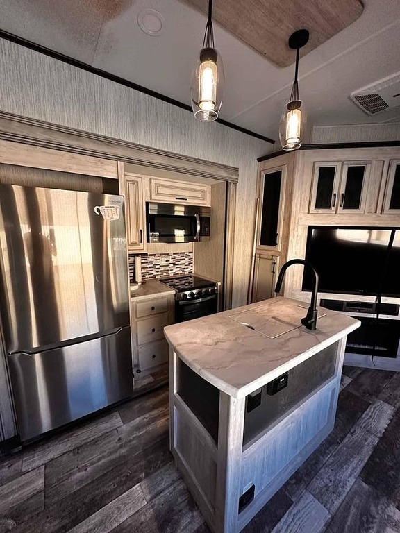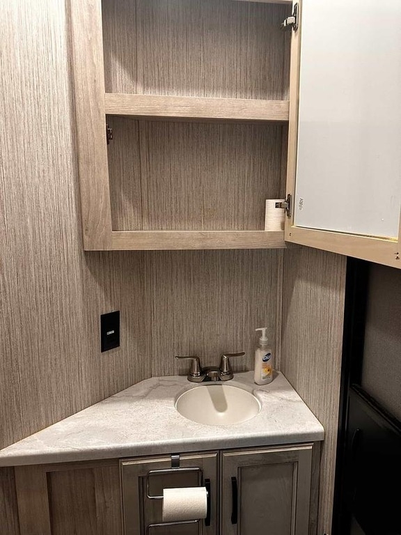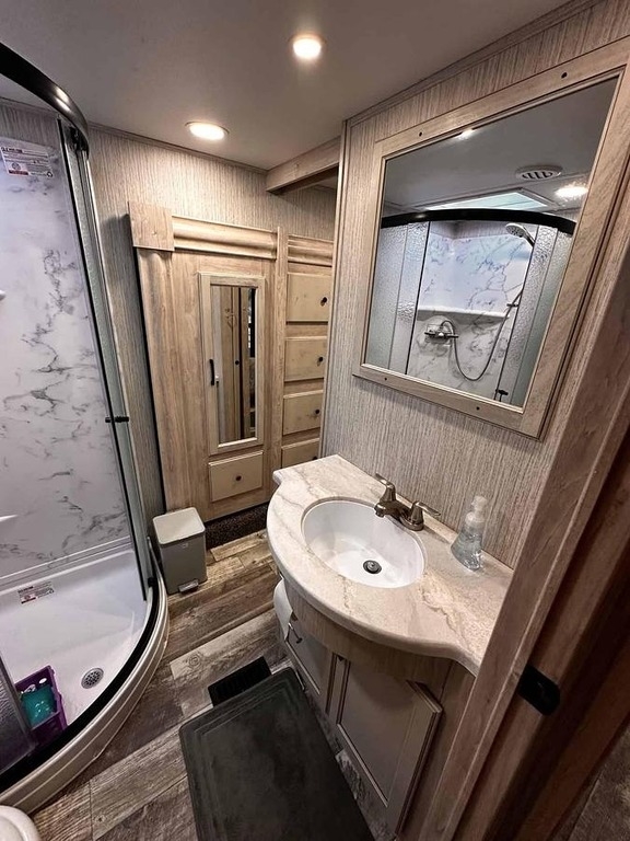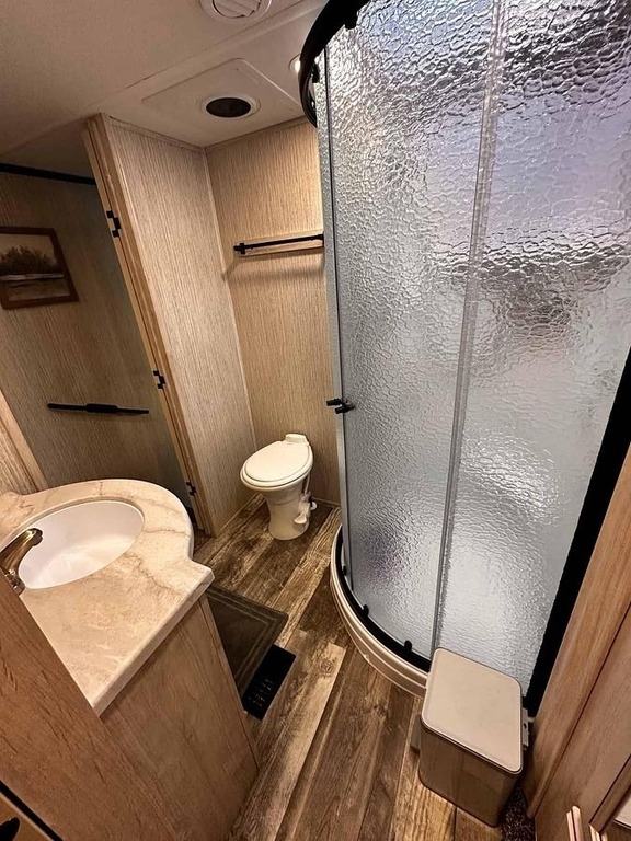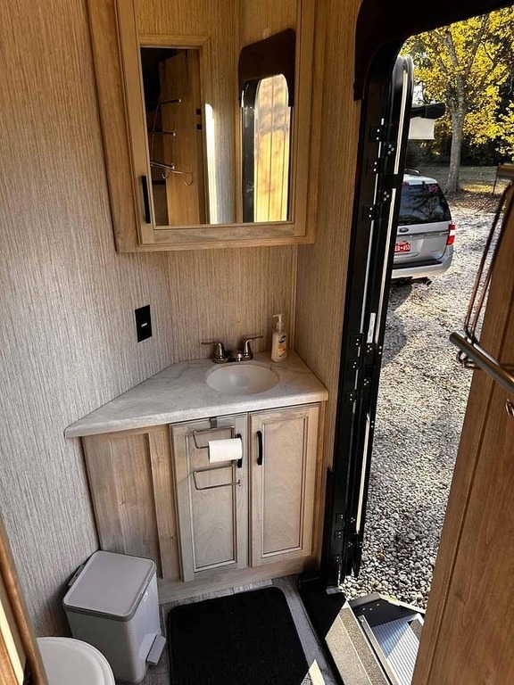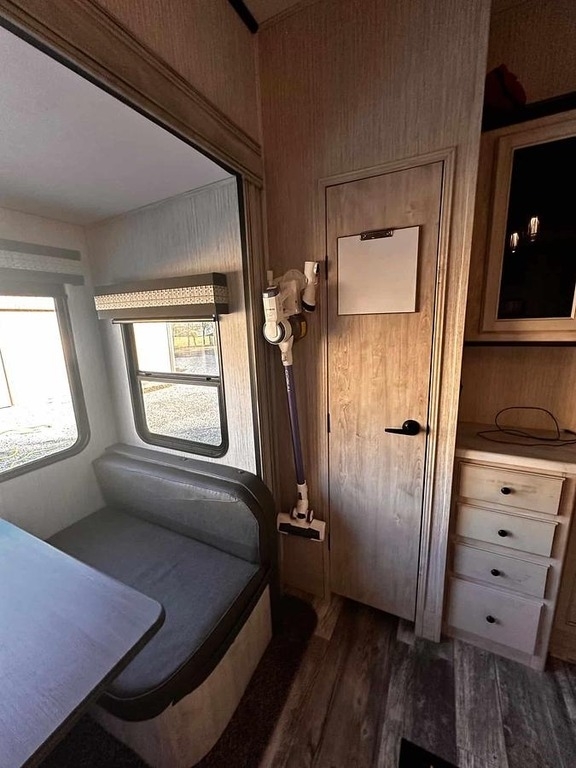 This 2022 Forest River Sierra 3440 BH fifth wheel has been exceptionally well cared for and always stored indoors when not in use. Designed with space and comfort in mind, this family-friendly bunkhouse layout offers a spacious open-concept living and kitchen area featuring a large television mounted above an electric fireplace, along with an island sink and counter that keeps everyone connected during meal prep and cleanup. The master suite includes dual nightstands, a large overhead cabinet, and a slide-out wardrobe with a clothes rack and five drawers, providing excellent storage and direct access to the main bathroom. A dedicated linen cabinet and oversized drawers help keep everything organized while traveling or camping.