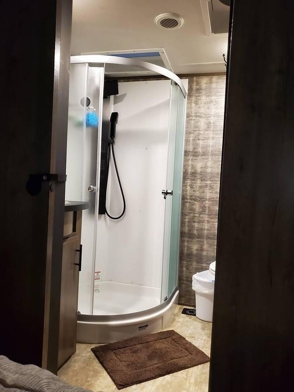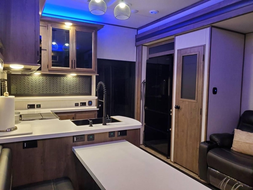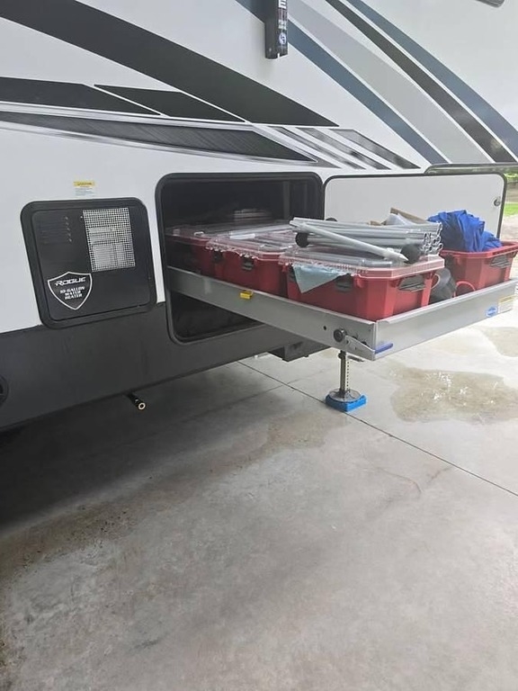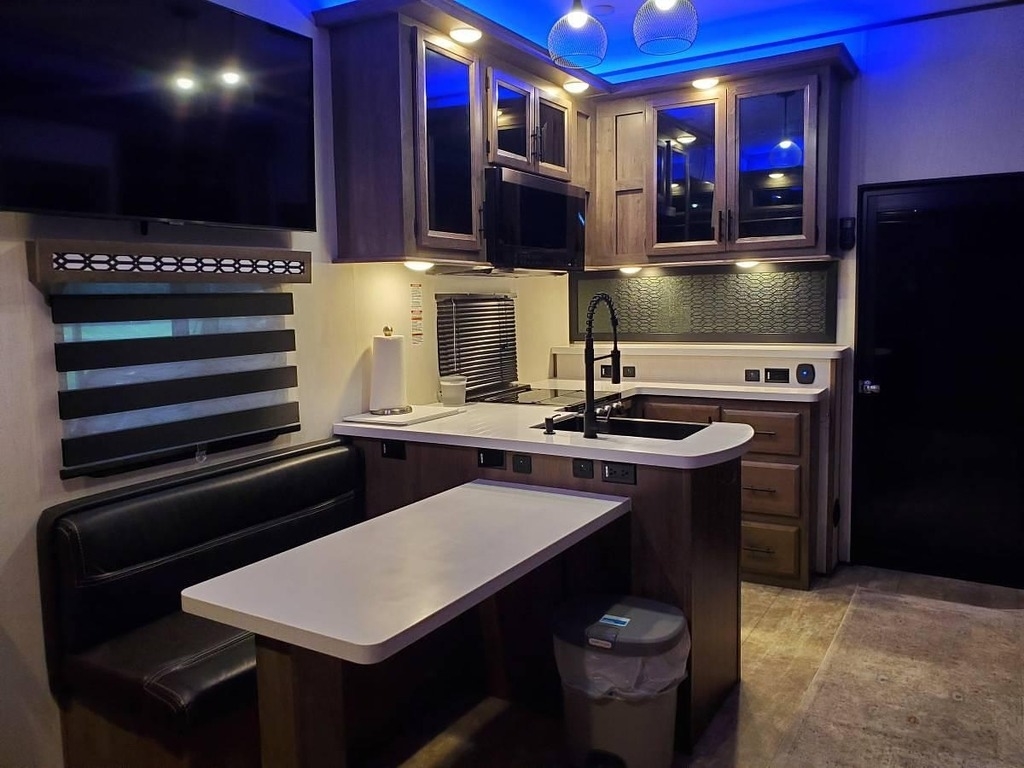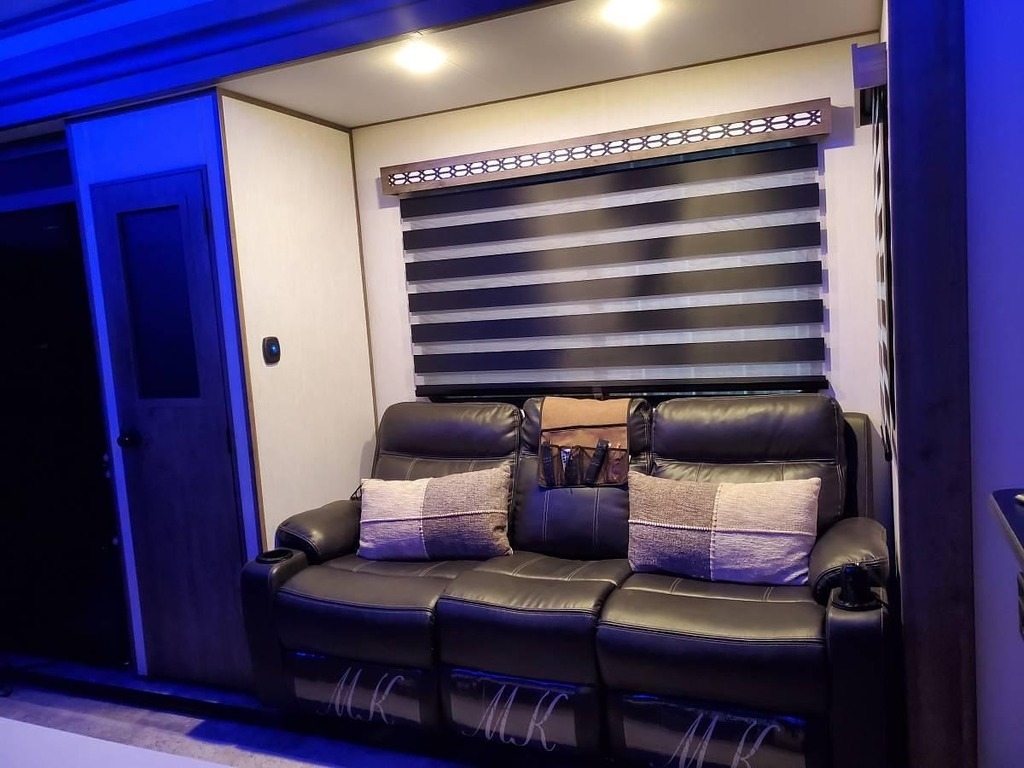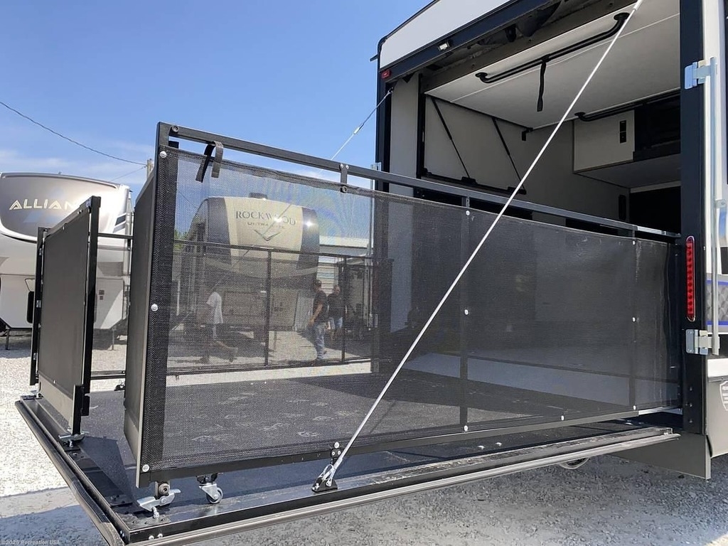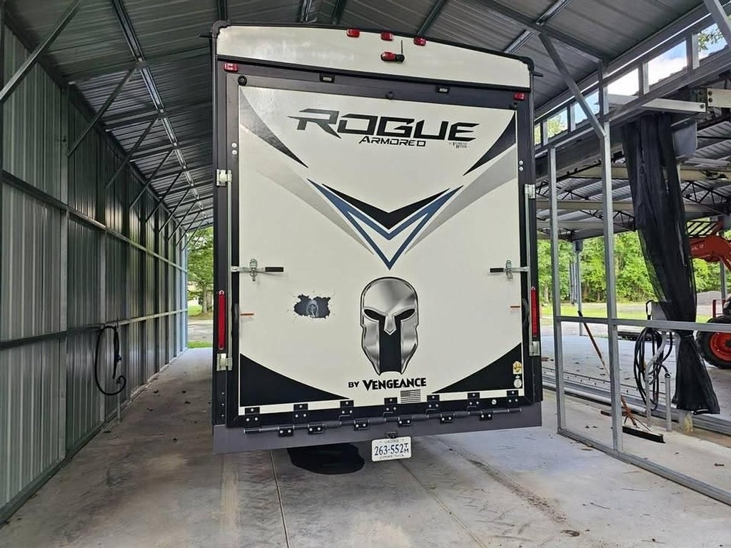 RV Toy Hauler, 43 ft. of luxury. Barely used 2022 Forest River Vengeance Rogue Armored 371A13. It's better than others because it comes with everything you need to start camping today. It has many upgrades and accessories including automatic leveling and stabilizing and solar charging. Comfortably sleeps 7 with an adjustable king-size bed in the master with reading lights. It has 1.5 baths along with 3-season screens and glass in the back and an outdoor back porch. Blue mood lighting indoors and out and two awnings add to the comfort and style. It has been kept under cover since new. There are too many upgrades to list but here are a few: rear and side cameras, Max Air auto vents, full-size fridge, full-size microwave, lots of storage, Samsung TV, pull-out cargo roller tray in cargo hold, two underbody larger sewage hose storage compartments, outdoor propane gas hook-up, Pit-Boss grill and table included. Additional features include an electric fireplace with color-changing technology, onboard generator, telescoping extension ladder, laundry hook-up, keypad door locks, and an outdoor refrigerator. The rear black tank has only been used with water. Title in hand. Clean as a whistle. To the right buyer the seller may include the 2022 B&W fifth wheel hitch (gooseneck mount type). A must see toy hauler ready for its next owner.