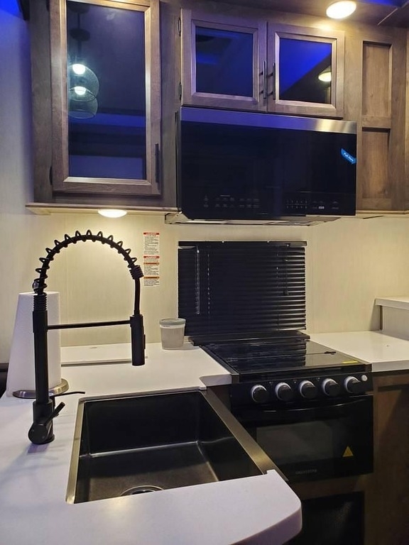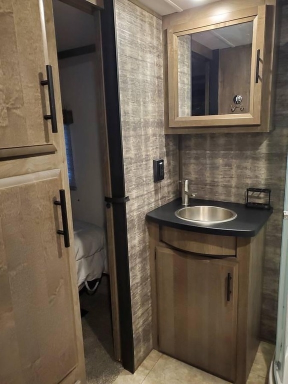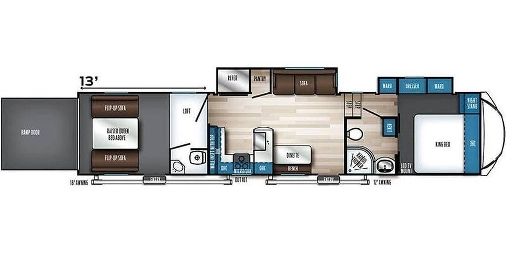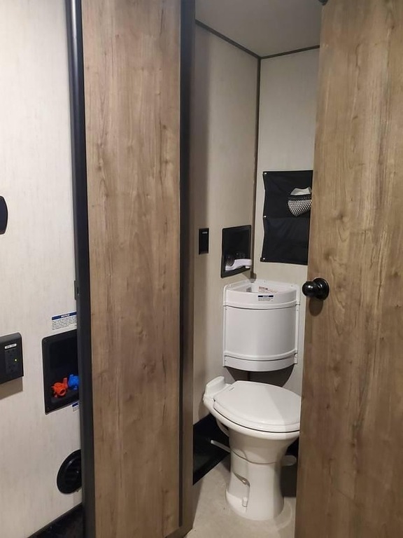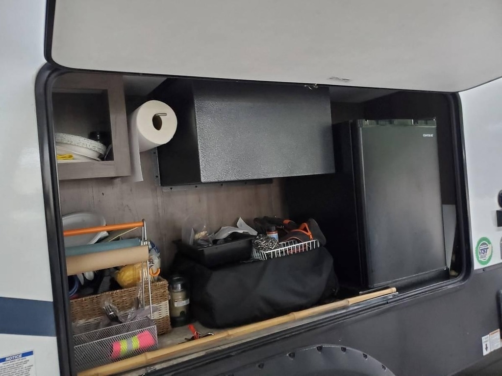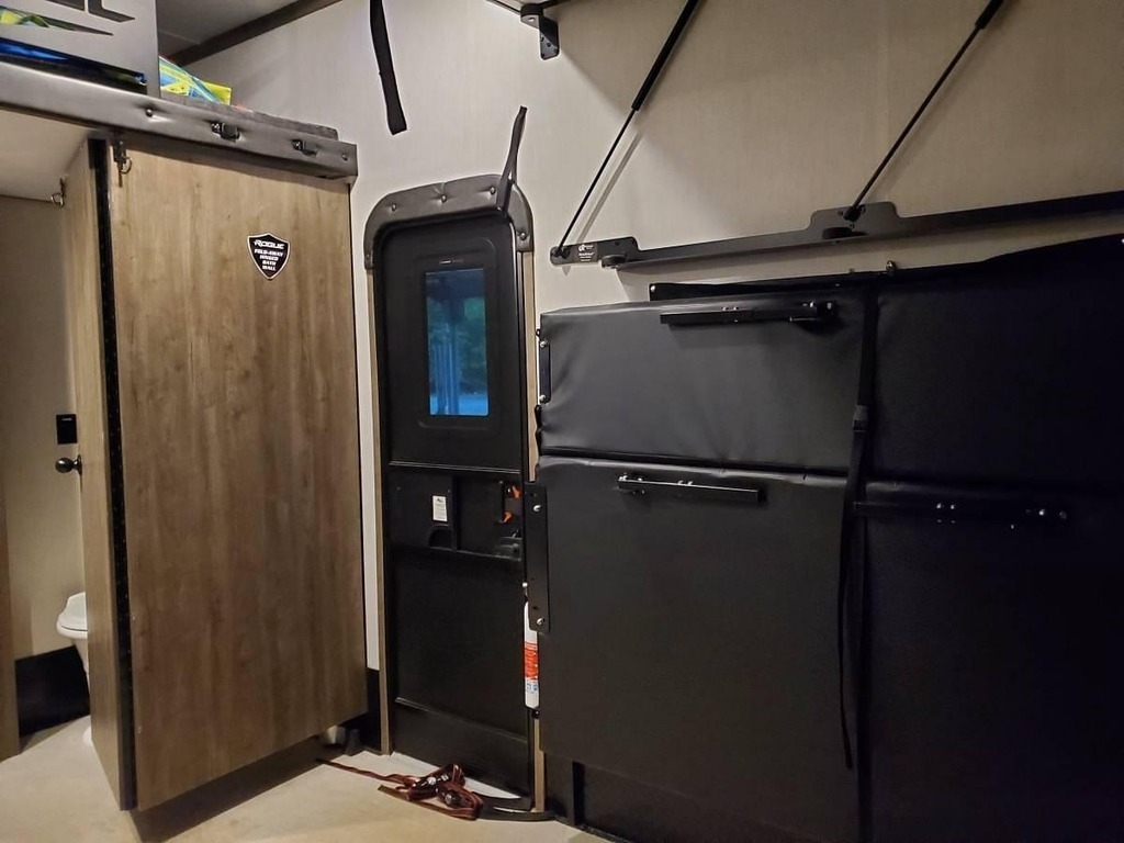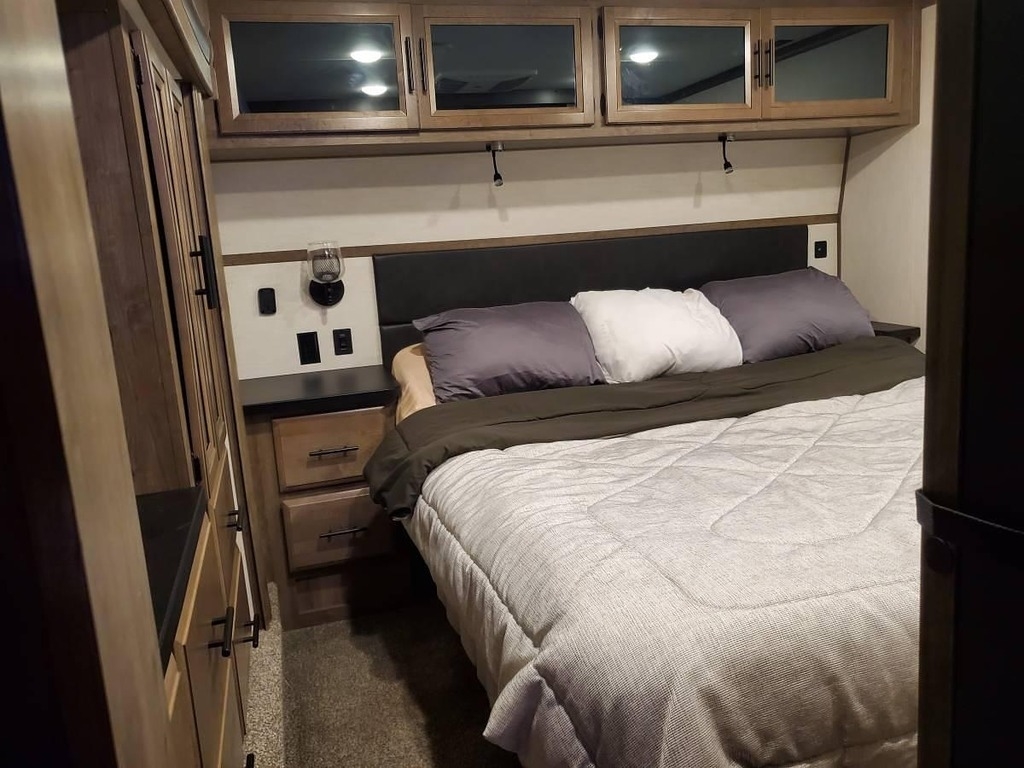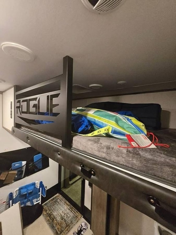 RV Toy Hauler, 43 ft. of luxury. Barely used 2022 Forest River Vengeance Rogue Armored 371A13. It's better than others because it comes with everything you need to start camping today. It has many upgrades and accessories including automatic leveling and stabilizing and solar charging. Comfortably sleeps 7 with an adjustable king-size bed in the master with reading lights. It has 1.5 baths along with 3-season screens and glass in the back and an outdoor back porch. Blue mood lighting indoors and out and two awnings add to the comfort and style. It has been kept under cover since new. There are too many upgrades to list but here are a few: rear and side cameras, Max Air auto vents, full-size fridge, full-size microwave, lots of storage, Samsung TV, pull-out cargo roller tray in cargo hold, two underbody larger sewage hose storage compartments, outdoor propane gas hook-up, Pit-Boss grill and table included. Additional features include an electric fireplace with color-changing technology, onboard generator, telescoping extension ladder, laundry hook-up, keypad door locks, and an outdoor refrigerator. The rear black tank has only been used with water. Title in hand. Clean as a whistle. To the right buyer the seller may include the 2022 B&W fifth wheel hitch (gooseneck mount type). A must see toy hauler ready for its next owner.