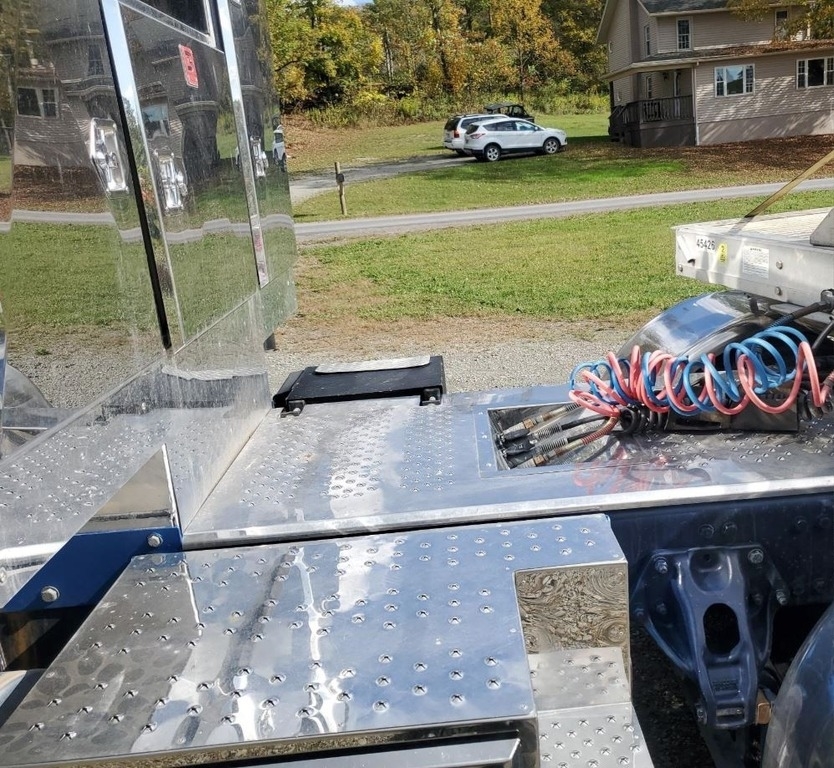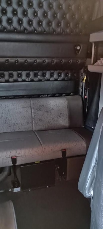 The truck rides on 80% steers and 90% drives, dual exhaust, and differential lock. It features an APU unit, 3,000-watt industrial inverter with two 110V outlets, and a 280-gallon fuel capacity for long hauls. The raised roof sleeper is beautifully appointed with a refrigerator, sofa, desk, cabinetry, and navigation system, offering both comfort and practicality. Interior amenities include power locks, air conditioning (excellent condition), and custom chrome accents throughout.