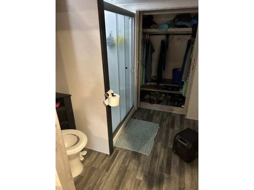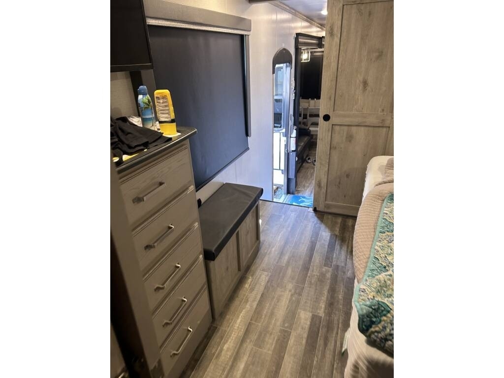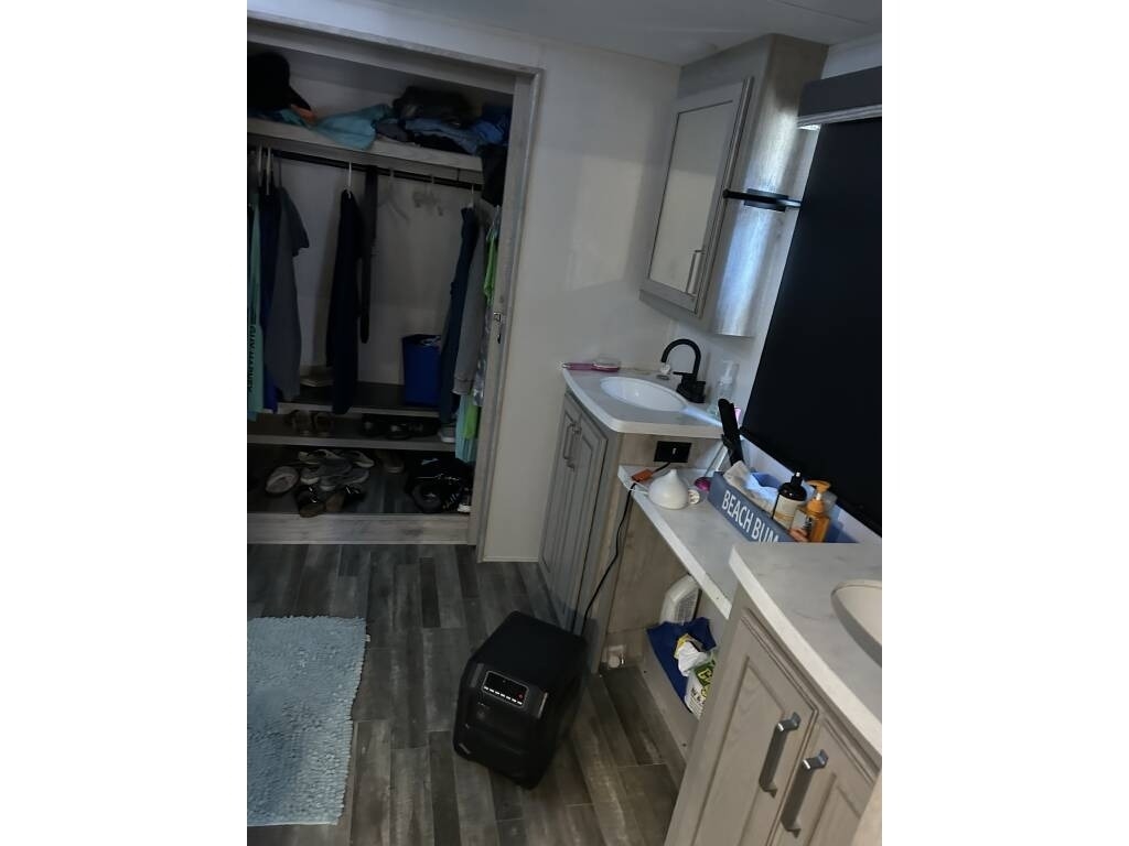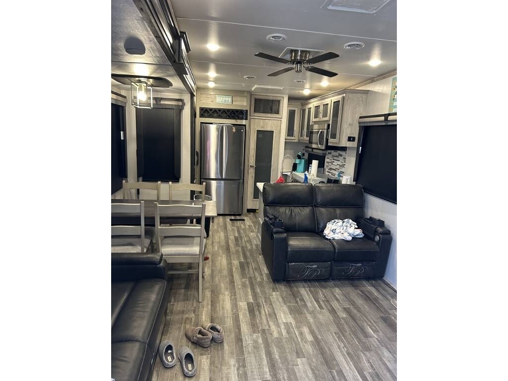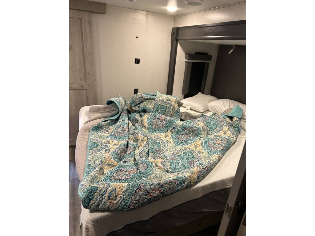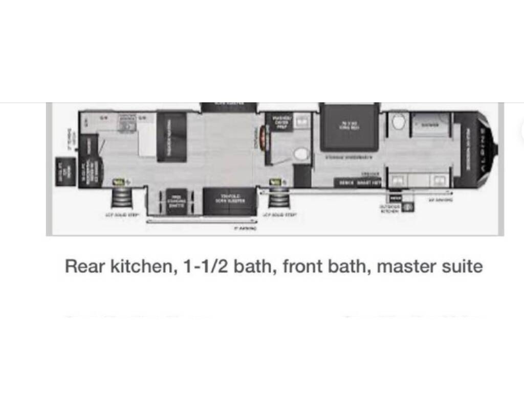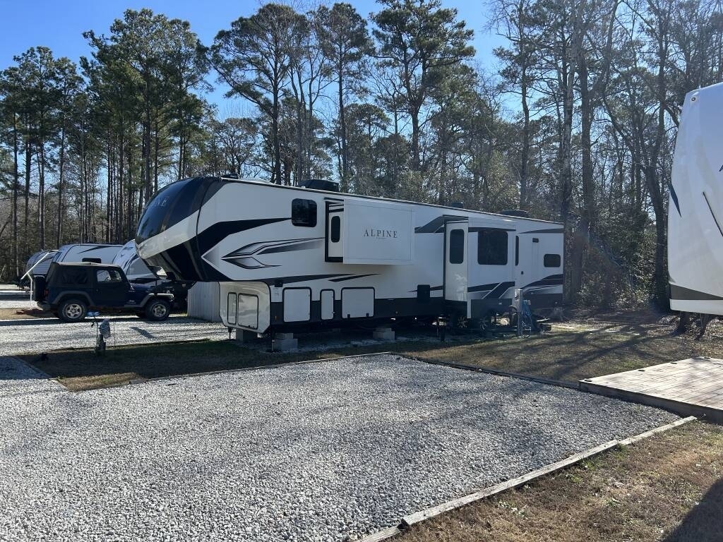 For sale is a used 2022 Keystone ALPINE 3910RK Fifth Wheel, located at the Willows Landing Campground in Sneads Ferry, with the campground fees paid through August 2025, or the RV can be moved. This spacious 42-foot RV offers comfortable sleeping accommodations for up to six people with three slide-outs to maximize interior space. The front bathroom features double sinks and a large closet, while the king-size bed in the master bedroom provides plenty of storage underneath. A half bath with a washer/dryer hookup adds convenience for longer stays. The middle living area is equipped with love seat recliners and two additional loveseats that convert into double beds for extra sleeping space. The rear kitchen includes a residential-sized refrigerator, perfect for preparing meals while on the road. Additional features include solar power, prewiring for TV antenna, air conditioning, and a backup camera for added convenience. The RV also includes a 12x24 deck, perfect for outdoor relaxation.