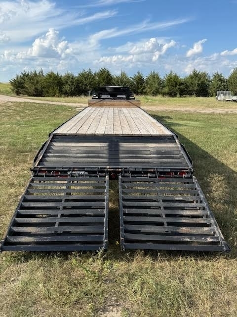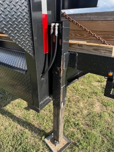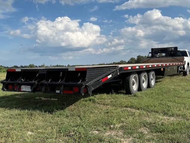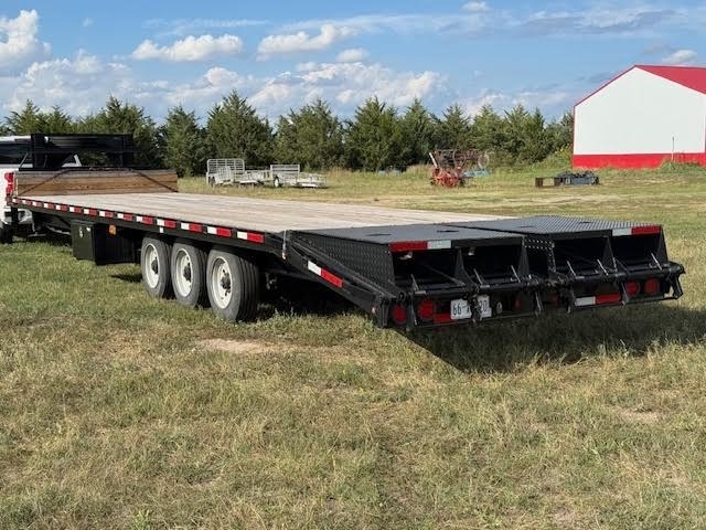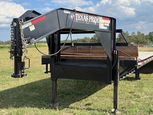 This 2023 Texas Pride 32' Flatbed Trailer is built tough and packed with features to handle demanding loads. It’s a fifth-wheel trailer equipped with a push-button hydraulic lift and triple 9,000 lb axles for maximum hauling capacity. The trailer includes manual ramps, two side utility boxes, a hydraulic front lift, spare tire, and LED lighting for convenience and safety. Designed for both durability and functionality, this trailer is ready to work and haul with confidence.