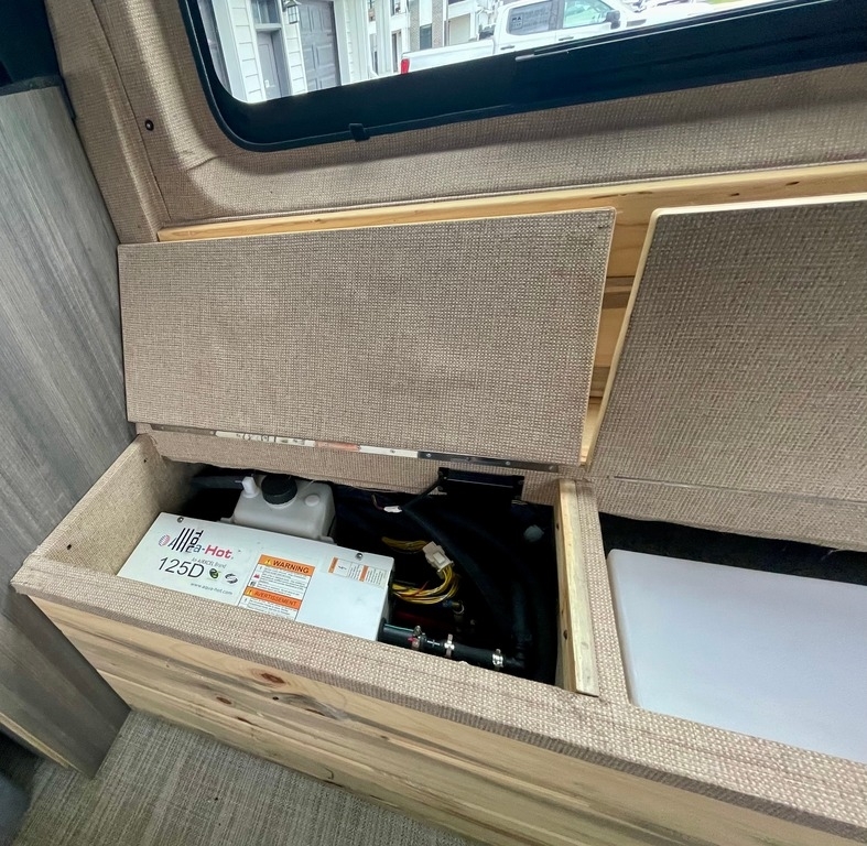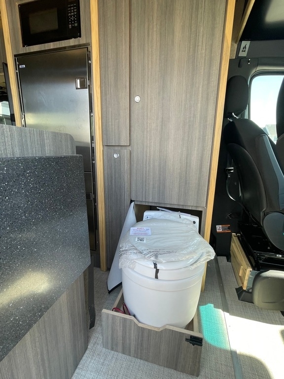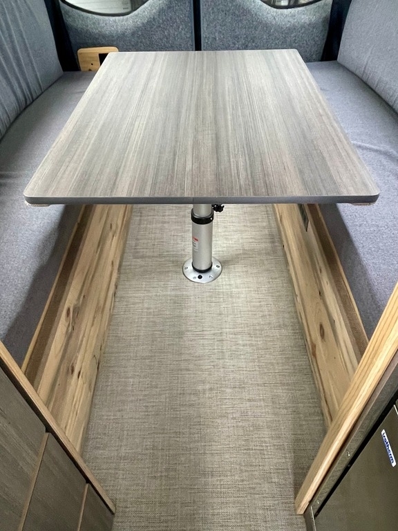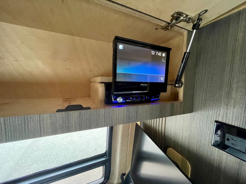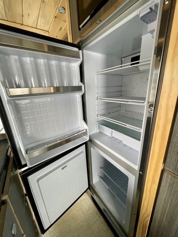 Beatle Kill Pine throughout, 2-pull large out pantry drawers, large storage cabinet, with additional ample cabinet storage above the beds, unique large Isotherm refrigerator with separate large freezer, microwave, 2000 watt inverter, dinette which converts to a bed, beautiful fabric wrap on all exposed metal surfaces, powerful Pioneer Stereo with blue tooth capability, large TV, aquahot heater that provides near instant hot water, outside shower, and plenty of LED lighting inside and out! Laveo dry flush toilet, AC and Max Air fan too, 31-gallon fresh water and 5-gallon gray water tanks, 200 watts of solar with a portable 200-watt solar panel.