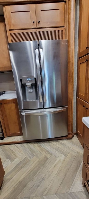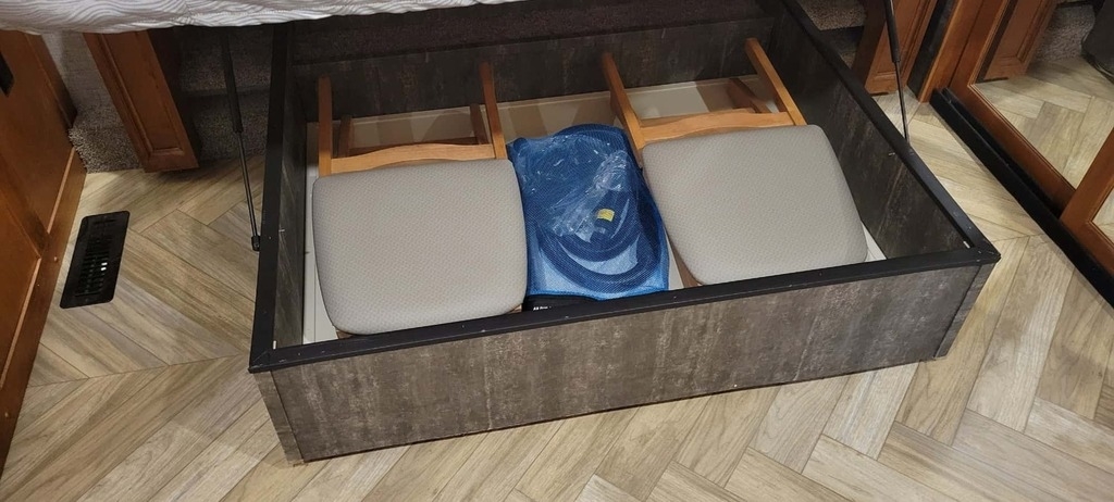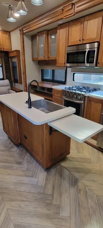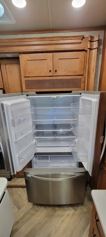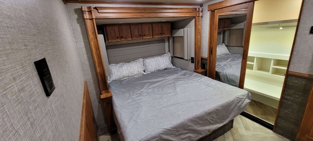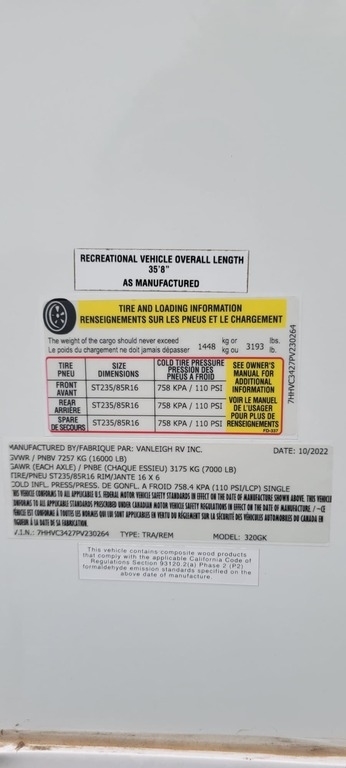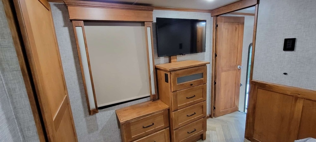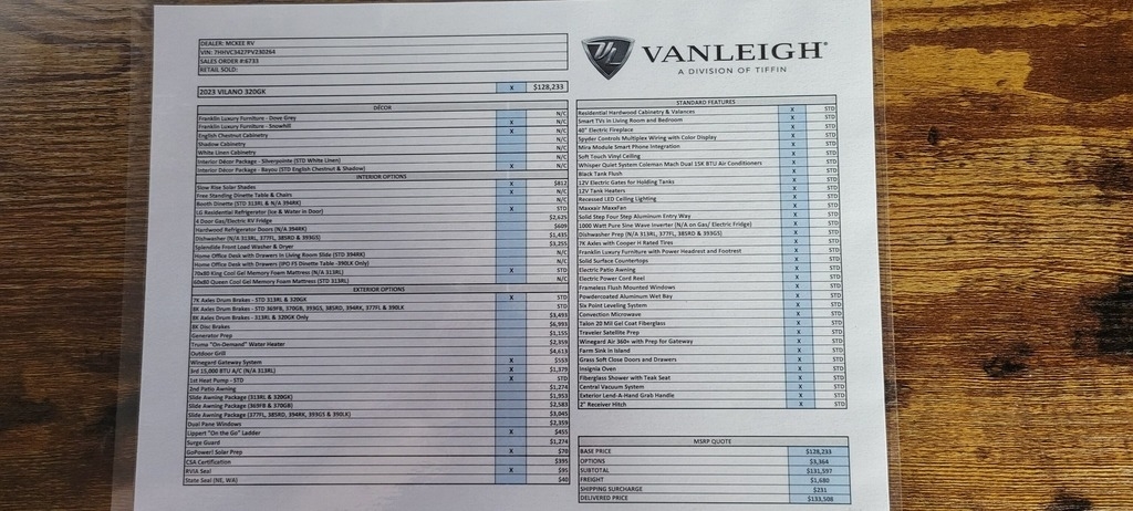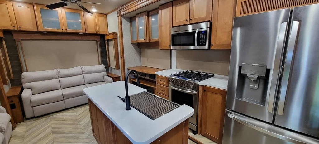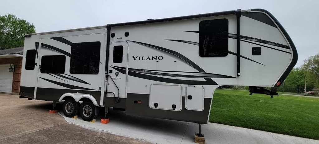 2023 Vanleigh Vilano 320GK Fifth Wheel This 2023 Vanleigh Vilano 320GK Fifth Wheel is a 50th-anniversary model presented in showroom condition, owned by a single owner and kept in a smoke-free, pet-free environment. Its manageable length makes it easy to tow while remaining exceptionally well suited for full-time living. The interior showcases high-end craftsmanship with hardwood soft-close cabinetry, solid surface countertops with an island farmhouse sink, and a free-standing dining table with four chairs. Premium appliances include an LG residential refrigerator with ice and water dispenser, an Insignia oven and stove, a microwave/convection oven, and a central vacuum system. Comfort and entertainment features include a king cool-gel memory foam bed with mattress protector, queen sleeper sofa, power theater recliners with USB ports, an electric heated fireplace, ceiling fan, a 50-inch hide-away TV, bedroom TV, JBL radio with indoor and outdoor speakers, three air conditioners including a heat pump, and day/night shades throughout. Technical and exterior highlights include a 70-gallon fresh water tank, 90-gallon gray tank, 45-gallon black tank, 10-gallon water heater, dual 40-gallon propane tanks, heated underbelly and tanks, Winegard Gateway Wi-Fi system, solar prep, washer/dryer hookups, an LED-lit awning, ample exterior storage, and the inclusion of a Patriot slider hitch and camper cover, making this Vilano a turnkey luxury fifth wheel ready for travel or extended living.
