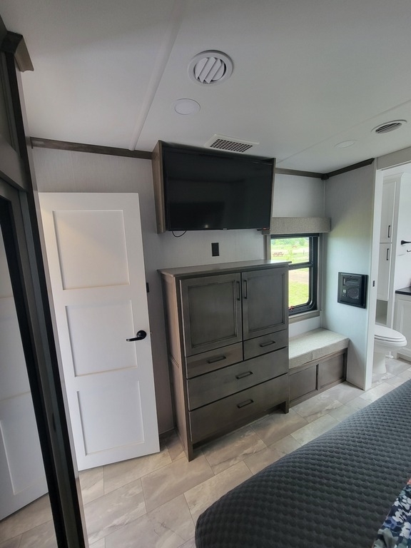 - Comfort: King bed in the master suite, dinette with chairs, electric fireplace, flat-screen TVs, and 3 roof air units with heat pumps.