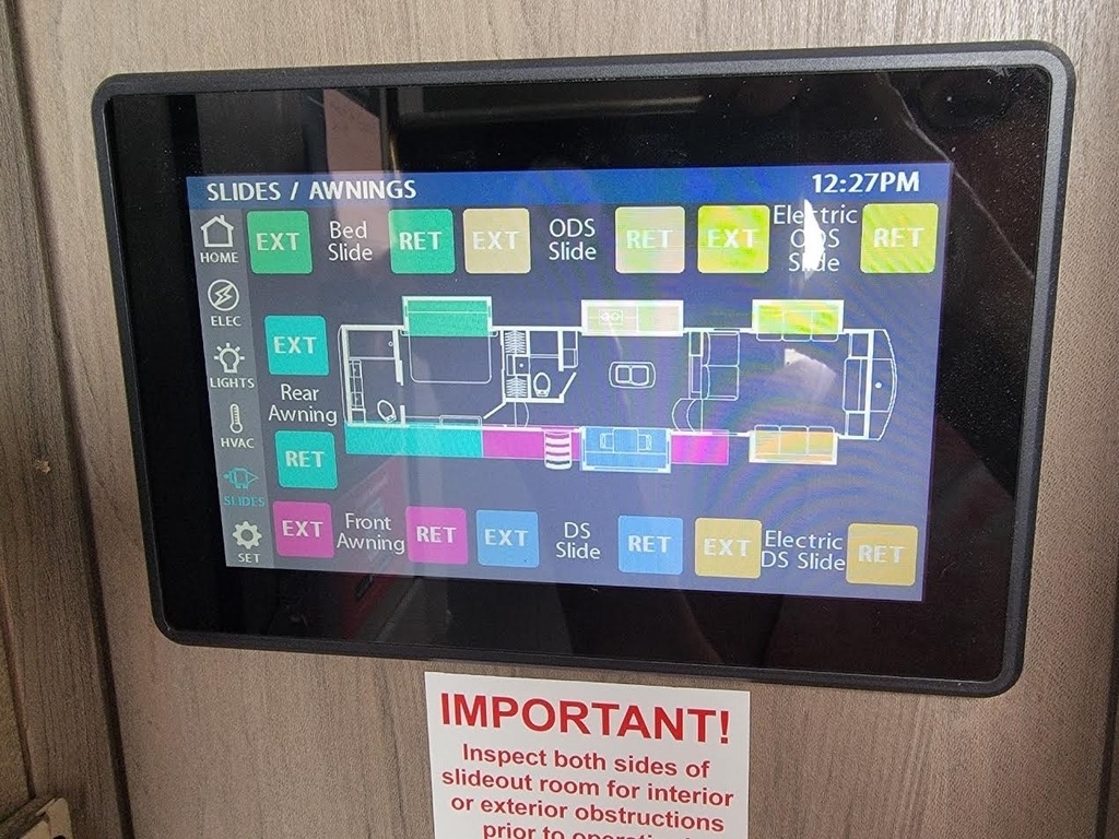 - Exterior & Warranty: 5 slide-outs, two power awnings, and a 4-sided camera system. Includes transferable extended warranties for both the ceramic coating and the tires/wheels.