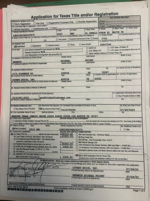 2023 GMC Yukon Denali This 2023 GMC Yukon Denali is loaded with premium features and has been garage kept with just 44,500 highway miles. Never used in 4WD and described as being in perfect condition, it’s essentially like new. A one-owner SUV with luxury appointments, this Yukon Denali delivers both reliability and comfort, making it an excellent choice for any buyer seeking a well-preserved full-size SUV. Originally purchased for $108,000. Located in Justin, TX 76247 For more information, please call 833-265-6113 and mention ID 971175