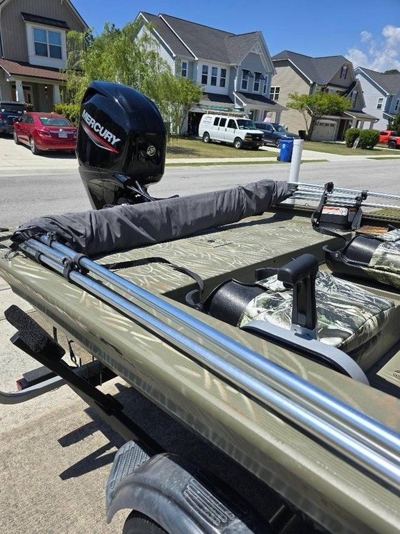 Presenting the 2024 Grizzly Tracker T1754SC, a side console fishing boat powered by a 60 HP 2024 Mercury Outboard Motor, model IF60413GZ. This package includes a 2024 Trailstar 17FT. boat trailer, model U1754, both of which are in like-new condition. The boat is equipped with a range of premium options, including a spare tire and wheel with a trailer mount and lock, a Haswing remote trolling motor, and a 12-volt trolling motor battery. For navigation, it features a Garmin Striker VIVID5CV depth finder with GPS capabilities. Additional accessories include a cell phone holder, dock lines, an anchor with rope, life jackets, Versia Trac rod holders, and extra rod holders. The package also comes with ice chest tie downs, a boat cover, and a bimini top for added comfort and protection. Located in Holly Ridge, NC 28445 For more information, please call 833-265-6113 and mention ID 85219