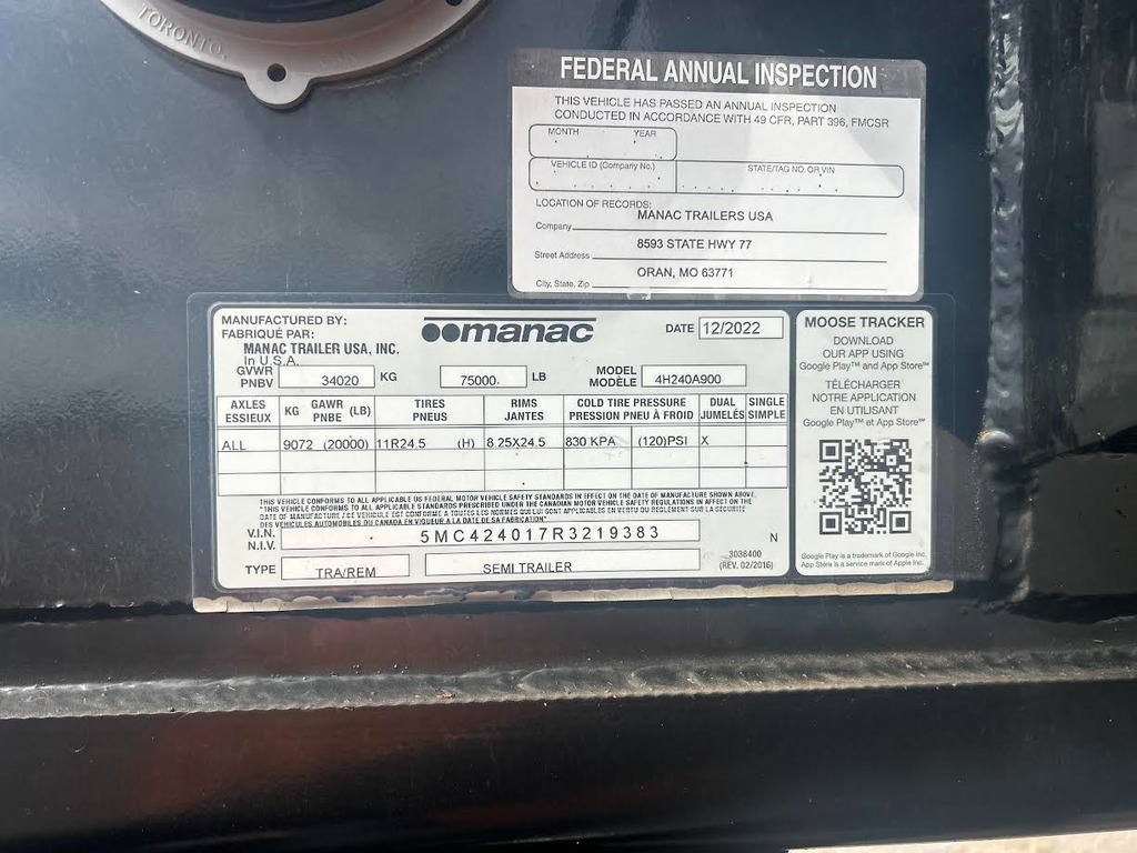 This 2024 Manac TL SE End Dump Trailer is built for heavy-duty hauling and designed for long-lasting performance. Manufactured by Manac Trailer USA, this trailer features a 75,000 lb GVWR, 20,000 lb axle rating, and air ride suspension for smooth, stable operation. It’s equipped with 8.25x24.5 rims, H-rated tires, and operates at 120 PSI cold tire pressure for maximum durability under load. The trailer includes a poly floor liner to reduce material stick and wear, along with an Invader rolling tarp system for easy load coverage and protection. A pump, control valve, and oil tank are also included, making it ready to hook up and work. Strong, reliable, and built to handle tough jobs, this Manac end dump is an excellent addition to any fleet.