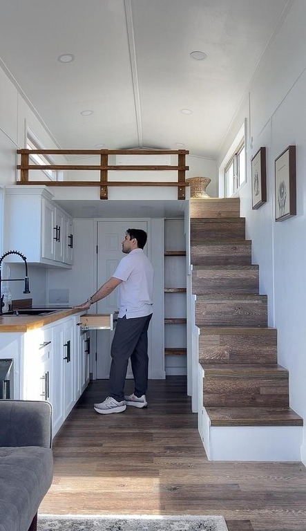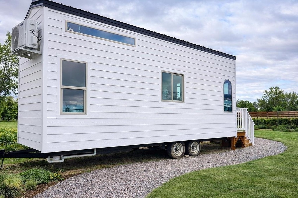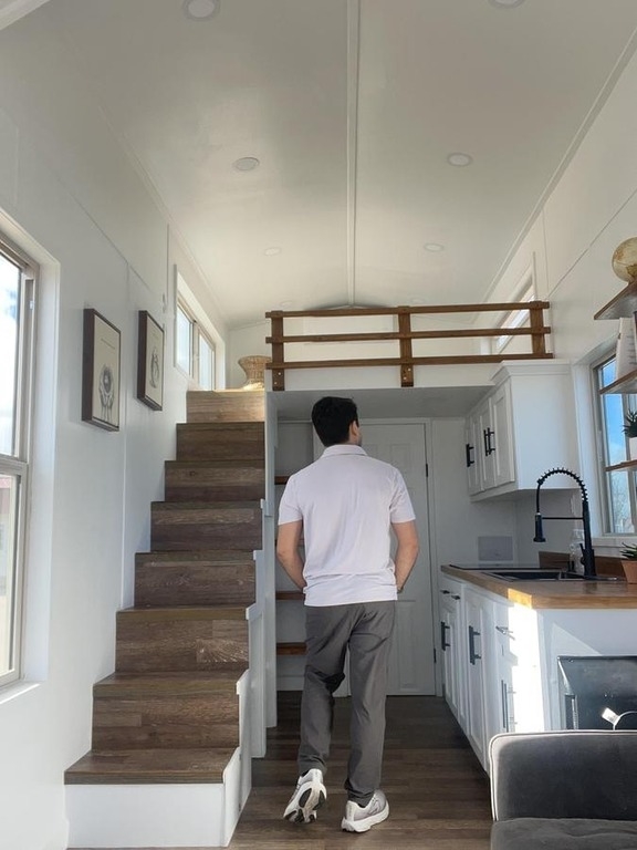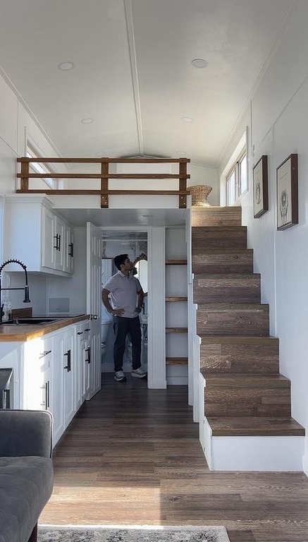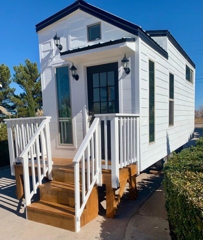 This 2025 Tiny Home on Wheels offers a stylish and efficient living solution with modern design, quality craftsmanship, and the freedom of mobility. Built for comfort and functionality, this beautifully finished tiny home features a bright, open interior with contemporary flooring, custom cabinetry, and thoughtfully designed living space. The exterior includes an inviting front porch with railing and steps, perfect for relaxing or entertaining. Large windows provide abundant natural light, creating an airy and welcoming atmosphere throughout. Ideal for full-time living, guest housing, or a private retreat, this tiny home combines smart use of space with modern comfort, making it a turnkey option for minimalist living or off-grid lifestyles.