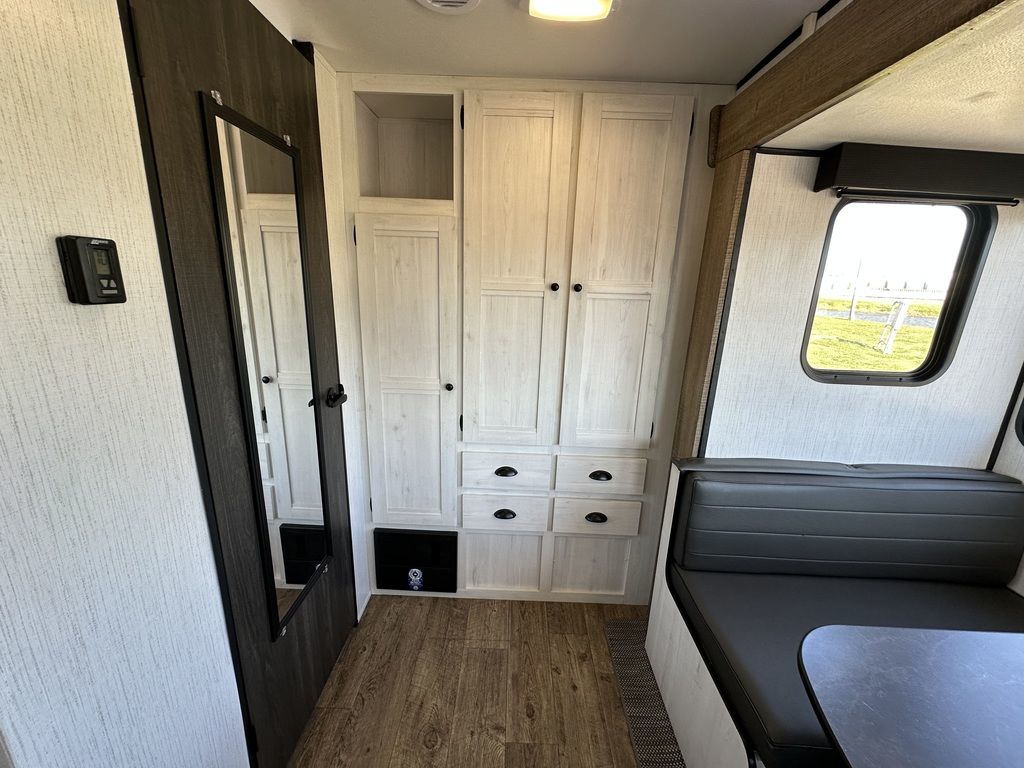 - Modern Farmhouse interior details with woodgrain floor and matching facia.