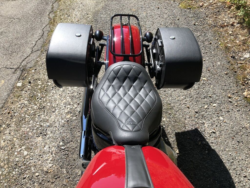 1746cc 1,500 Miles Billiard Red Fuel Injection Rinehart Exhaust Custom Risers Black Engine Guard Mustang Seat Black Fender Rack LED Turn Signals TC Bros Plate Bracket Detachable Windshield Detachable Viking Saddlebags Factory Security 107ci 6 Speed