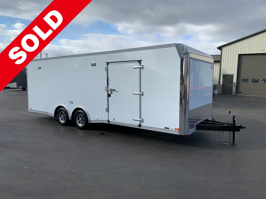 STOCK # 175629· NEW 2022 UNITED 24’ SPREAD AXLE RACE CAR TRAILER· 8.5' WIDE X 24' LONG (21' 4" USABLE FLOOR) X 6' 8" INTERIOR HEIGHT· (6' 5" DOOR HEIGHT CLEARANCE)· GVWR: 9,990 LB· EMPTY WEIGHT: 5,220 LB· COLOR: POLAR WHITE SCREWLESS EXTERIOR· AXLE -· (2) DEXTER 5,200 LB INDEPENDENT TORSION SUSPENSION AXLES· ELECTRIC BRAKES ON ALL WHEELS· E-Z® LUBE HUBS· TIRES -· ST225/75R15E 10-PLY RADIAL TIRES· NITROFILL TIRES (NITROGEN)· 6-LUG 15” ALUMINUM WHEELS (CLEAR COATED)· CHROME CENTER CAPS W/ REMOVABLE PLUG· CHROME LUG NUTS· HITCH -· 7-WAY RV MOLDED PLUG· 2-5/16" COUPLER· TONGUE JACK· SAFETY CHAINS· BREAKAWAY KIT W/ CHARGER· FRAME -· REAR WING W/ GUSSETS· 4-1/2" SKID ROLLER WHEELS WELDED ON REAR UNDERCARRIAGE (PAIR)· (2) STORAGE COMPARTMENTS IN FLOOR· WINCH MOUNT PLATE UNDER FLOOR - FRONT CENTER· STEEL UNI-BODY CONSTRUCTION· TRIPLE-TUBE A-FRAME TONGUE - 48” CLEARANCE TO CENTER-BALL· 6" DOUBLED (WELDED TOGETHER) I-BEAM MAIN FRAME RAILS· 16" ON-CENTER FLOOR CROSS MEMBERS· 16" ON-CENTER WALL POSTS· 16" ON-CENTER ROOF BOWS· UNDERCOATING ON LOWER FRAME· VENTS -· FRONT ROOF VENT BRACED & WIRED FOR A/C W/ 20 AMP BREAKER· REAR NON-POWERED ROOF VENT· INTERIOR -· WHITE VINYL CEILING W/ ANGLED COVE EDGES· INSULATED CEILING· FOAM SEAL DUST BLOCK TO CLOSE OFF EXTERIOR BOTTOM OF SIDEWALLS· WHITE ALUMINUM INTERIOR WALL OVERLAY OVER 3/8" PLYWOOD· MARINE-GRADE CARPET PROTECTIVE WAINSCOTING 3' UP ON INTERIOR WALLS· REAL BLACK RAISED RUBBER-COIN FLOORING· 3/4" PLYWOOD SUBFLOOR· ALUMINUM INTERIOR TRANSITION FLAP W/ HINGE FOR RAMP DOOR (HINGE COVER)· (8) HEAVY DUTY RECESSED D-RINGS ON FLOOR· (2) 5' 6" ROWS OF RECESSED E-TRACK ON ROAD SIDE WALL BEHIND BASE CABINET AT 12" & 30" ABOVE FLOOR· 12 VOLT ELECTRICAL -· (4) 12 VOLT L.E.D. OPTRONICS OPTI-BRITE ILL10CCB 10-DIODE 18" RECESSED INTERIOR LIGHTS· 12 VOLT L.E.D. OPTRONICS OPTI-BRITE ILL10CCB 10-DIODE 18" RECESSED CABINET LIGHT· (2) 3-WAY WALL SWITCHES FOR INTERIOR LIGHTS - (1) AT SIDE DOOR & (1) AT REAR· (2) TECNIQ K70 SURFACE-MOUNT L.E.D. SCENE LIGHT(S) - ON CURB SIDE W/ WALL SWITCH AT SIDE DOOR· (2) 12-VOLT L.E.D. LOADING LIGHTS ON REAR W/ WALL SWITCH AT REAR· (4) 12-VOLT L.E.D. 18-DIODE 3" ROUND RECESSED LOADING LIGHTS IN SIDEWALLS W/ WALL SWITCH AT REAR· USB 12-VOLT CHARGING PORT - ABOVE WORK BENCH· CARBON-MONOXIDE DETECTOR (BATTERY OPERATED)· (2) PAIRS OF L.E.D. TAIL LIGHTS W/ CHROME TRIM RINGS· L.E.D. BACK-UP LIGHTS W/ CHROME TRIM RINGS· MIDSHIP L.E.D. TURN SIGNALS W/ CHROME TRIM RINGS· L.E.D. CLEARANCE LIGHTS· EXTERIOR -· .030 SMOOTH ALUMINUM EXTERIOR· EPOXY GLUED EXTERIOR PANELS (SCREWLESS EXTERIOR)· 24” ALUMINUM TREAD PLATE STONE GUARD· ONE-PIECE ALUMINUM SEAMLESS ROOF· LUAN REINFORCEMENT LINING UNDER ROOF SHEET· CAST ALUMINUM UPPER FRONT CORNERS· POLISHED ALUMINUM FRONT VERTICAL CORNERS· POLISHED ALUMINUM RADIUS FRONT TOP· 3” ALUMINUM TOP RAIL· ALUMINUM BOTTOM RAIL· SPREAD AXLES W/ INDIVIDUAL ALUMINUM FENDER FLARES· WEATHER GUARD COATING ON FASTENERS· DOOR -· 36" WIDE X 30" HIGH GENERATOR DOOR (VENTED)· 48" SIDE DOOR W/ CAMLOCK & RV LATCH W/ DEADBOLT· ALUMINUM DOOR HOLD-BACK· BEAVERTAILED FLOOR FOR E-Z LOADING - 4’ LONG / 3” DROP· RAMP REAR DOOR W/ SPRING ASSIST, 3,000 LB LOAD CAPACITY· 95-3/4" WIDE X 77" HIGH RAMP DOOR OPENING· (2) STANDARD CAMLOCKS ON REAR RAMP DOOR· GRAB HANDLES ON RAMP DOOR· (3) CARGO VISE LOCKS ON DOORS (KEYED ALIKE)· 1' ALL-ALUMINUM END FLAP ON RAMP DOOR· CABINETS -· ALUMINUM CABINET PACKAGE ACROSS FRONT WALL - 36” HIGH X 28” DEEP “L”-SHAPED BASE CABINET & 16” TALL X 16” DEEP STRAIGHT OVERHEAD CABINET· - BASE CABINET CENTER DOORS RAISED FOR FUTURE WINCH CABLE MOUSE HOLE· - MILL FINISH ALUMINUM WORK BENCH TOP· 110 VOLT ELECTRICAL -· (8) INTERIOR DUPLEX RECEPTACLES· (1) EXTERIOR GFI RECEPTACLE· 30 AMP ELECTRICAL PANEL· 30 AMP EXTERIOR MOTOR BASE PLUG· 30 AMP RV POWER CORD - 25' LONG W/ TWIST-LOCK PLUG· WARRANTY -· 5 YEAR LIMITED MANUFACTURER'S WARRANTY· 25 YEAR LIMITED FLOOR PLYWOOD WARRANTY· FREIGHT FROM BRISTOL, INDIANA TO HAGERSTOWN, MARYLAND INCLUDED
