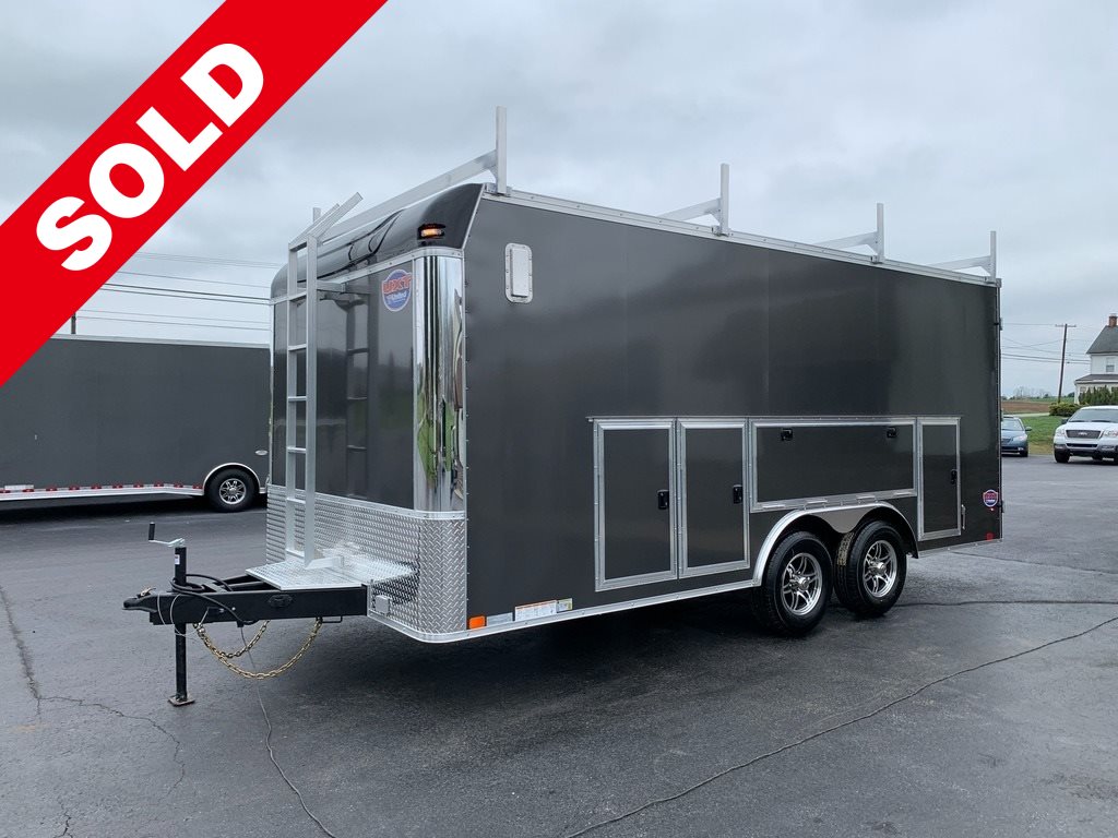 STOCK # 178755· NEW 2022 UNITED 8.5’ X 18' 10K GVWR TOOL CRIB CONTRACTOR'S TRAILER· 8.5' WIDE X 18' LONG X 6' 8" INTERIOR HEIGHT· (6' 2" DOOR HEIGHT CLEARANCE)· DOUBLE SWING REAR DOORS W/ CAMLOCK - 91-3/4” WIDE X 74” HIGH OPENING· GVWR: 9,990 LB· EMPTY WEIGHT: 3,880 LB· EXTERIOR COLOR: CHARCOAL METALLIC· INCLUDED OPTION(S):· 6-LUG 15" ALUMINUM WHEELS (CLEAR COATED) - NO CHARGE UPGRADE· EPOXY GLUED EXTERIOR PANELS (SCREWLESS EXTERIOR)· RV LATCH W/ DEADBOLT ON SIDE DOOR· ALUMINUM DOOR HOLD-BACK· (2) SALEM ALUMINUM 2-WAY SIDEWALL VENTS· WALK-ON ROOF (HEAVY DUTY) - 3/8" PLYWOOD REINFORCEMENT LINING UNDER ENTIRE ROOF SHEET W/ 12" ON-CENTER ROOF BOWS· LUAN CEILING LINER W/ ALUMINUM COVE TRIM· L.E.D. BACKUP LIGHTS (PAIR)· TOOL CRIB PACKAGE -· - (1) 72" WIDE X 22-1/2" TALL DOOR W/ RV LOCKS OVER WHEEL WELL (Folds down for work bench)· - (3) 22" WIDE X 35" TALL DOORS W/ RV LOCKS, (2) IN FRONT OF WHEEL WELL & (1) BEHIND· - 16" DEEP WOOD CABINETS BEHIND DOORS W/ HINGED COUNTER TOPS TO ACCESS CABINETS· - PEG BOARD ON THE INSIDE OF THE CABINETS· - .080 ALUMINUM SHELF, ADJUSTABLE - (1) PER CABINET· CONTRACTOR'S PACKAGE -· - (4) ALUMINUM LADDER RACKS· - ALUMINUM LADDER ON FRONT· - ALUMINUM TREAD PLATE LADDER PLATFORM ON HITCH· - (2) 12 VOLT L.E.D. LOADING LIGHTS ON REAR HEADER W/ WALL SWITCH· - (4) HEAVY DUTY RECESSED D-RINGS ON FLOOR· - E-TRACK (RECESSED) W/ ALUMINUM TREAD PLATE TRIM· (2) ADDITIONAL HEAVY DUTY RECESSED D-RINGS ON FLOOR (TOTAL OF 6)· (3) 12 VOLT L.E.D. OPTRONICS OPTI-BRITE ILL10CCB 10-DIODE CEILING LIGHTS W/ WALL SWITCH· 110 VOLT ELECTRICAL -· - (2) INTERIOR DUPLEX RECEPTACLES· - 15 AMP EXTERIOR MOTOR BASE PLUG· STANDARD FEATURES:· (2) DEXTER 5,200 LB INDEPENDENT TORSION SUSPENSION AXLES· ELECTRIC BRAKES ON ALL WHEELS· E-Z® LUBE HUBS· ST225/75R15E 10-PLY RADIAL TIRES· NITROFILL TIRES (NITROGEN)· 7-WAY RV MOLDED PLUG· 2-5/16" COUPLER· TONGUE JACK· SAFETY CHAINS· BREAKAWAY KIT W/ CHARGER· STEEL UNI-BODY CONSTRUCTION· 6" TRIPLE-TUBE A-FRAME TONGUE· 6" I-BEAM MAIN FRAME RAILS· 16" ON-CENTER FLOOR CROSS MEMBERS· 16" ON-CENTER WALL POSTS· UNDERCOATING ON LOWER FRAME· 3/8" PLYWOOD INTERIOR WALL LINER· 3/4" PLYWOOD FLOOR· L.E.D. TAIL & CLEARANCE LIGHTS· .030 SMOOTH ALUMINUM EXTERIOR· ONE-PIECE ALUMINUM SEAMLESS ROOF· ALUMINUM FENDER FLARES· ALUMINUM TREAD PLATE STONE GUARD· ALUMINUM FRONT CORNERS· WEATHER GUARD COATING ON FASTENERS· 32" SIDE DOOR W/ CAMLOCK· 5 YEAR LIMITED MANUFACTURER'S WARRANTY· 25 YEAR LIMITED FLOOR PLYWOOD WARRANTY· FREIGHT FROM BRISTOL, INDIANA TO HAGERSTOWN, MARYLAND INCLUDED