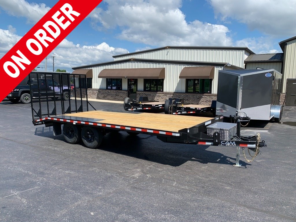 STOCK #: 5CAM818LDDO· NEW 2023 CAM SUPERLINE 18' 10K GVWR DECKOVER FLATBED LANDSCAPE EQUIPMENT TRAILER· BED SIZE: 96" WIDE X 18' LONG (15' FLAT + 3' BEAVERTAIL)· GVWR: 9,900 LB· EMPTY WEIGHT: 2,750 LB· PAYLOAD CAPACITY: 8,150 LB· DECK HEIGHT: 30"· OVERALL WIDTH: 96"· 5" CHANNEL @ 6.7# MAIN FRAME· 5" CHANNEL @ 6.7# TONGUE· 3" CHANNEL CROSS MEMBERS· STAKE POCKETS & RUB RAILS· 5' LONG SPRING-ASSISTED SPLIT LANDSCAPE RAMPS· ALUMINUM TOOL BOX· 2" PRESSURE-TREATED PINE DECKING· 2-5/16" ADJUSTABLE COUPLER· 7K BOLT-ON DROP LEG JACK· SAFETY CHAINS· 7-WAY RV PLUG· BREAKAWAY BATTERY KIT W/ SOLAR CHARGER· SEALED WIRING HARNESS· L.E.D. RUBBER MOUNTED LIGHTS· 5,200LB E-Z LUBE AXLES· ELECTRIC BRAKES ON ALL WHEELS· SLIPPER SPRING SUSPENSION· 6-LUG 15" WHEELS· ST225/75R15D 8-PLY RADIAL TIRES· MUD FLAPS· SPARE TIRE MOUNT· EPOXY PRIMER· POLYURETHANE PAINT FINISH· 3 YEAR LIMITED WARRANTY