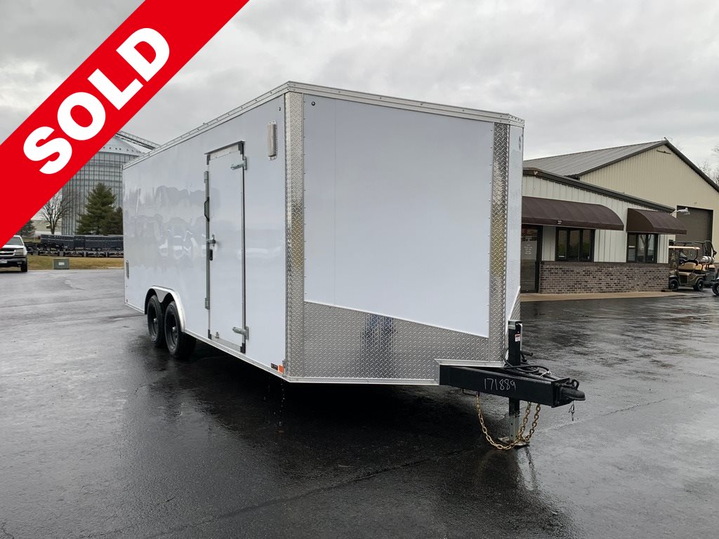 STOCK # 171889· NEW 2020 UNITED 8.5' X 20’ V-NOSE 10K GVWR ENCLOSED COMMERCIAL-DUTY LANDSCAPE TRAILER· 8.5' WIDE X 20' LONG + 3' V-NOSE X 6' 8" INTERIOR HEIGHT · (6’ 5” DOOR HEIGHT CLEARANCE)· GVWR: 9,990 LB· EMPTY WEIGHT: 3,680 LB· EXTERIOR COLOR: POLAR WHITE- INCLUDED OPTION(S) -· 5' TONGUE (4-1/2’ CLEARANCE) FOR STAKE BODY OR DUMP TRUCK· 7,000 LB SQUARE-TUBE DROP-LEG JACK· (4) SALEM ALUMINUM 2-WAY RECESSED SIDEWALL VENTS· (8) HEAVY DUTY RECESSED D-RINGS ON FLOOR· 3/8” PLYWOOD INTERIOR WALL LINER· 36” SIDE DOOR W/ CAMLOCK & RV LATCH W/ DEADBOLT· ALUMINUM DOOR HOLD-BACK· FUEL DOOR· INTEGRATED TAPERED TRANSITION EDGE ON RAMP DOOR (OMITS END FLAP)- STANDARD FEATURES -- AXLE -· (2) DEXTER 5,200 LB INDEPENDENT TORSION SUSPENSION AXLES· ELECTRIC BRAKES ON ALL WHEELS· E-Z® LUBE HUBS- TIRES -· ST225/75R15E 10-PLY RADIAL TIRES· NITROFILL TIRES (NITROGEN)· 6-LUG 15" WHEELS- HITCH -· 7-WAY RV MOLDED PLUG· 2-5/16" COUPLER· SAFETY CHAINS· BREAKAWAY KIT W/ CHARGER- FRAME -· STEEL UNI-BODY CONSTRUCTION· TRIPLE-TUBE A-FRAME TONGUE· 6" DOUBLED (WELDED TOGETHER) I-BEAM MAIN FRAME RAILS· 16” ON-CENTER FLOOR CROSS MEMBERS· 16" ON-CENTER WALL POSTS· 16" ON-CENTER ROOF BOWS· UNDERCOATING ON LOWER FRAME- INTERIOR -· 3/4" PLYWOOD FLOOR· FOAM SEAL DUST BLOCK TO CLOSE OFF EXTERIOR BOTTOM OF SIDEWALLS- 12-VOLT -· (2) 12 VOLT L.E.D. DOME LIGHTS W/ WALL SWITCH AT SIDE DOOR· L.E.D. CLEAR LENS TAIL LIGHTS & CLEARANCE LIGHTS- EXTERIOR -· .030 SMOOTH ALUMINUM EXTERIOR· EPOXY GLUED EXTERIOR PANELS (SCREWLESS EXTERIOR)· ONE-PIECE ALUMINUM SEAMLESS ROOF· LUAN REINFORCEMENT LINING UNDER ROOF SHEET· ALUMINUM TREAD PLATE STONE GUARD· ALUMINUM TREAD PLATE NOSE POINT & FRONT CORNERS· 3" ALUMINUM TOP RAIL· 1-1/2" ALUMINUM BOTTOM RAIL· ALUMINUM FENDER FLARES· WEATHER GUARD COATING ON FASTENERS- DOOR -· RAMP REAR DOOR W/ SPRING ASSIST (3,000 LB LOAD CAPACITY) 91-3/4” WIDE X 77” HIGH OPENING (2- STANDARD CAMLOCKS ON DOOR)· BEAVERTAILED FLOOR FOR E-Z LOADING - 4' LONG / 3" DROP- WARRANTY -· 3 YEAR LIMITED MANUFACTURER’S WARRANTY· 25 YEAR LIMITED FLOOR PLYWOOD WARRANTY· FREIGHT FROM BRISTOL, INDIANA TO HAGERSTOWN, MARYLAND INCLUDED
