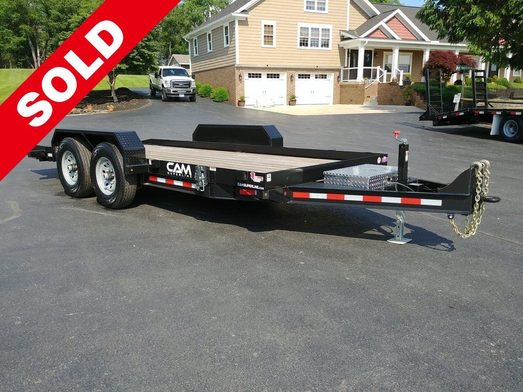 STOCK # 6CAM18FTT· NEW 2018 CAM SUPERLINE 7' X 18' 6-TON FULL DECK GRAVITY TILT LOW PROFILE EQUIPMENT TRAILER· BED SIZE: 81” WIDE X 18’ LONG· GVWR: 13,800 LB· EMPTY WEIGHT: 3,080 LB· PAYLOAD CAPACITY: 10,720 LB· DECK HEIGHT: 17”· OVERALL WIDTH: 102”· COLOR: BLACK· 6" X 4” X 5/16” ANGLE MAIN FRAME· 3" CHANNEL @ 4.1# CROSS MEMBERS· 6” CHANNEL @ 8.2# WRAP AROUND TONGUE· ADJUSTABLE HYDRAULIC CUSHION CYLINDER· DIAMOND PLATE FENDERS· 7K BOLT-ON DROP LEG JACK· ADJUSTABLE 2-5/16" COUPLER OR PINTLE· (6) D-RING TIE-DOWNS - 5/8"· (8) STAKE POCKETS· (2) BANJO EYE (CHAIN SLOT) TIE-DOWNS ON STEEL TAIL· TOOL BOX W/ LOCKABLE LID· 2” P/T PINE DECKING· BREAKAWAY BATTERY KIT W/ SOLAR CHARGER· SAFETY CHAINS· 7-WAY RV PLUG· SEALED WIRING HARNESS· L.E.D. RUBBER MOUNTED LIGHTS· DEXTER 6,000LB E-Z® LUBE AXLES (4" DROP)· ELECTRIC BRAKES ON ALL WHEELS· SLIPPER SPRING SUSPENSION· ST235/80R16E 10-PLY RADIAL TIRES· 16” 8-LUG WHEELS· EPOXY PRIMER· PPG POLYURETHANE PAINT FINISH· 3 YEAR LIMITED WARRANTY
