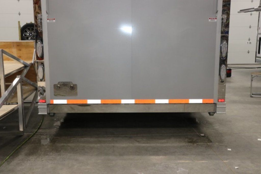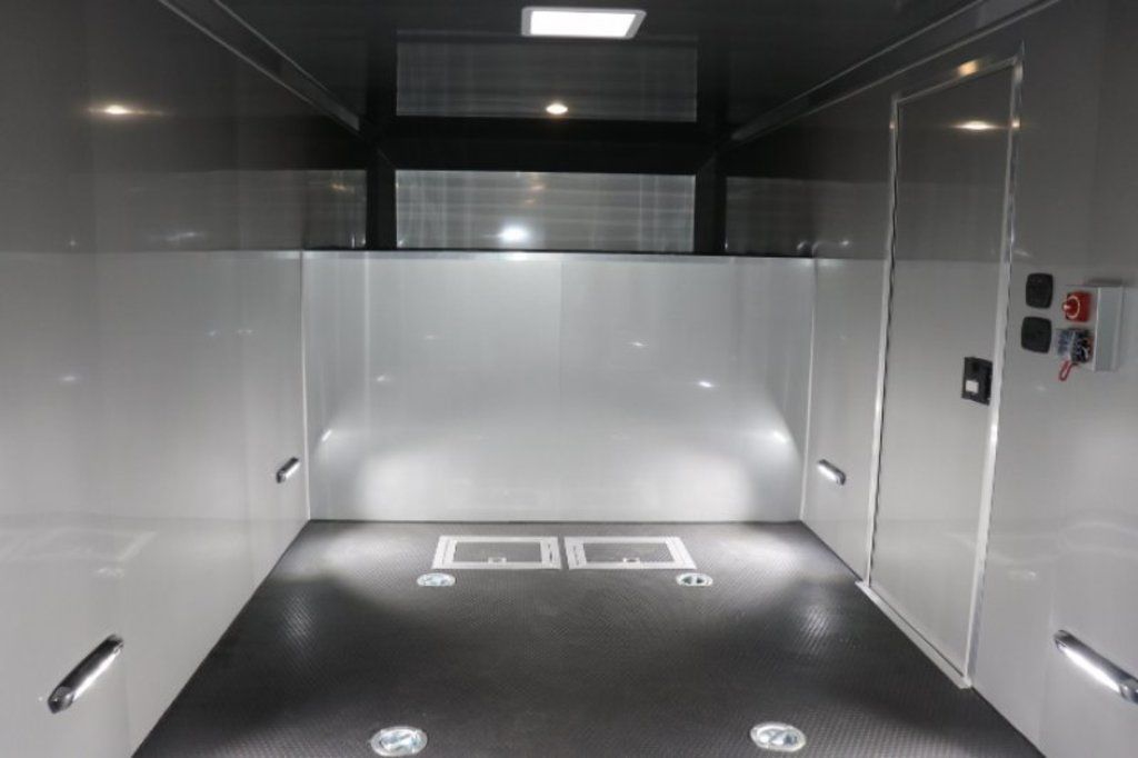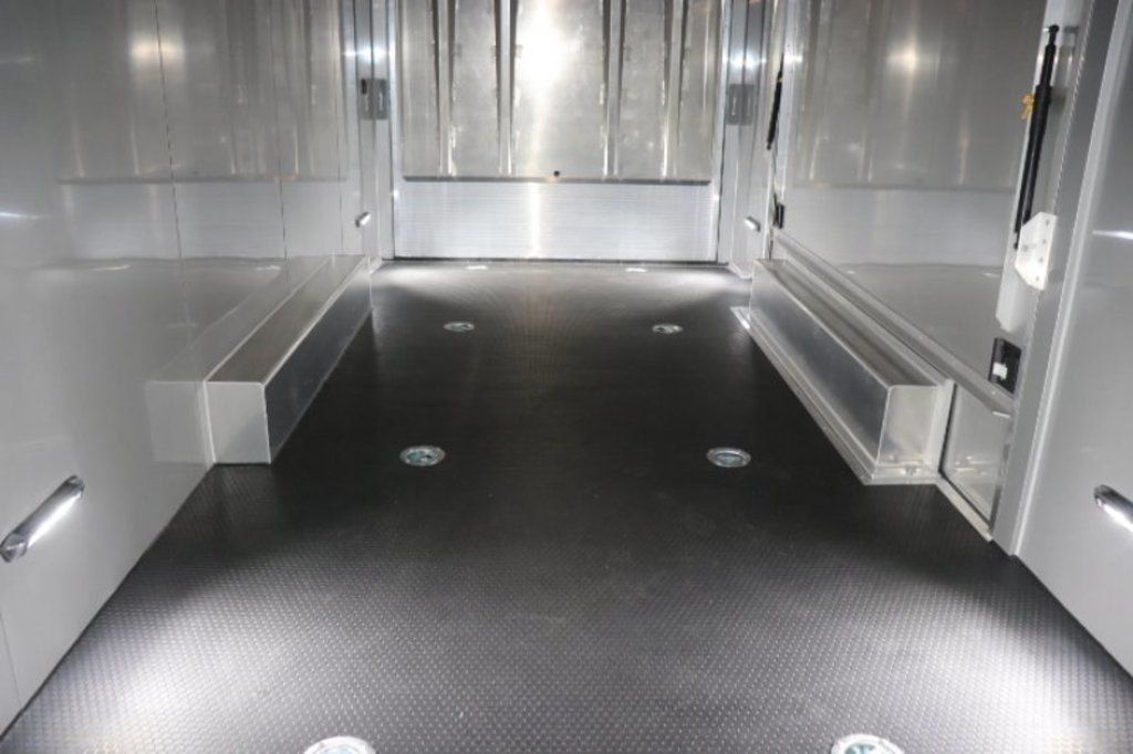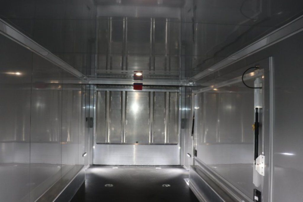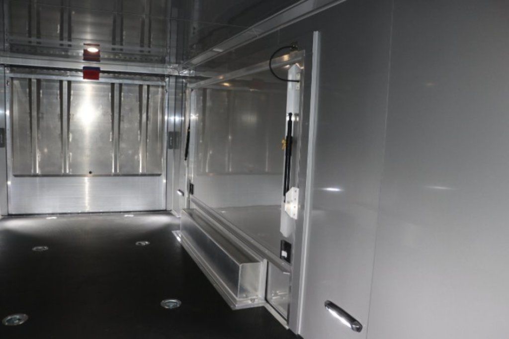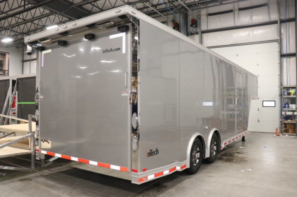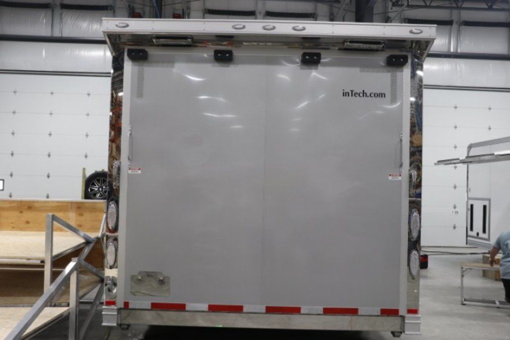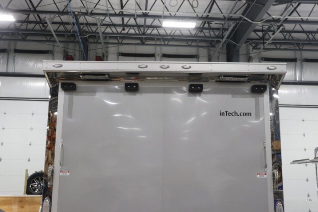 This is an example of a prior sold unit. We'd be happy to order you a duplicate of this trailer. Please inquire about lead times for custom ordered inTech Trailers.- Dual Post Hydraulic Landing Gear- Spare Tire Storage in Riser Compartment- Full Access Escape Door 10'x6'- Lighted Grab Handle- Stainless Steel Paddle Latches- 5' Aluminum Ramp Extension- 12V Deep Cycle Battery- 2 - in floor battery compartments- Upgrade to Panelite Clearance & Tail Lights- Panelite Brake Lights- Side Mount LED Turn Signals- 6 - 12V Surface Mount LED 13" Tie Down Lights- Extruded Aluminum Ramp- Black Coin Floor- Screwless Aluminum Walls & Ceiling- 4 - 5000# D-Rings in bunk- 10 - 6000# Swivel D-Rings in floor- Upgrade to Polished Cast Corners w/ Mirror Finish Stainless Steel Vertical and Radius- Mirror Finish Stainless Steel Rear Header and Post- Lowered Side Skirt w/ Reverse Beavertail Design- Color Matched Rear Spoiler