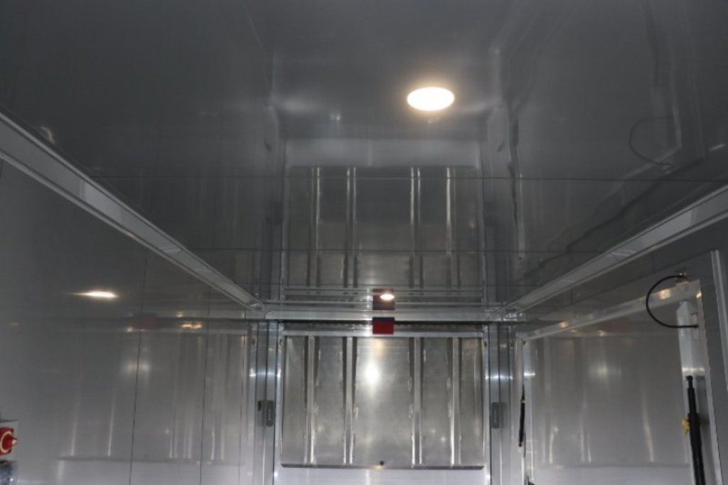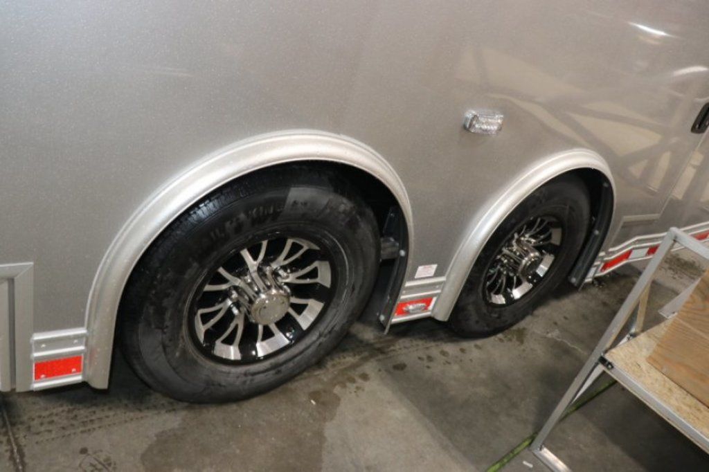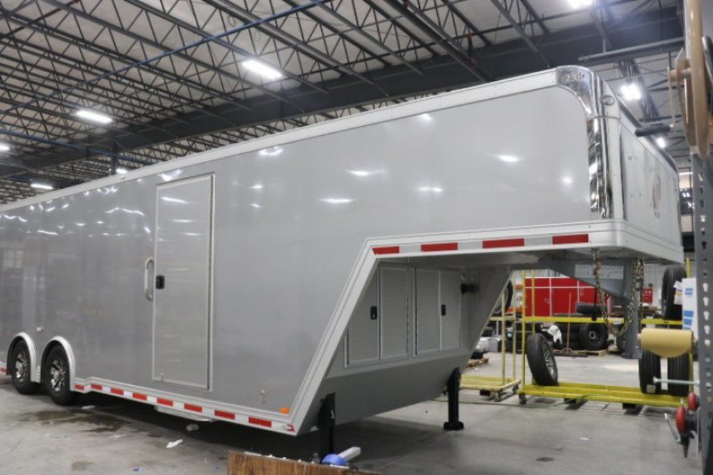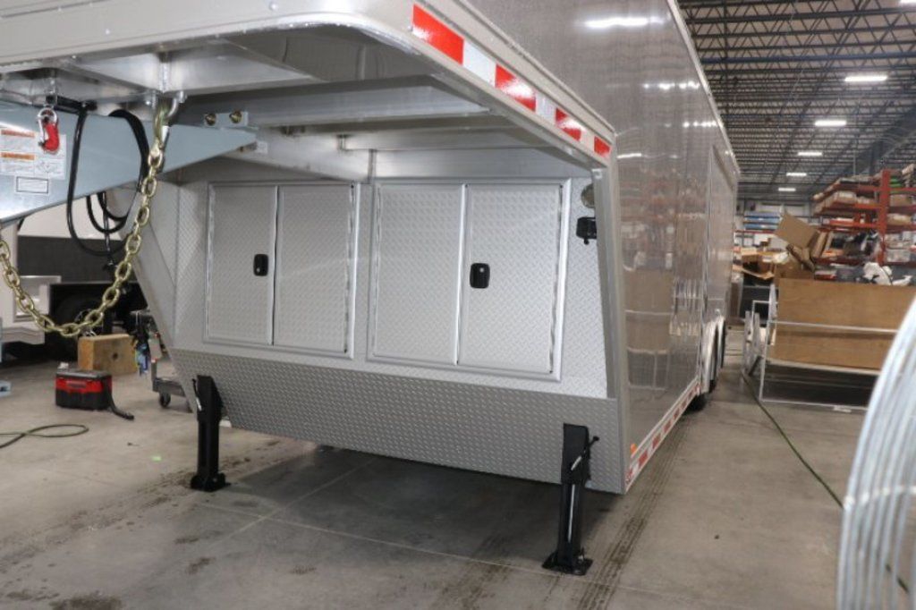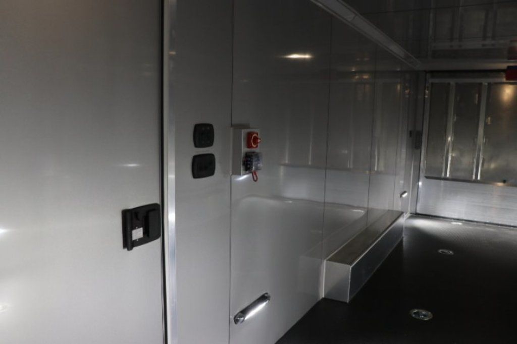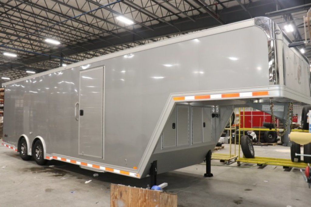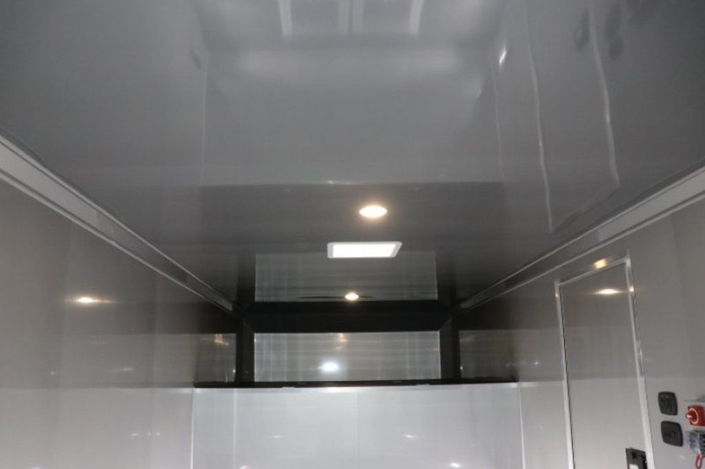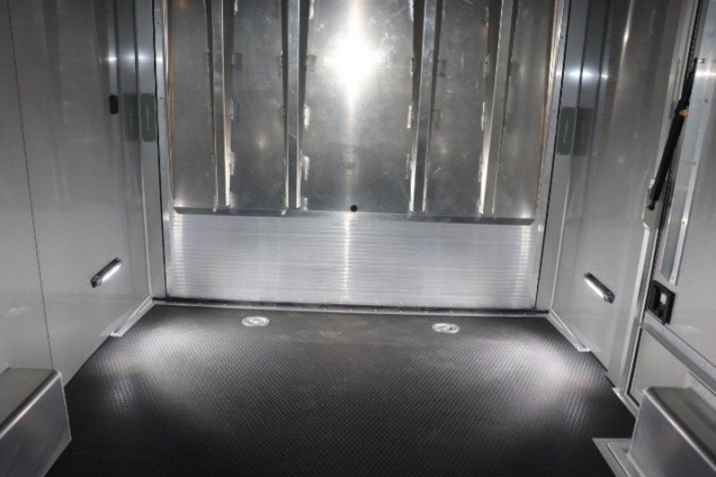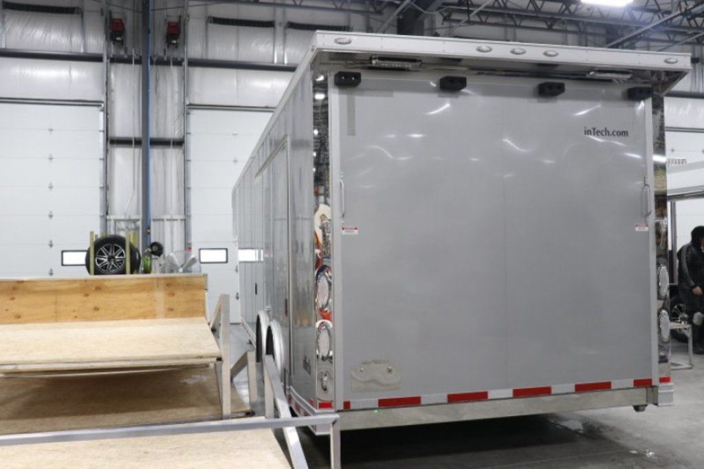 This is an example of a prior sold unit. We'd be happy to order you a duplicate of this trailer. Please inquire about lead times for custom ordered inTech Trailers.- Dual Post Hydraulic Landing Gear- Spare Tire Storage in Riser Compartment- Full Access Escape Door 10'x6'- Lighted Grab Handle- Stainless Steel Paddle Latches- 5' Aluminum Ramp Extension- 12V Deep Cycle Battery- 2 - in floor battery compartments- Upgrade to Panelite Clearance & Tail Lights- Panelite Brake Lights- Side Mount LED Turn Signals- 6 - 12V Surface Mount LED 13" Tie Down Lights- Extruded Aluminum Ramp- Black Coin Floor- Screwless Aluminum Walls & Ceiling- 4 - 5000# D-Rings in bunk- 10 - 6000# Swivel D-Rings in floor- Upgrade to Polished Cast Corners w/ Mirror Finish Stainless Steel Vertical and Radius- Mirror Finish Stainless Steel Rear Header and Post- Lowered Side Skirt w/ Reverse Beavertail Design- Color Matched Rear Spoiler