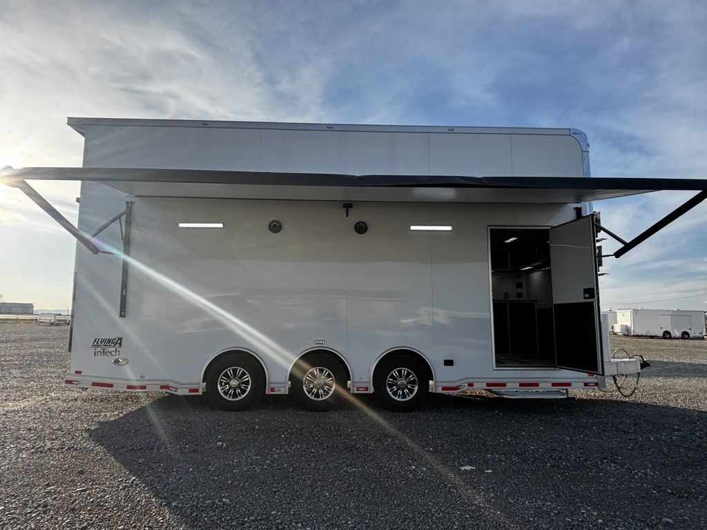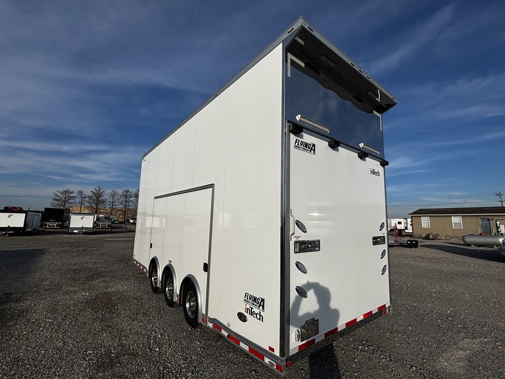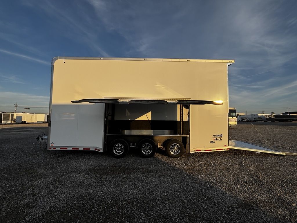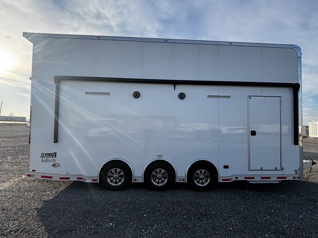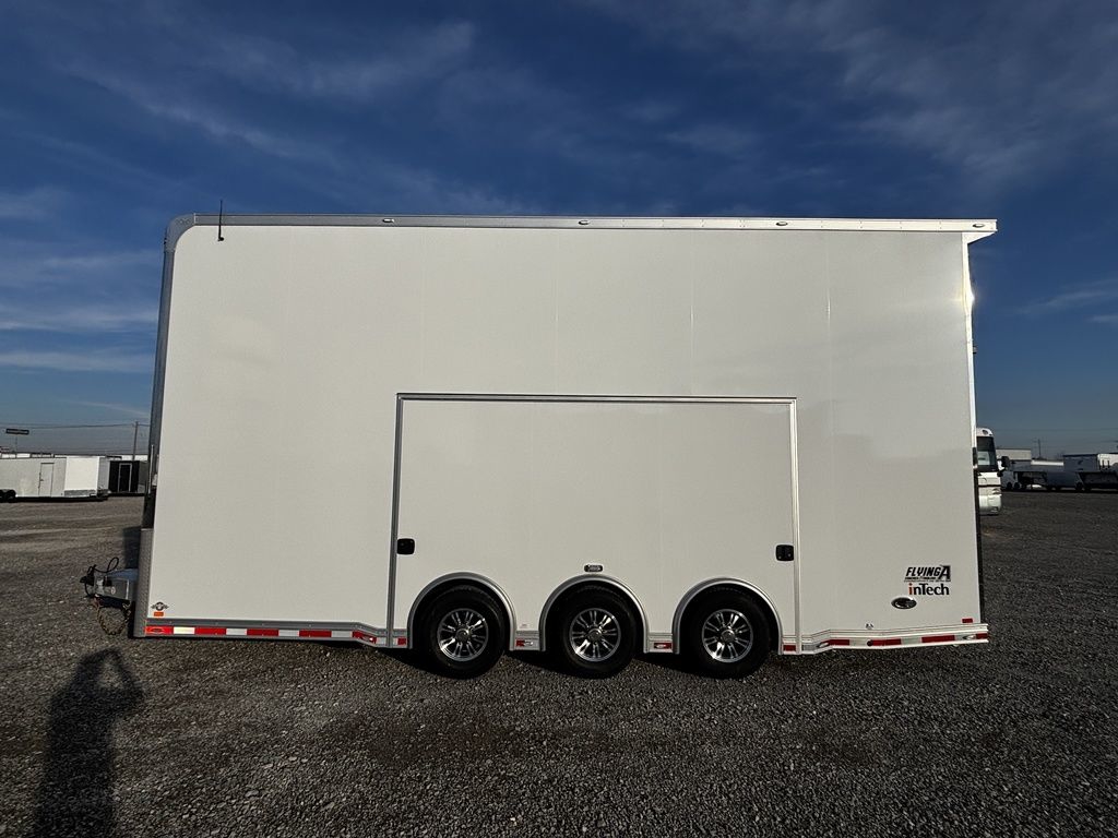 2026 24' inTech WIDE BODY Custom Stacker Trailer. Featuring Full Access Escape Door, 14' Tilting Lift, 11'4" Int Height, 4' Ramp Extension and more. Call today. 903-482-9335 >Features: 97.5" Rear Ramp Door Opening - 102" Wide Body Triple 6K Axles 11' 4" Int Height .050 Screwless/Rivetless Aluminum Exterior - White .030 Screwless/Rivetless Aluminum Interior -White Extruded Aluminum Floor, Ramp, & 4' Ramp Extension Full Access Escape Door w/Removeable Wheelbox 14' EZ-Load Tilting Lift w/Removable Center Lift Panels & Blue/White LED Light Strip Kit Under Lift Underside of Lift Finished w/ Aluminum, Treadplate Finish on Lift Surface In Floor Hydraulic Lift Pump, Rear Manual Stabilizer Jacks, & 32" Removable Lift Ramps w/ Wall Storage In Floor Battery Compartment Awning - 21' w/ Weathershield - 12V Power Awning Premium Cabinets -Black L- Shaped Upper Cabinets w/Top Hinged Doors Base Cabinet R/S Under Attic Light Duty Attic w/Matching Flooring - Rated at 40 Lbs/Sq Ft Up to Maximum of 2500 lbs 66" Deep Attic / 51.5" Attic to Ceiling / 80" Main Floor to Attic 34" Carpet Wainscot Wall Mounted Airline Track Tie- Down Front Wall & C/S Wall 3 Rows Airline Track Tie-Down on Main Floor & 4 -D-Rings 2 Rows Airline Track Tie-Down on Lift & 4 D-Rings 2 Rows Airline Track Tie-Down on Attic 30Amp Electrical & LED Lights LED Scene Lights Above Rear Ramp Door LED Scene Lights Under Awning C/S Insulated Ceiling 36" Side Entry Door w/Aluminum Slide Out Step Stereo w/Int & Ext Speakers Aluminum Wheels Wall Mounted Spare Wheel & Tire Lowered Skirt w/ Reverse Beavertail Design Color Matched Tongue Storage Box w/Front Double Doors Weight Distribution Prep Hydraulic Front Jack HD Rear Ramp Door w/Recessed Stainless Steel Latches Color Matched Rear Spoiler Stainless Steel Rear Header & Posts Stainless Steel Front Verticals & Radius 36" ATP Wraparound Style Stoneguard Rear Caster Wheels 83.5" Between Wheel Wells 98" W X 96" H Rear Ramp Door Give us a call to learn more and reserve today. 903-482-9335 travis@flyingamotorsports.com Financing and Delivery available. "WE ARE RACERS LIKE YOU" Flying A Motorsports The # 1 Intech Dealer Leading the Motorsports Transportation Industry - Since 1988