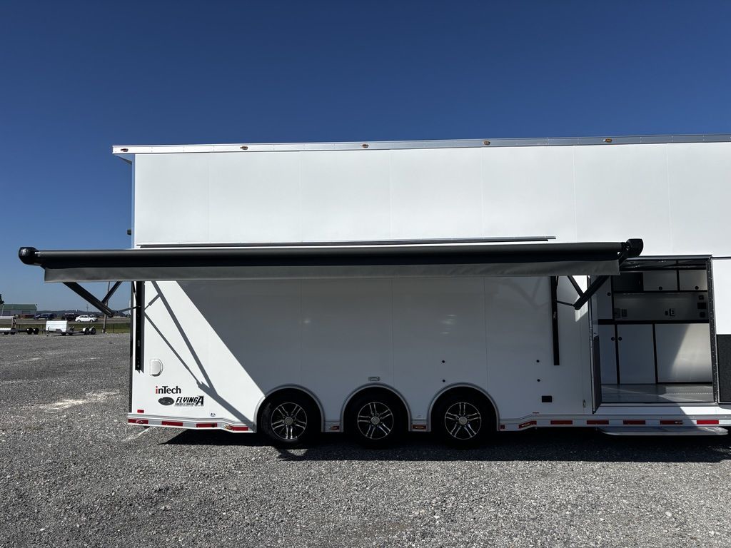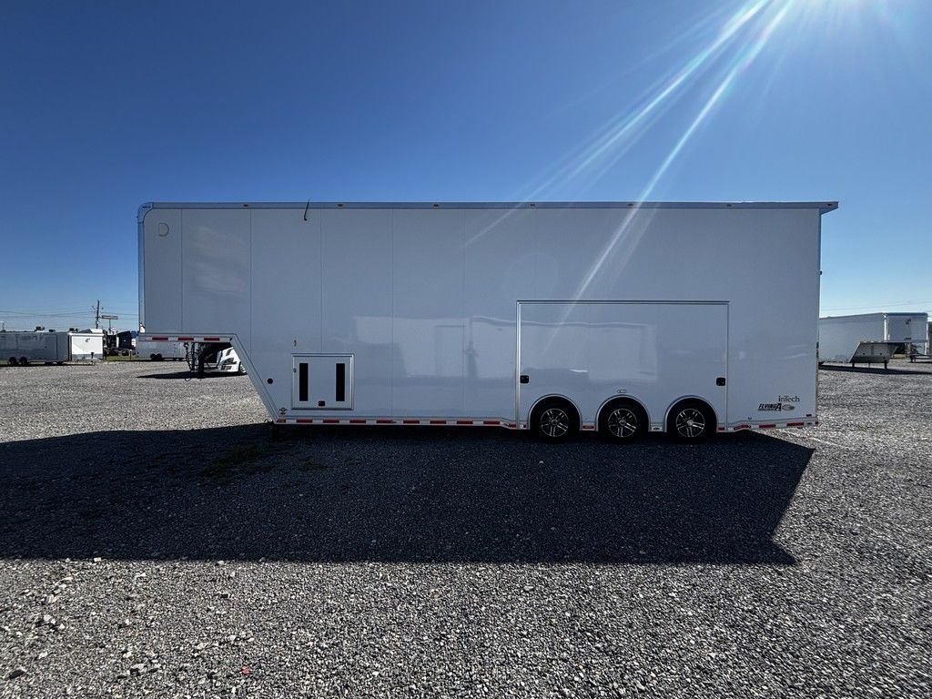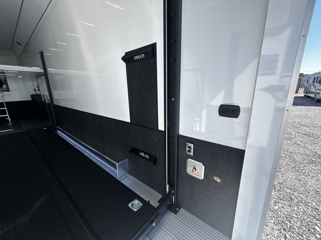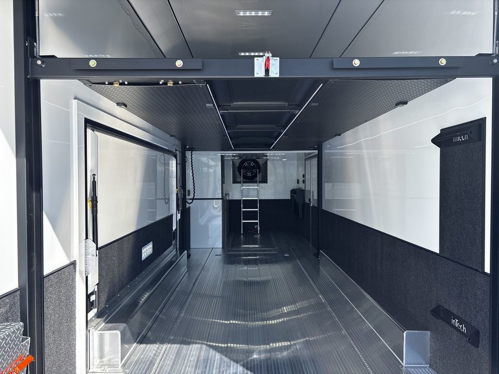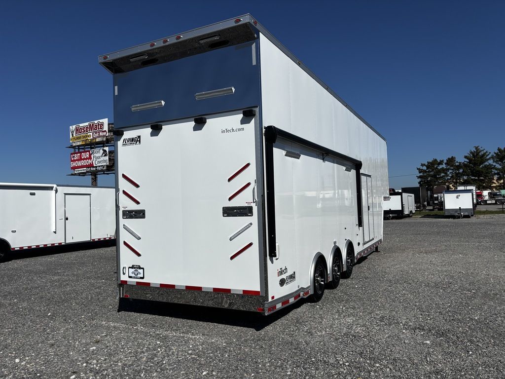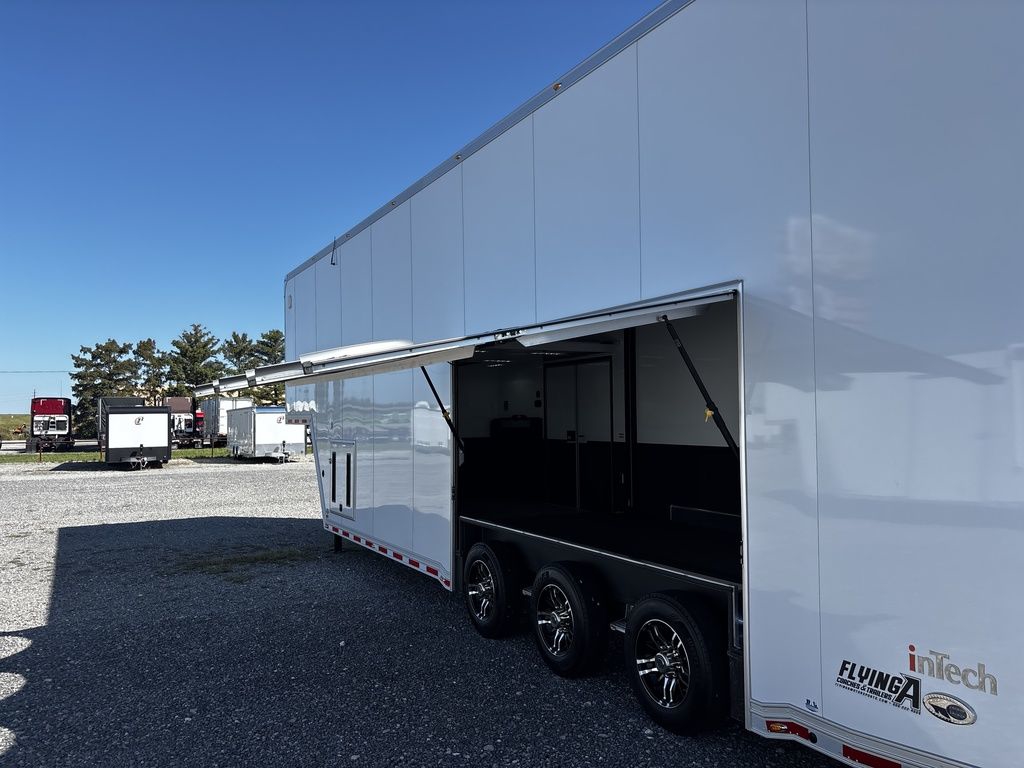 2026 38' Intech Stacker WIDE BODY Trailer with Escape Door, 16' Lift, Black Interior Trim, Premium Cabinets and more. Call today. 214-807-1008 *ON ORDER photos of similar trailer, options and selections may vary. Features: 97.5" Rear Ramp Door Opening - 102" Wide Body Triple 7K Axles 11' 4" Int Height .050 Screwless/Rivetless Aluminum Exterior - White .030 Screwless/Rivetless Aluminum Interior -White Extruded Aluminum Floor, Ramp, & 4' Ramp Extension Triple Axle Full Access Escape Door - 6' Tall w/Removeable Wheelbox 16' EZ-Load Tilting Lift w/Removable Center Lift Panels, Blue/White LED Light Strip Kit Under Lift In Floor Hydrualic Lift Pump, Rear Manual Stabilizer Jacks, 32" Removable Lift Ramps w/ Wall Storage, Black Treadplate Finish on Lift Surface Pulleys on Stacker Lift For Winch Operation on Lift 5000# Winch w/Wireless Remote & Synthetic Rope Bunk Riser Wall Winch Prep w/ Fairlead Premium Cabinets - Silver Frost 1/2 Closet Cabinet w/Shelf & Hanging Bar Upper Cabinets w/Top Hinged Doors Above Workbench Base Cabinet R/S 48" Flip Up/Removable Workbench w/Int & Ext Mounting Locations 52" Bunk w/Removable Ladder for Access HD Attic w/Aluminum Transition Flap from Attic to Lift (Rated at 55 Lbs/Sq Ft Up to Maximum of 4000 lbs) (224" Overall Length/ 56" Attic to Ceiling / 75" Main Floor to Attic) 60" Double Side Entry Doors w/Aluminum Slide Out Step Black Anodized Interior Package - Interior Door Trim, Cabinet Trim, J-Rail on Cove, J-Rail on Bottom of Sidewall Metal, J-Rail on Spring Box, & J-Rail for Carpeted Areas Airline Full Prep Package - 1 Inlet - 3 Outlets Airline Track Tie-down on Main Floor Airline Track Tie-down on Lift 4 - D-Rings on Attic 4 - D-Rings on Lift 4 - D-Rings on Main Floor 18" Wide Tie Down Strap Hangers w/Carpet Behind Aluminum Wheels w/215/75R17.5 Tires Spare Wall Mounted Wheel & Tire Generator Prep w/ Premium Transfer Switch & Generator Compartment w/Slides for Future Portable Generator Fixed Shelf in Exterior GN Riser Compartment for Future Air Compressor 50Amp Electrical & LED Lights 2 Scene Lights C/S 2 Scene Lights Above Rear Ramp Door Insulated Ceiling Stereo w/Interior Speakers 34" Carpet Wainscot NO Beavertail Lowered Skirt w/ Reverse Beavertail Design HD Rear Ramp Door w/Recessed Stainless Steel Latches Stainless Steel Rear Header & Posts Color Matched Rear Spoiler Rear Caster Wheels & Skid Plates 98" W X 94" H Rear Ramp Door 83.5" Between Wheel Wells *ON ORDER photos of similar trailer, options and selections may vary. Give us a call to learn more and reserve today. 903-482-9335 travis@flyingamotorsports.com Financing and Delivery available. "RACERS JUST LIKE YOU" Flying A Motorsports Leading the Motorsports Transportation Industry - Since 1988