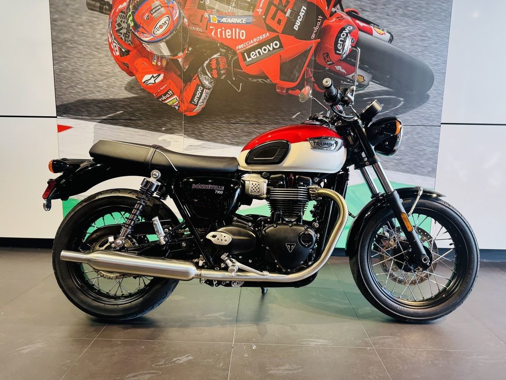 Price: $6,995.00 2022 Triumph Bonneville T100 Carnival RedFusion White Parallel Twin 900 Year: 2022 Model: Bonneville T100 Make: Triumph Condition: Used Contact Us Credit Application