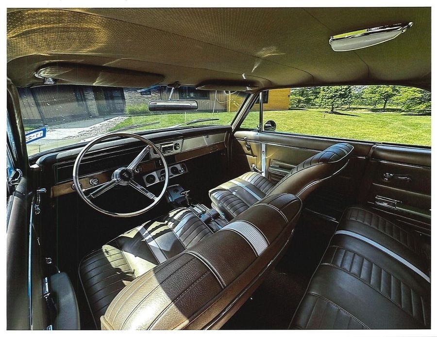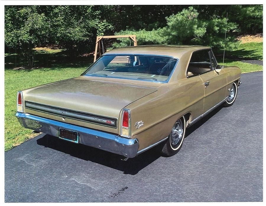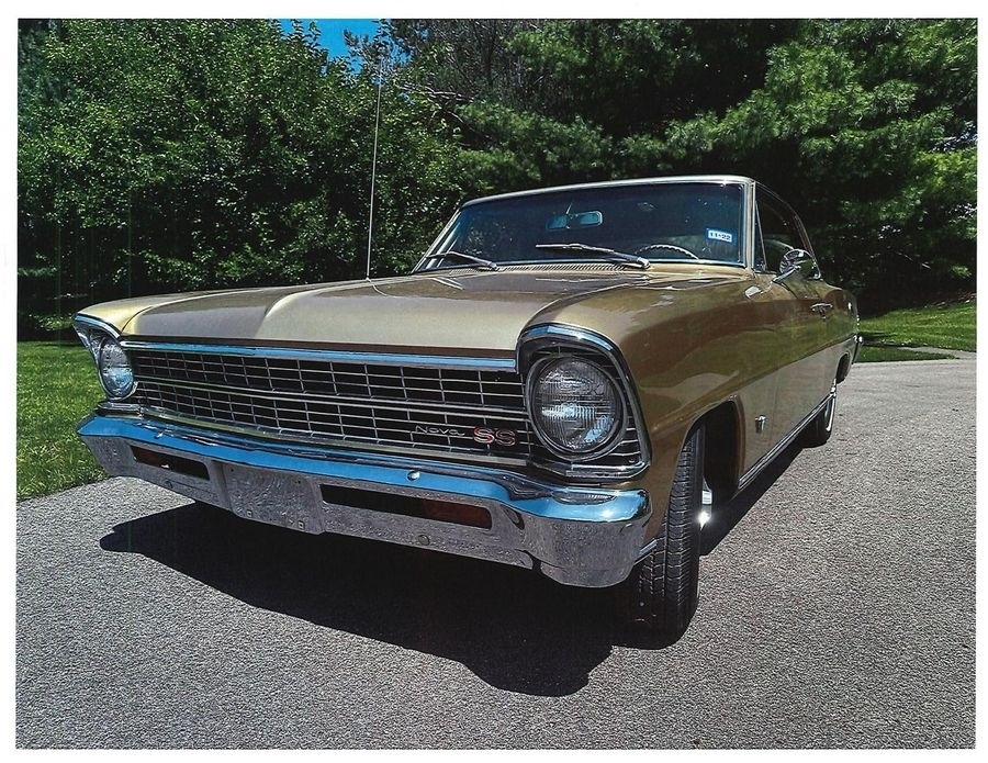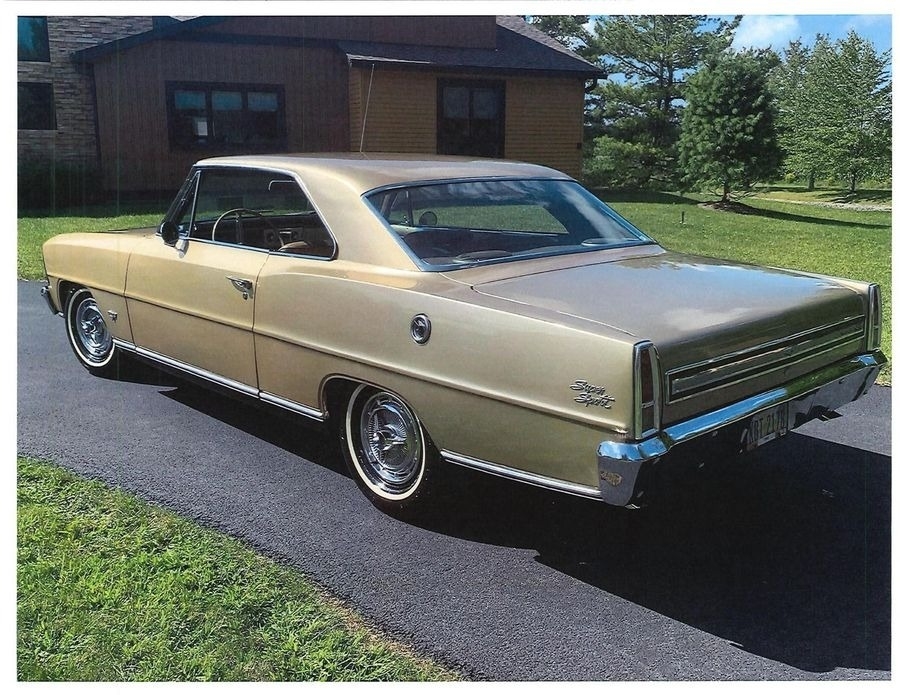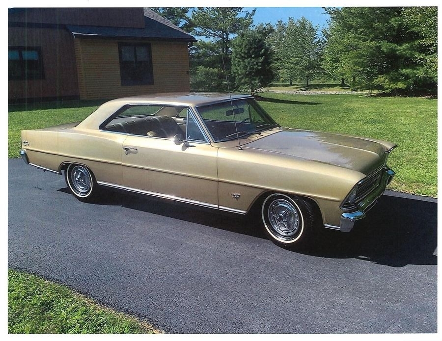 This 1967 Chevy Nova is powered by a 283cu/195hp V8 engine and a 2-speed power glide automatic transmission with 61,154 miles. Shown with Granada Gold exterior paint and factory gold interior.