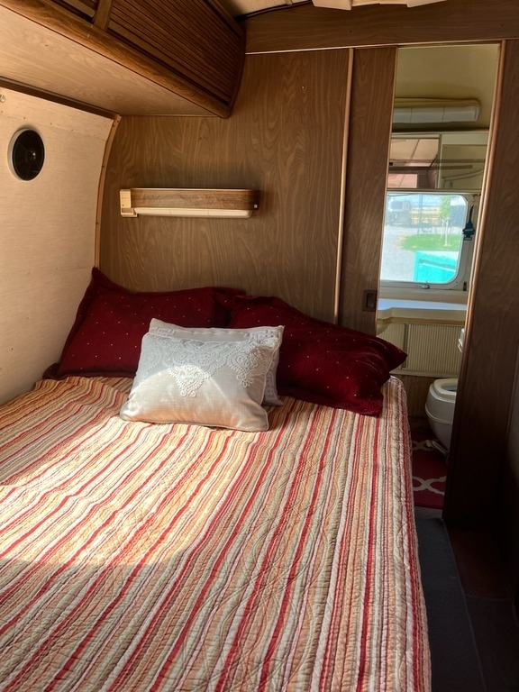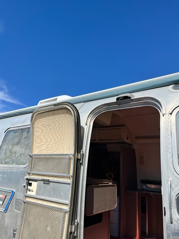 This Airstream has an overall length of 27 feet and comes equipped with 1 patio awning, 1 A/C unit, and plenty of room to sleep 4.