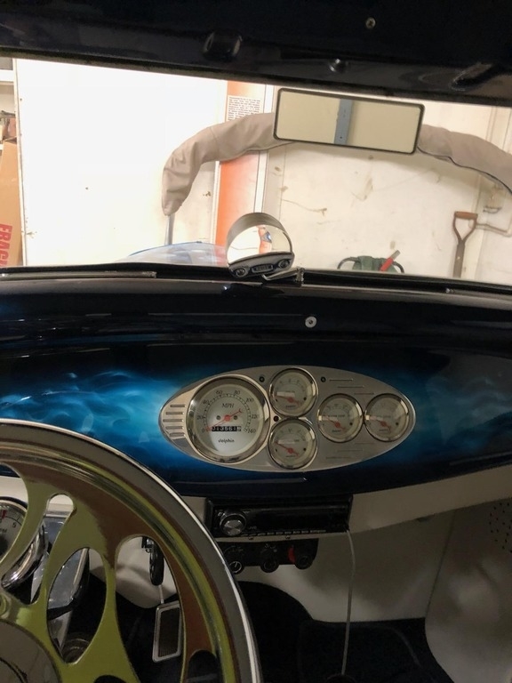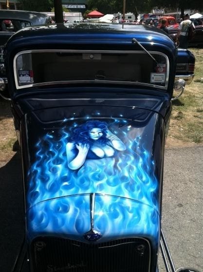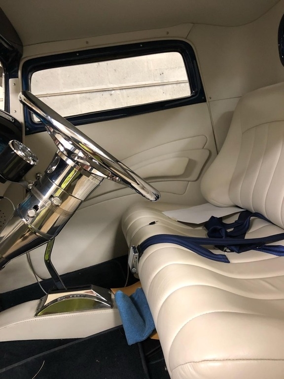 Hi-Boy is shown in a Blue with flames exterior with White European Leather interior.