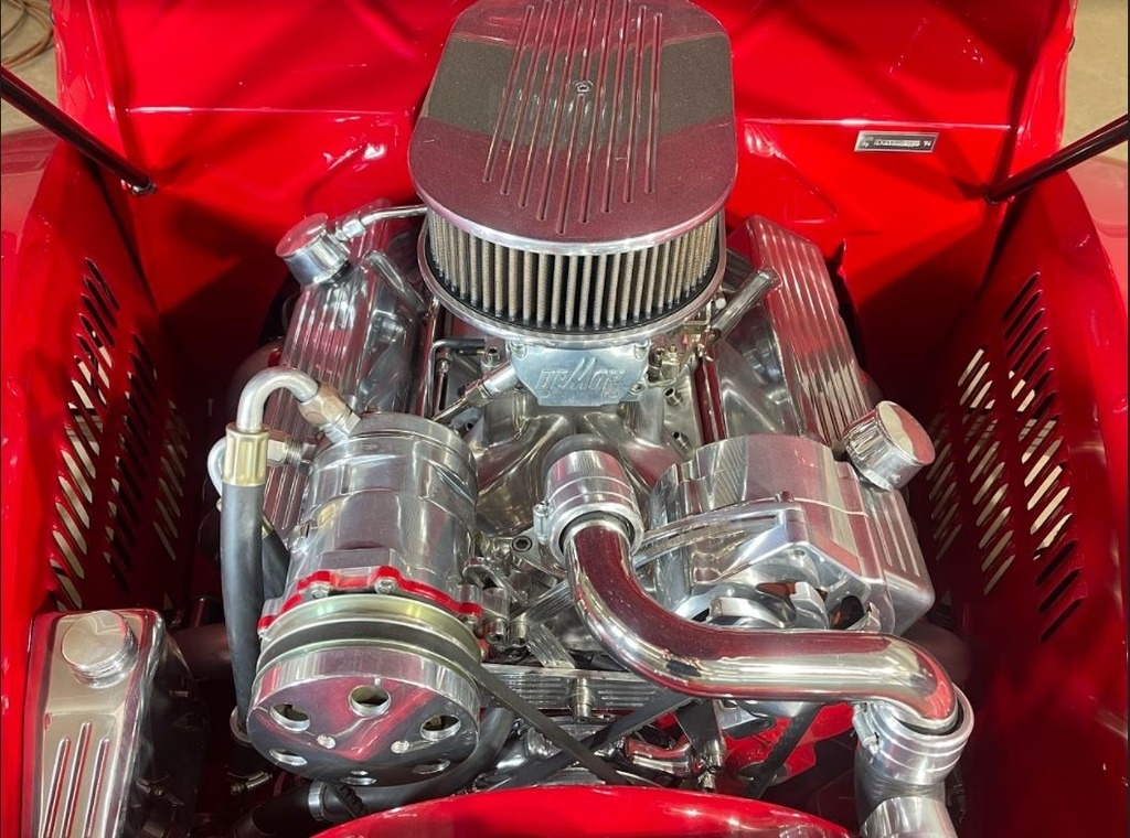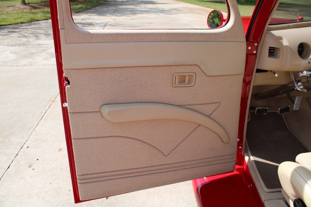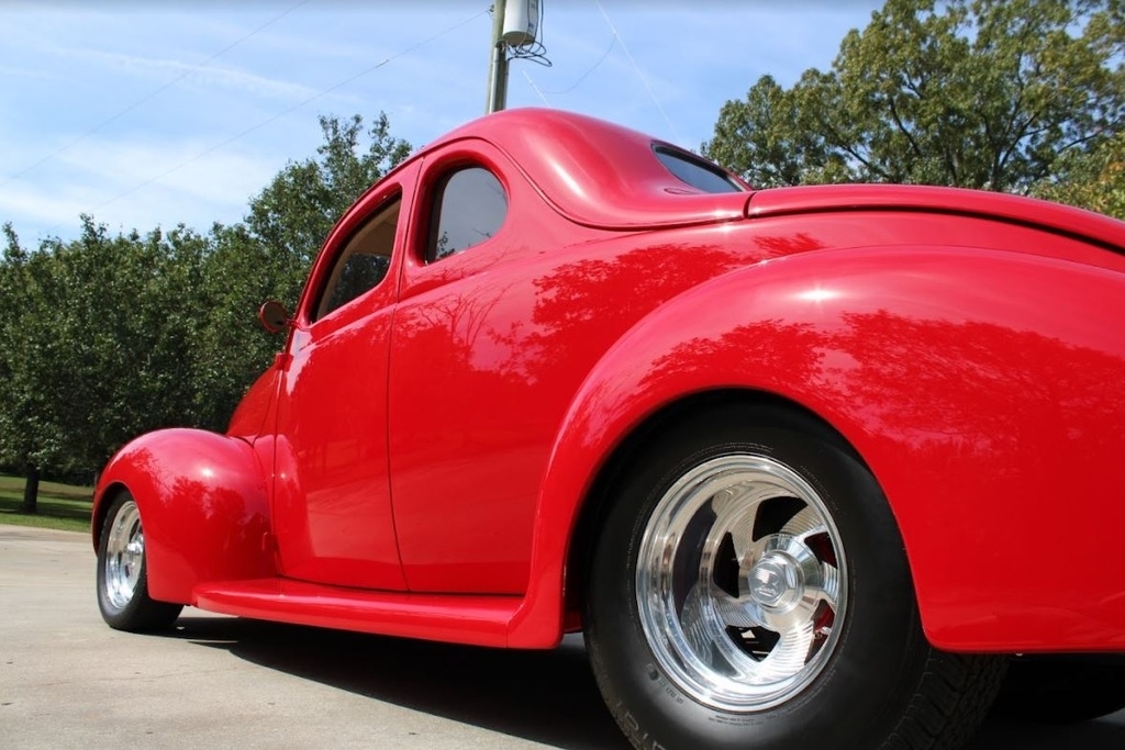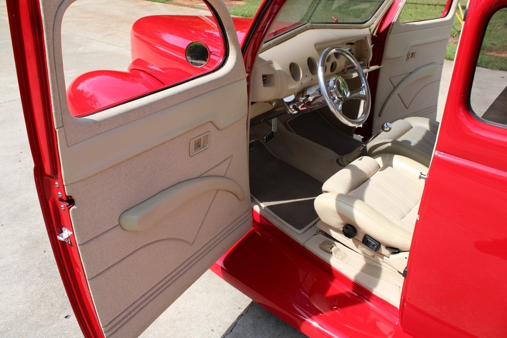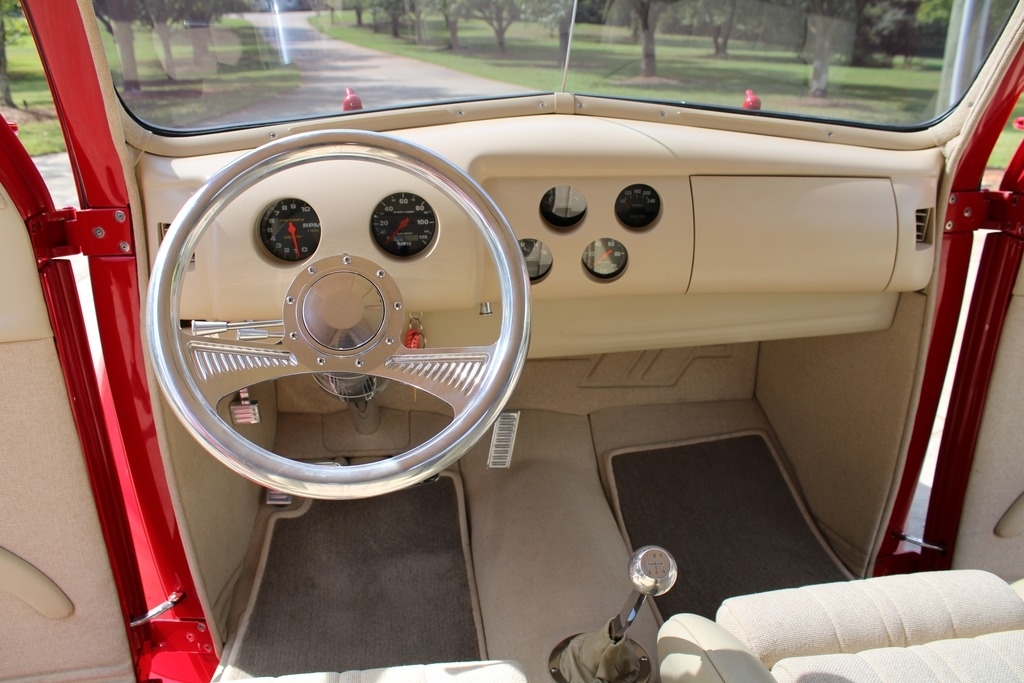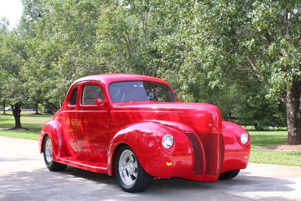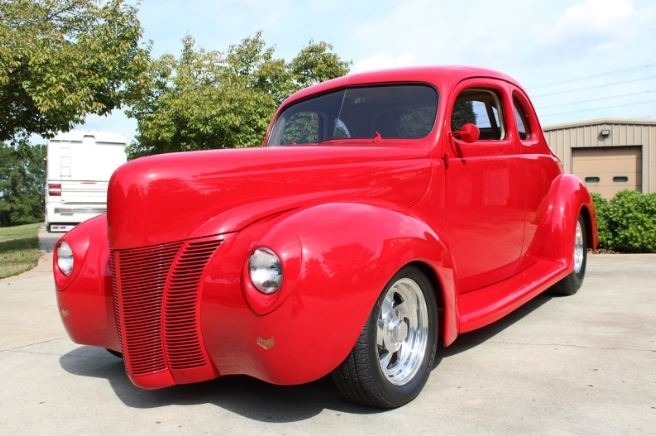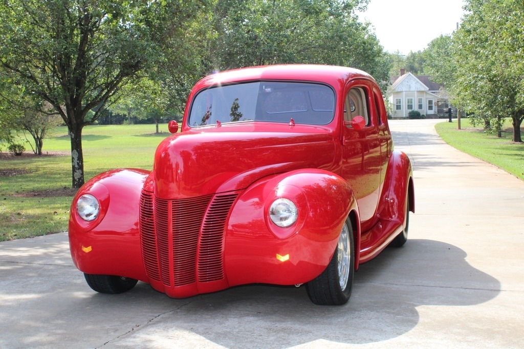 This beautiful 1940 Ford Deluxe is shown in a red exterior with Tan interior. It is powered by a 371 Stroker, V8 engine, paired with a Richmond Gear 5 speed manual transmission. This is a non-smoking vehicle that has always been garage kept.