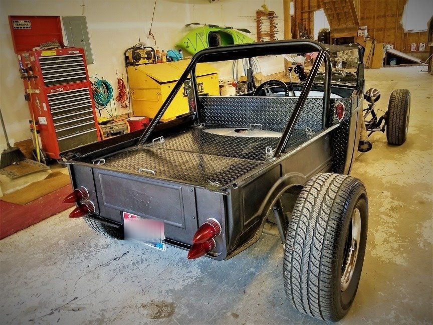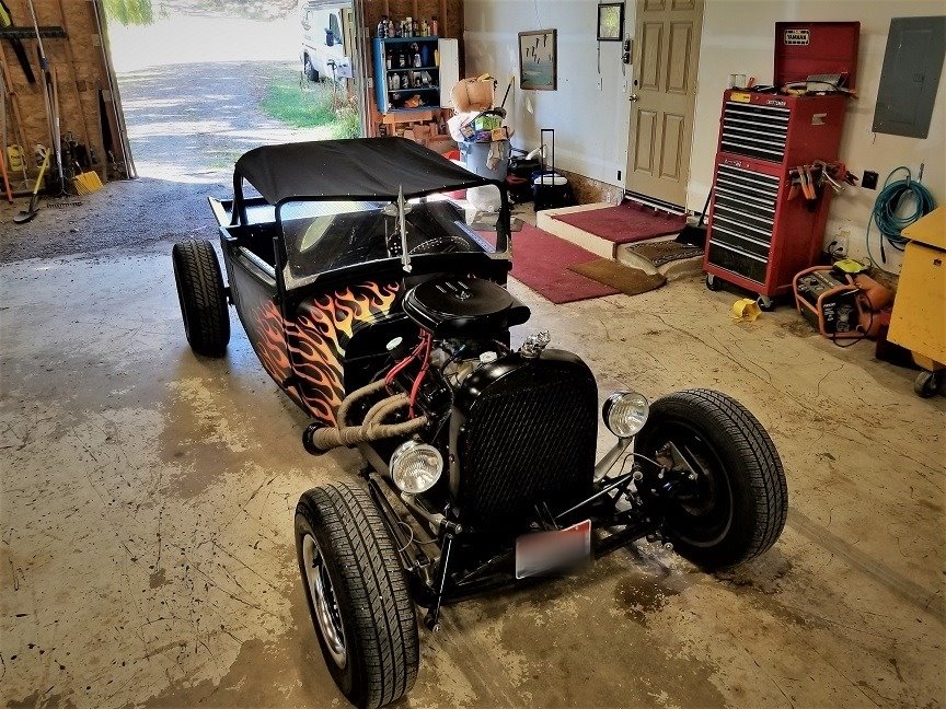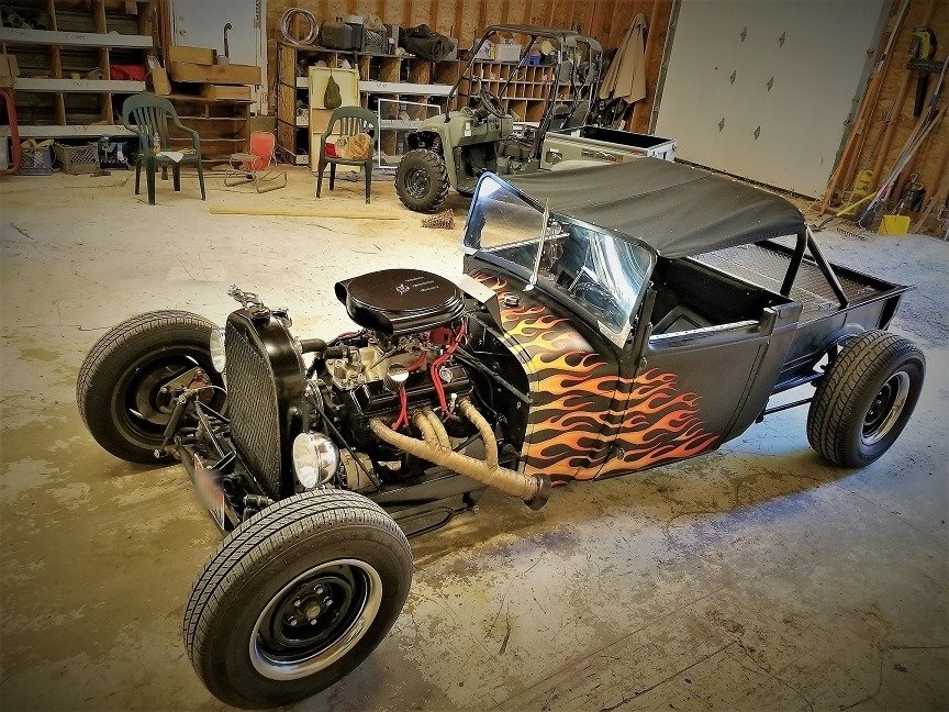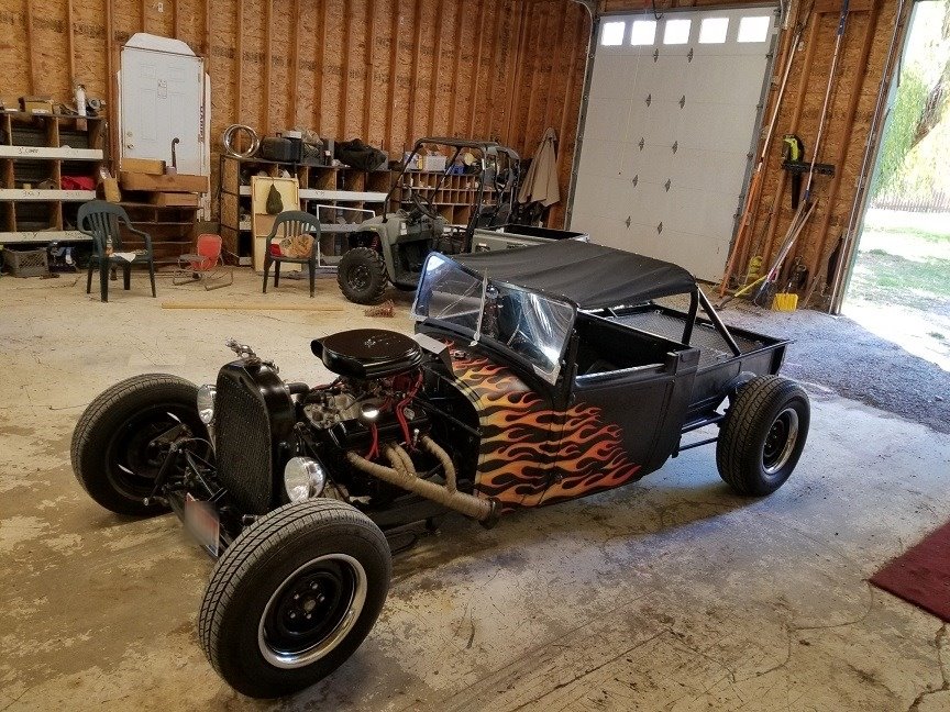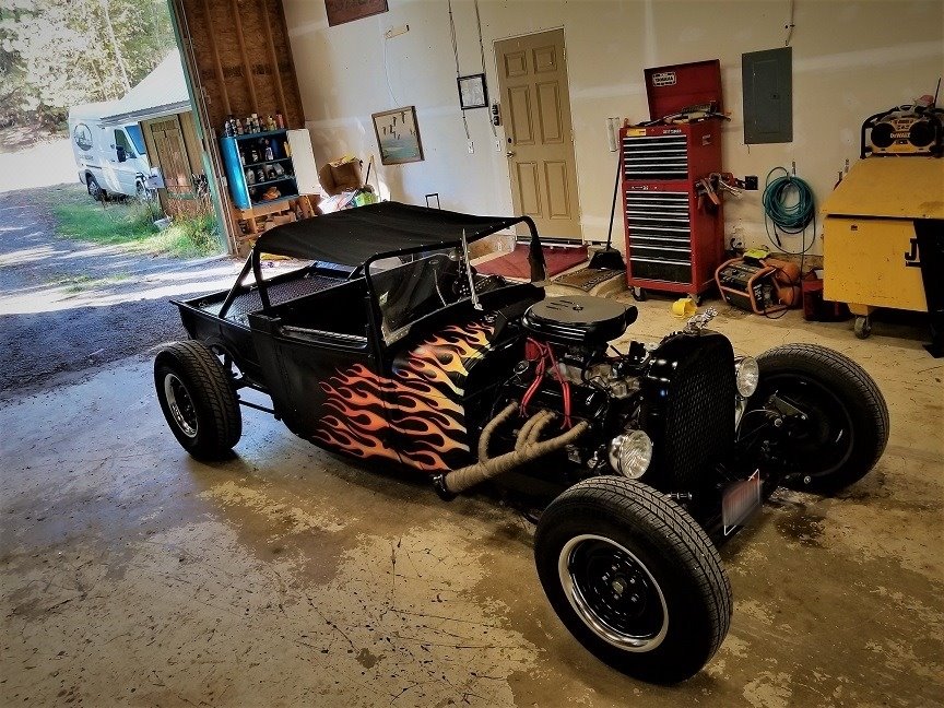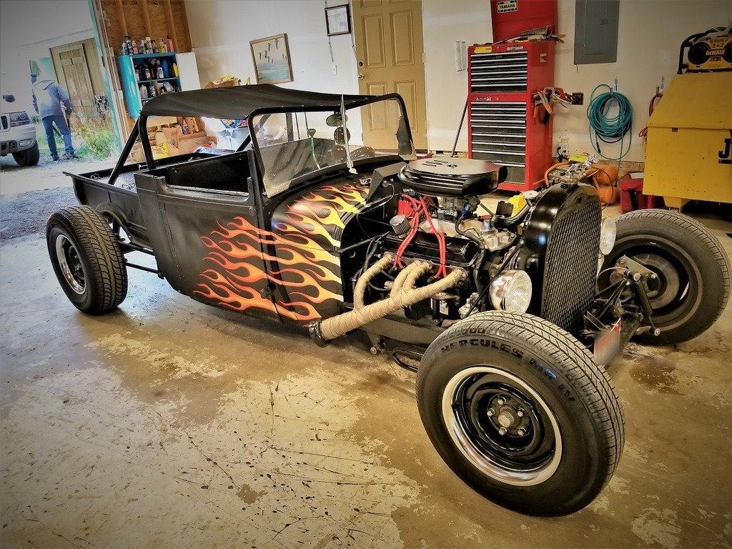 “1929 Roadster Pro built new 350 crate motor 350 trans Holley 500 carburetor fuel cell weight. Jack's roll bar, custom Dash and windshield, disc brakes all the way around. Camaro rear end clear title. ‘58 Caddie Taillights, King Bee headlights, custom trunk.”