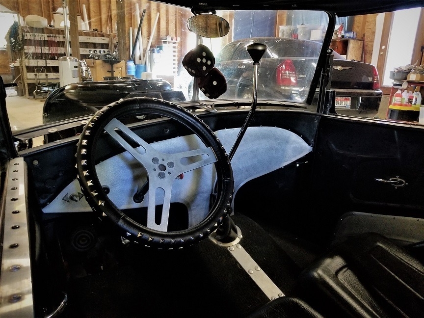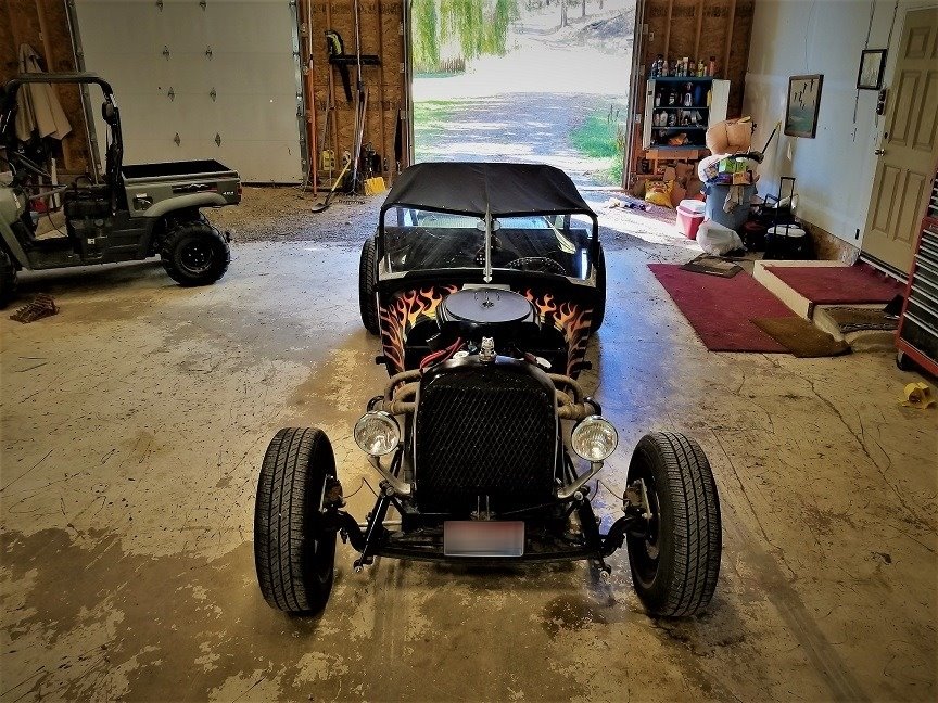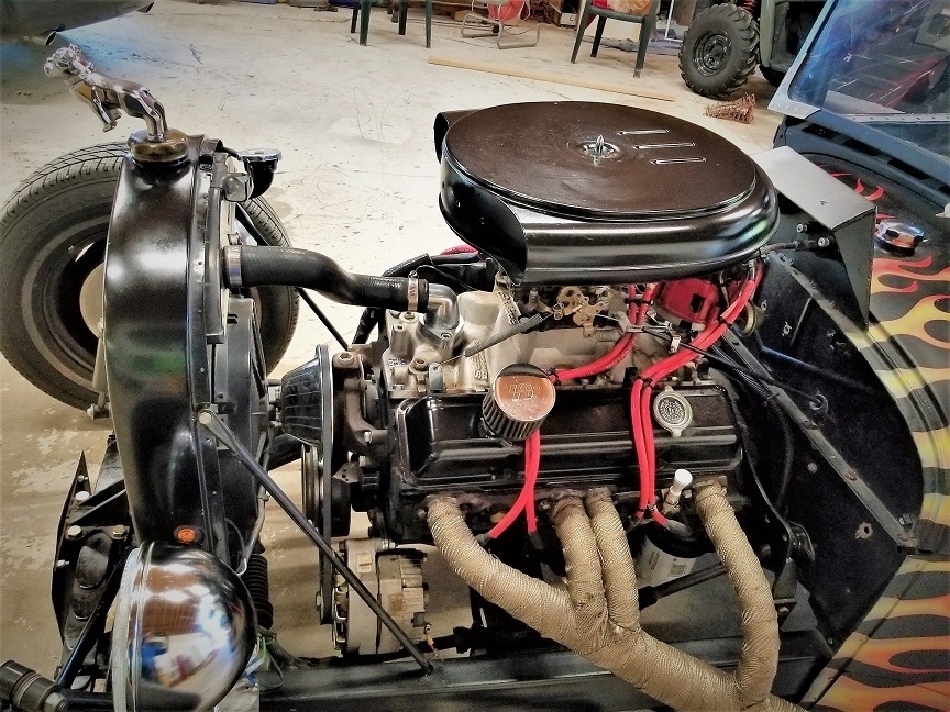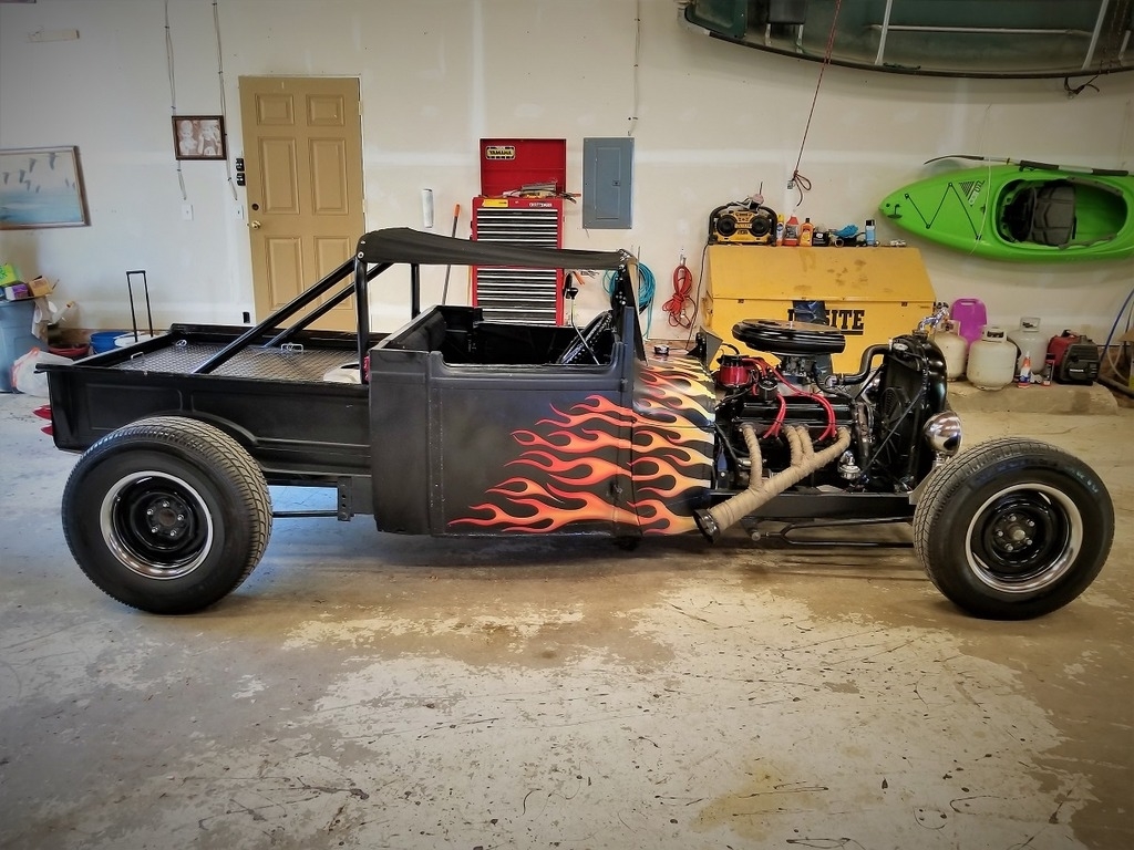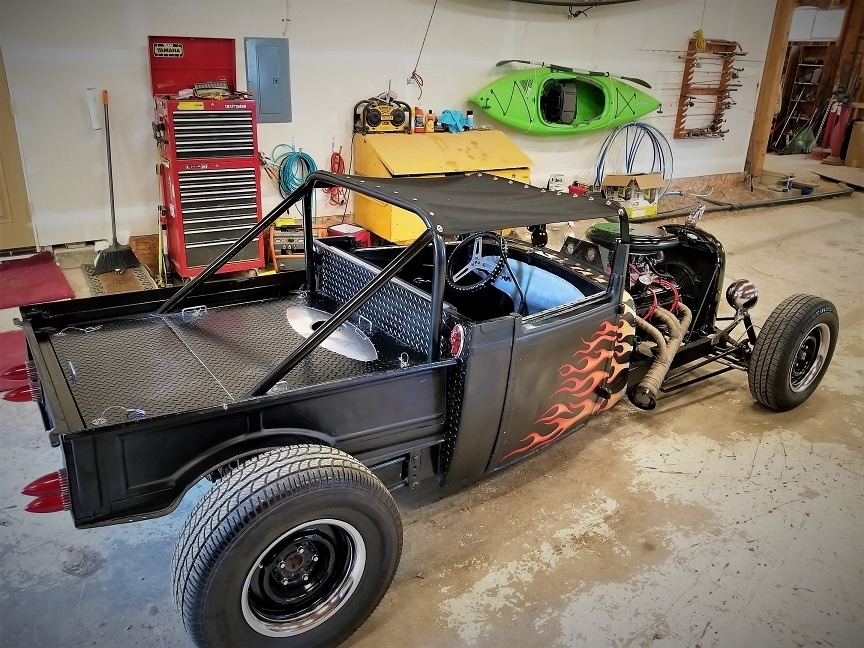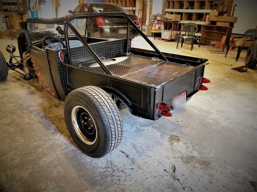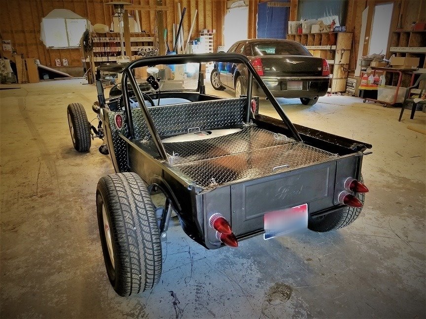 “1929 Roadster Pro built new 350 crate motor 350 trans Holley 500 carburetor fuel cell weight. Jack's roll bar, custom Dash and windshield, disc brakes all the way around. Camaro rear end clear title. ‘58 Caddie Taillights, King Bee headlights, custom trunk.”
