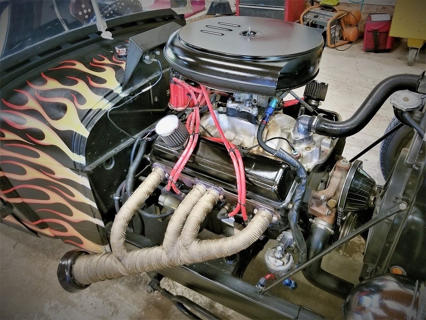This Roadster is powered by a 350 V8 engine paired with a automatic transmission and is shown with a black exterior with flames and a black interior. This vehicle has been well-maintained.