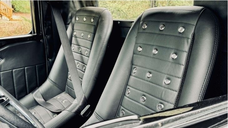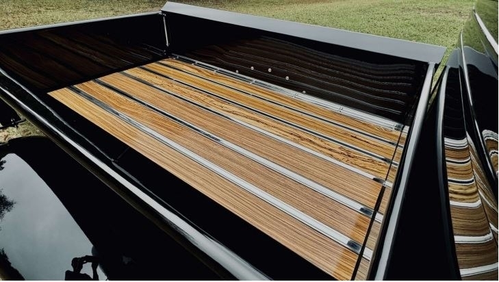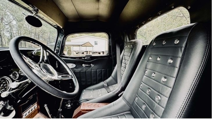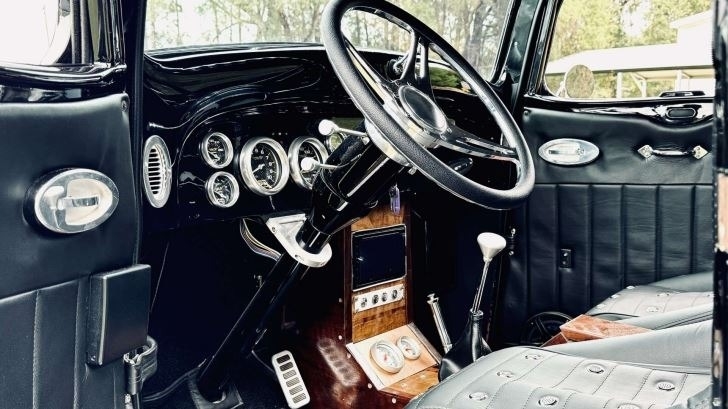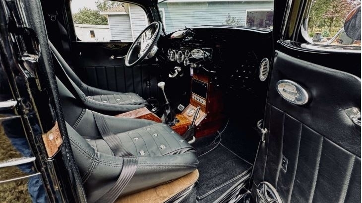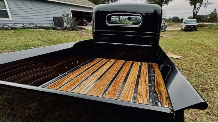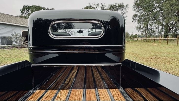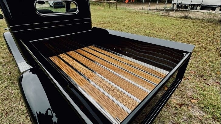 “Full custom chassis with triangular 4-link rear with 9” Ford 3.55 gear. 4-wheel disk brakes with separate vacuum pump. Flame River Rack and pinion Steering up front. Fuel cell with Holley electric fuel pump and dual fuel filters. 350 automatic transmission with 2400 stall. Truck center section all Steel with fiberglass fenders, with chopped top. Body was completely gone through any damaged metal was replaced with sheet metal. 383 Stroker with Holley Sniper, Edelbrock RPM Aluminum heads, Comp Cams hydraulic roller with roller rockers. Billet serpentine system with AC compressor and Alternator. Billet valve covers and Air cleaner. 3000 cfm Electric fan. Custom wood bed with Zebra Wood. Everything is a fresh build. Approximately 1,400 miles with 3,200 miles on odometer. All new custom interior with Walnut console.”