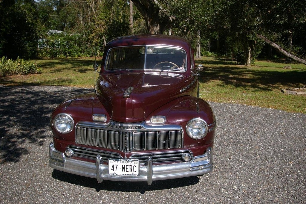 This 1947 Mercury Town Sedan is shown in a Maroon exterior with a Tan interior. It is powered by a 284ci V8 gas engine, paired with an automatic transmission. This is a non-smoking vehicle that has had no pets inside and has always been garage kept.