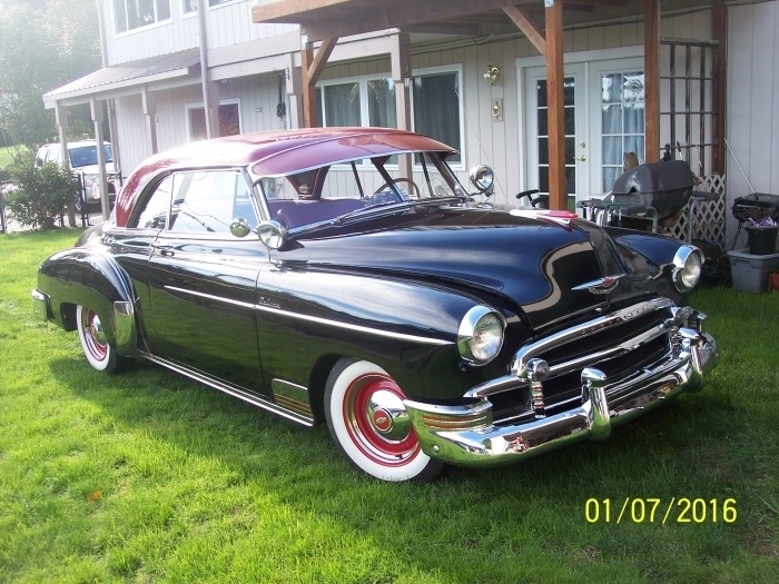 This 1950 Chevy Bel-Air is powered by a Wayne 235CI Gas Engine, paired with a 6-Speed Power Glide Automatic Transmission. This beauty is shown in Black/Red Exterior with a White/Red Interior and has been kept in a heated garage and is non-smoking.