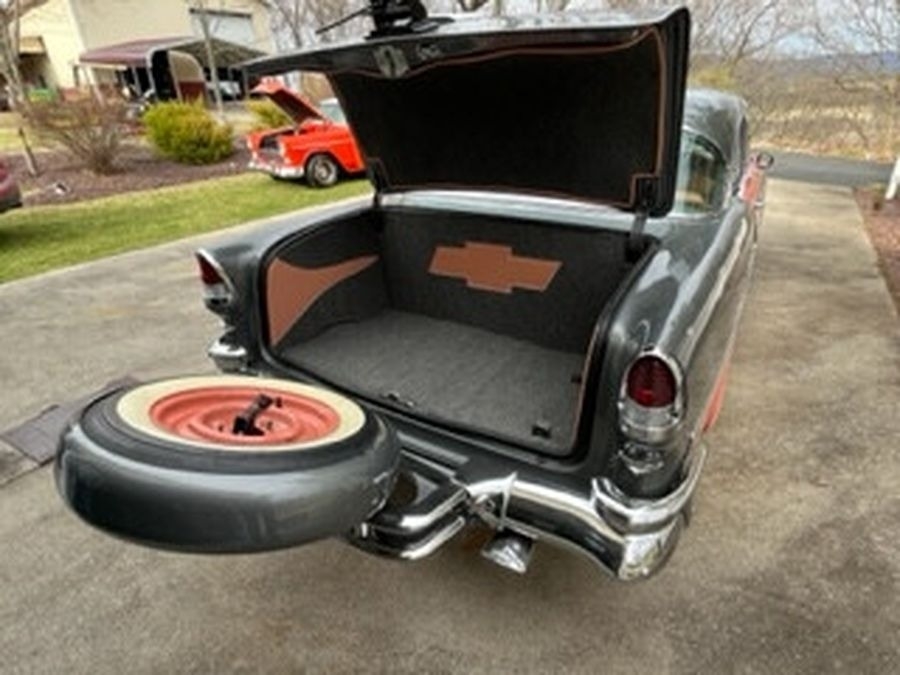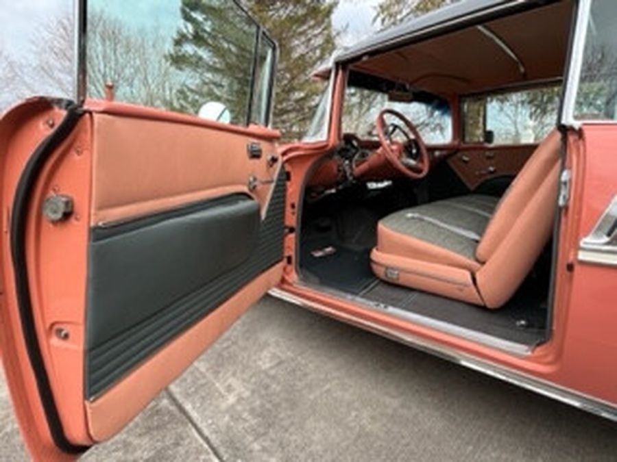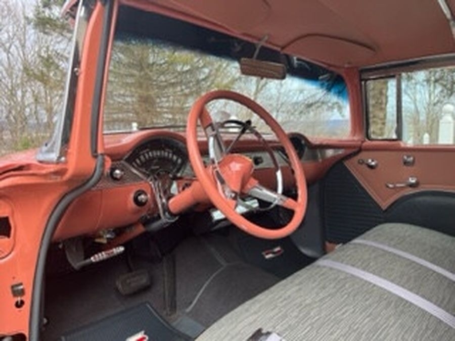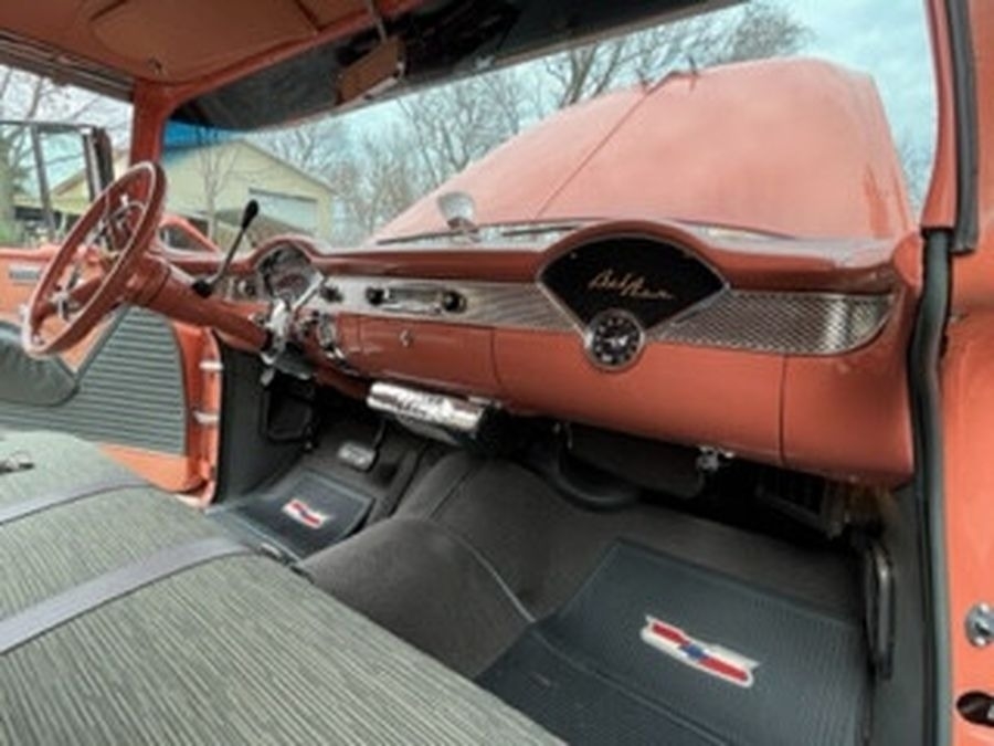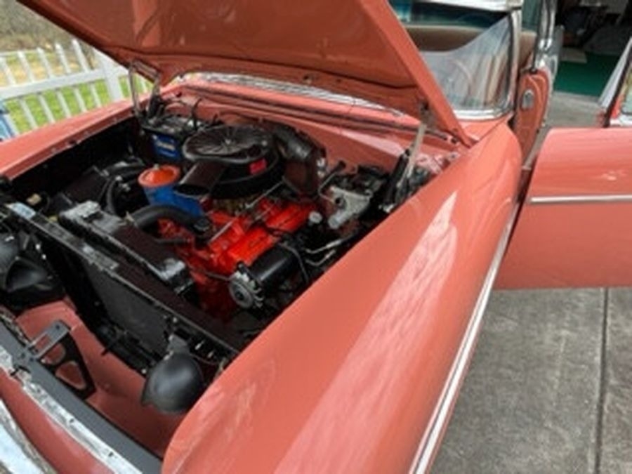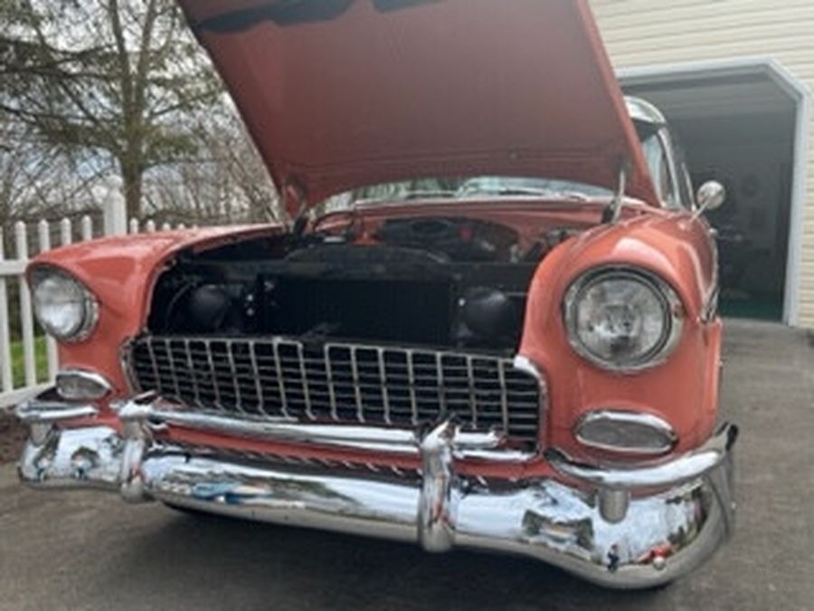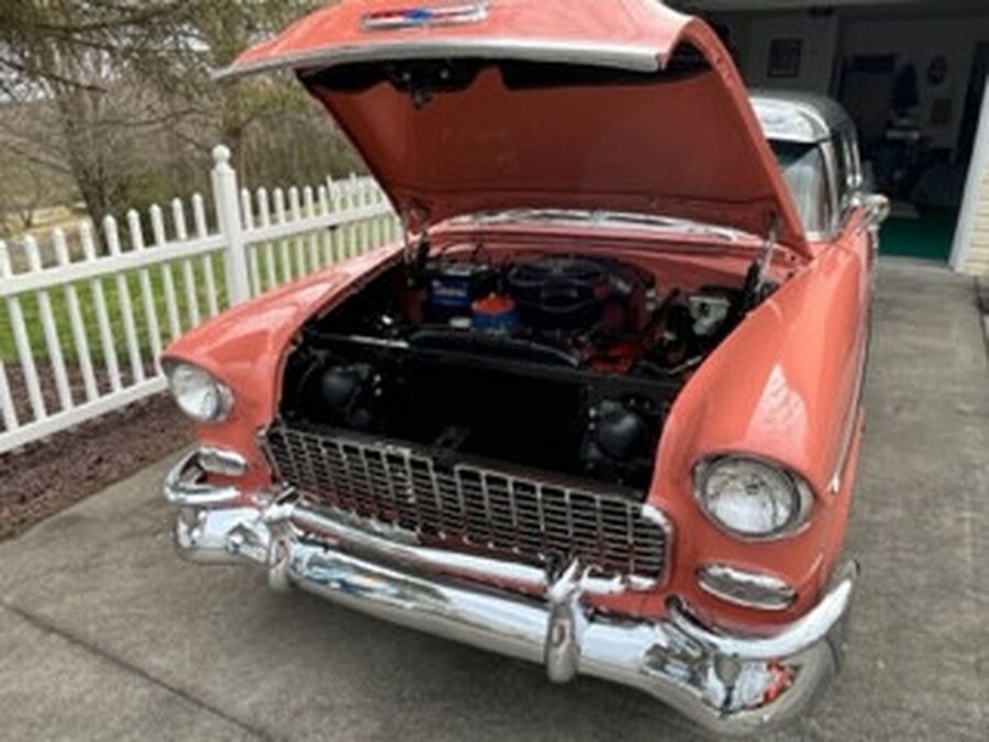 This 1955 Chrysler Bel Air is powered by a 265 V8 with Power Pack Gasoline Engine, paired with an Automatic Transmission. This Bel Air has a Salmon and Grey Exterior with a matching Interior. Garage Kept.