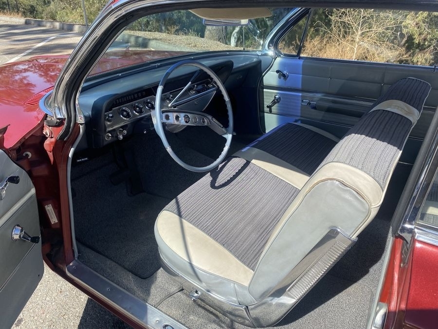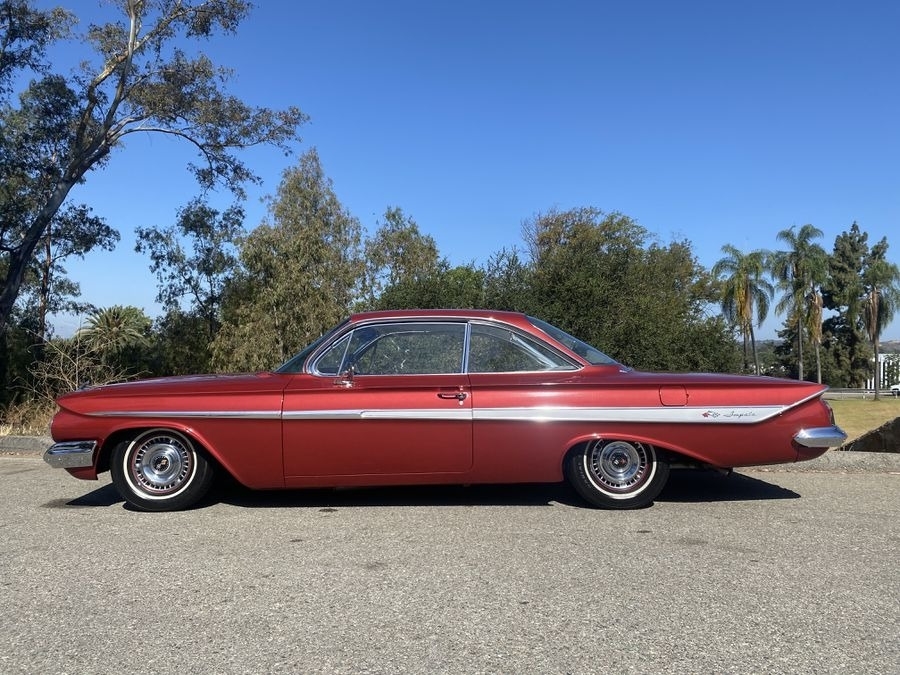 This 1961 Chevrolet Impala is powered by a 283 V8 gasoline engine paired with an Powerglide automatic transmission. This Chevy Impala is shown with a Hondura Maroon exterior and a gray interior. Original California Car its entire life. Built in the Los Angeles Van Nuys plant. Never been cut, it is only lowered but can easily be returned to stock. Clean California title, current registration.